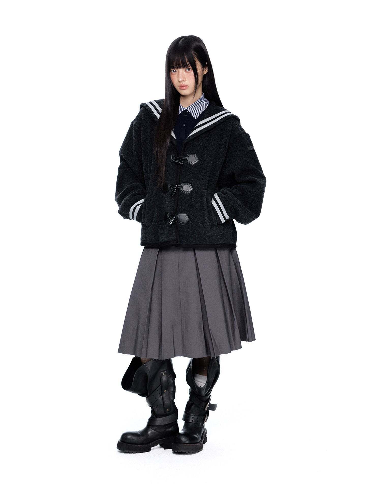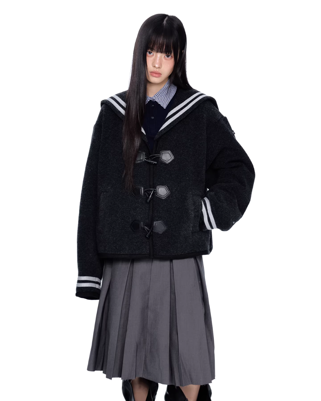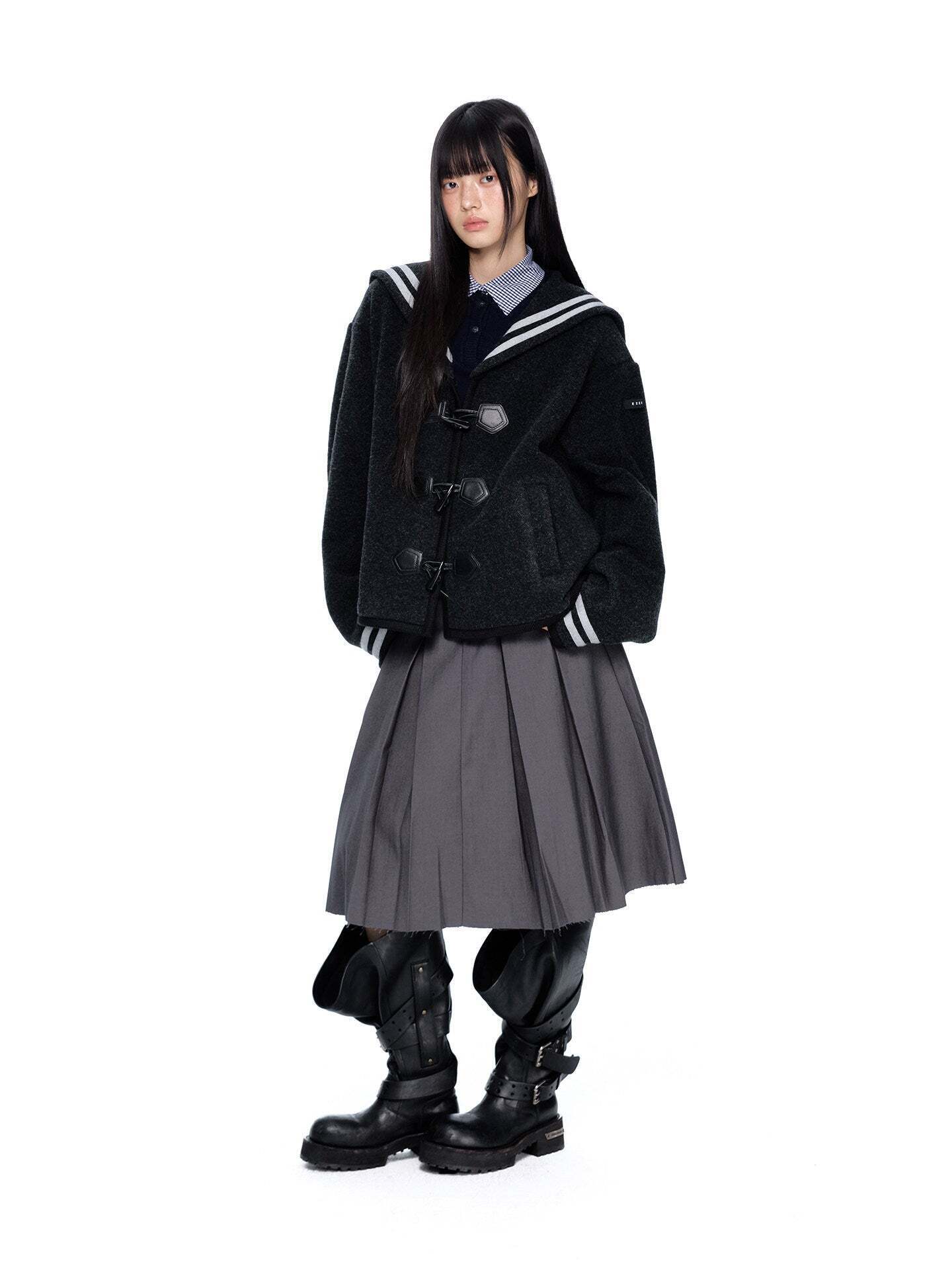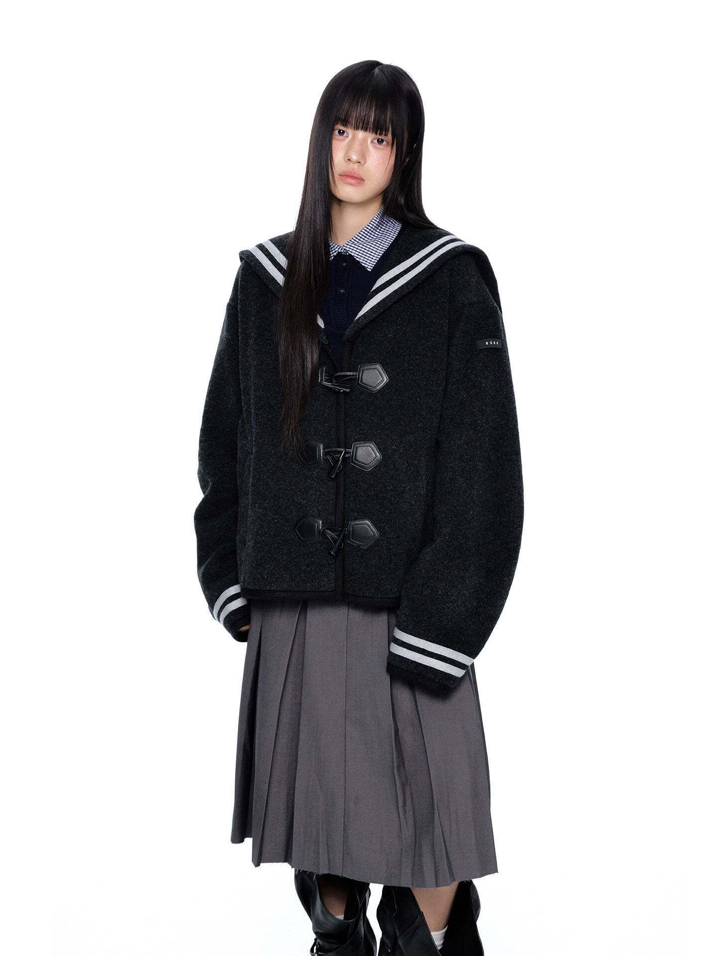 A duffle coat with a large sailor collar that becomes the main feature of the coordination.