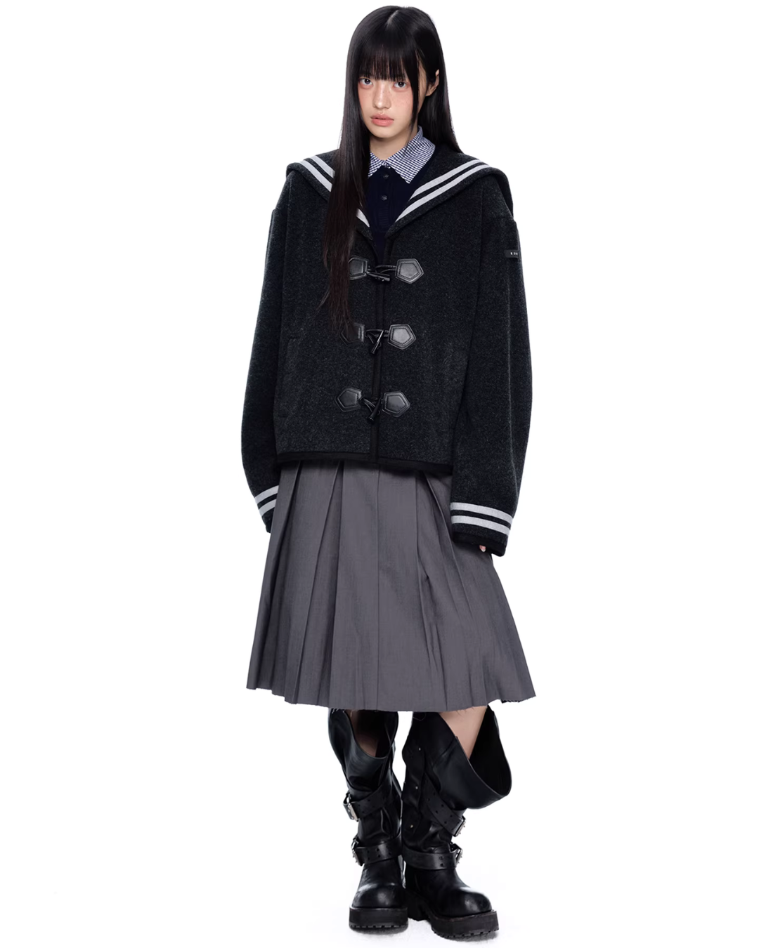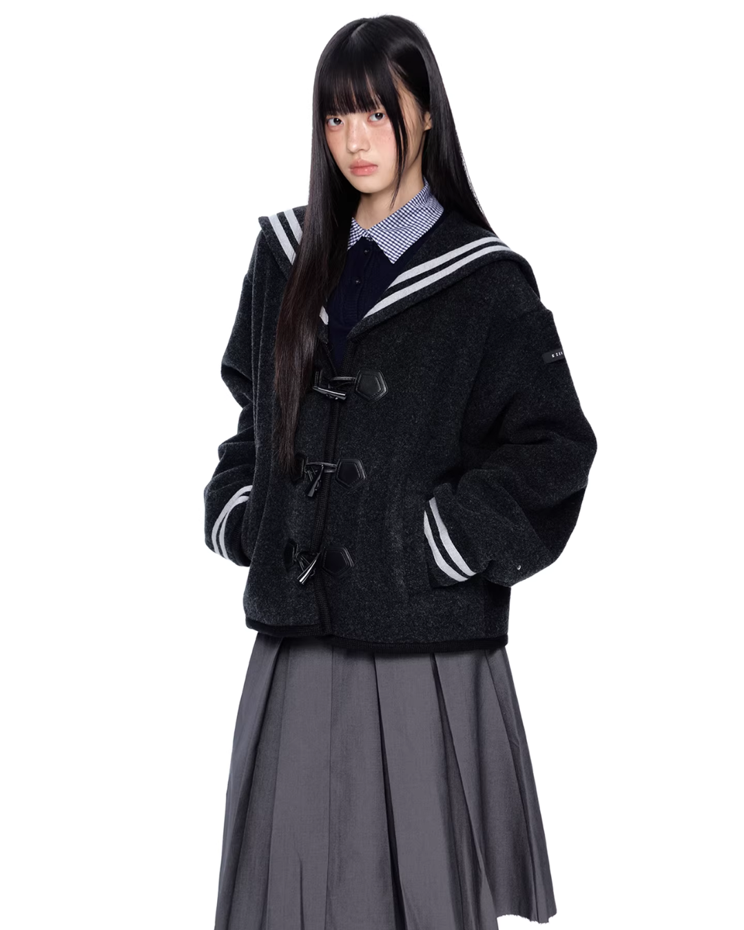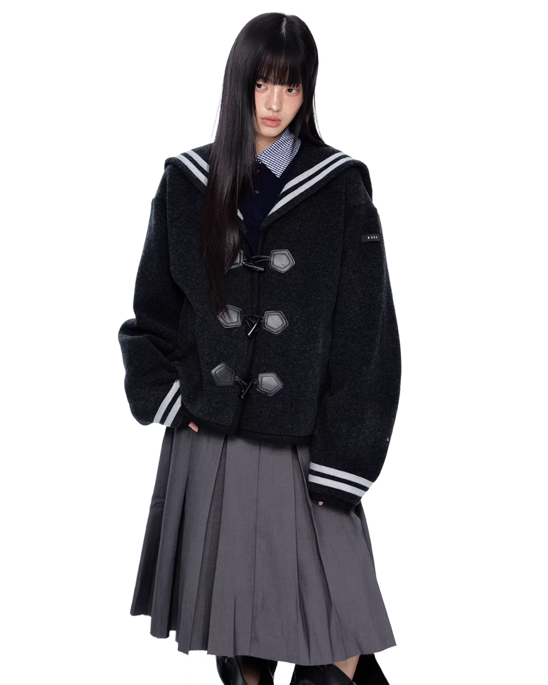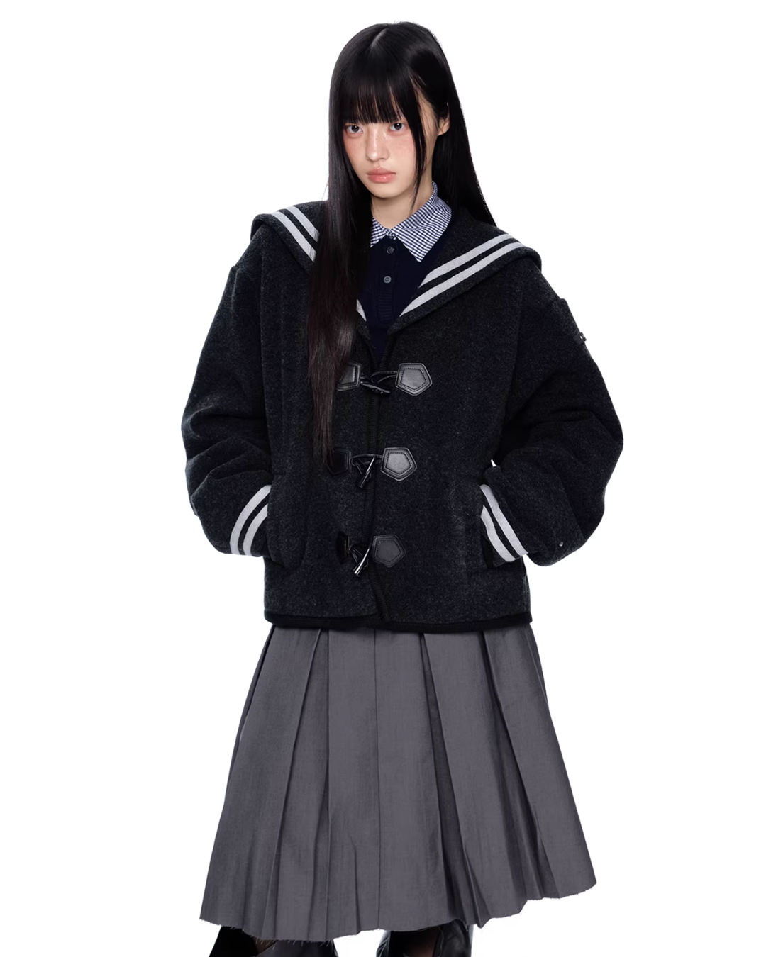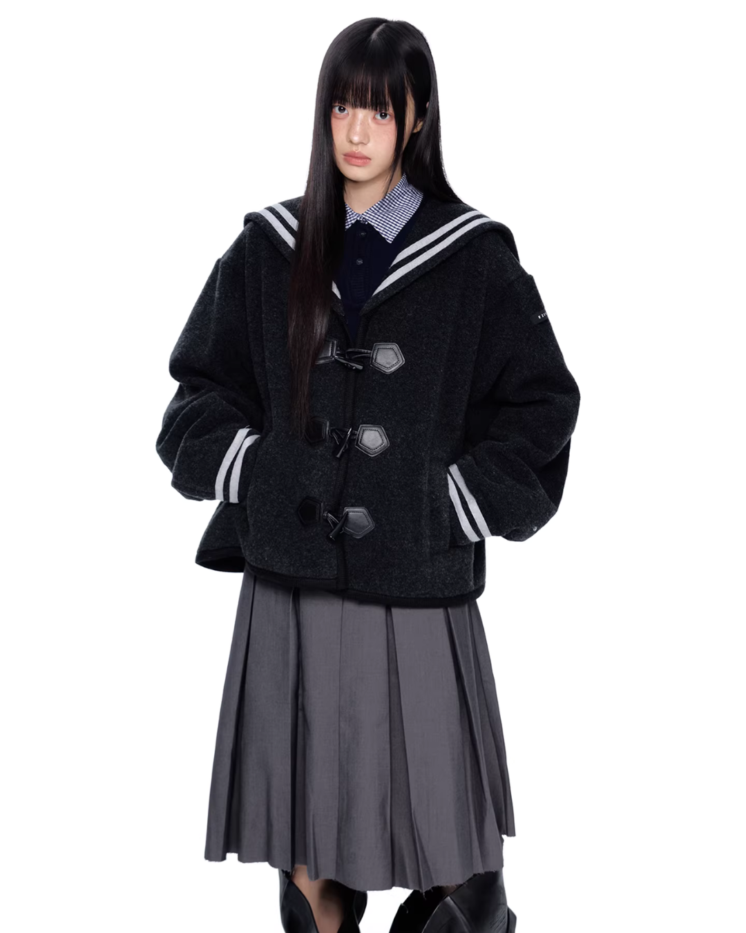 A duffle coat with a large sailor collar that becomes the main feature of the coordination.