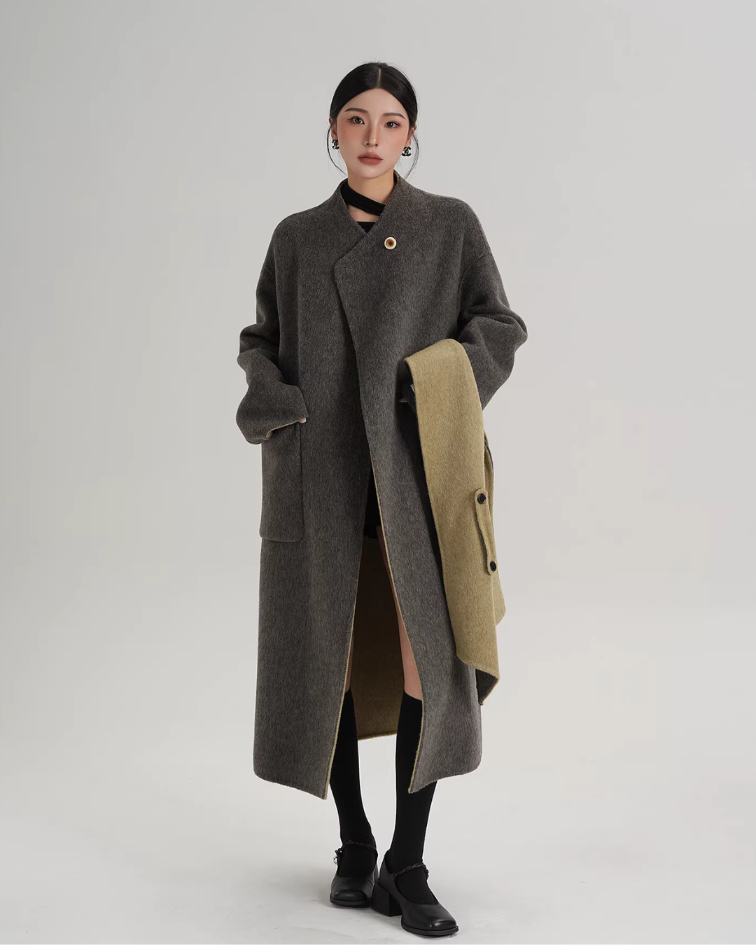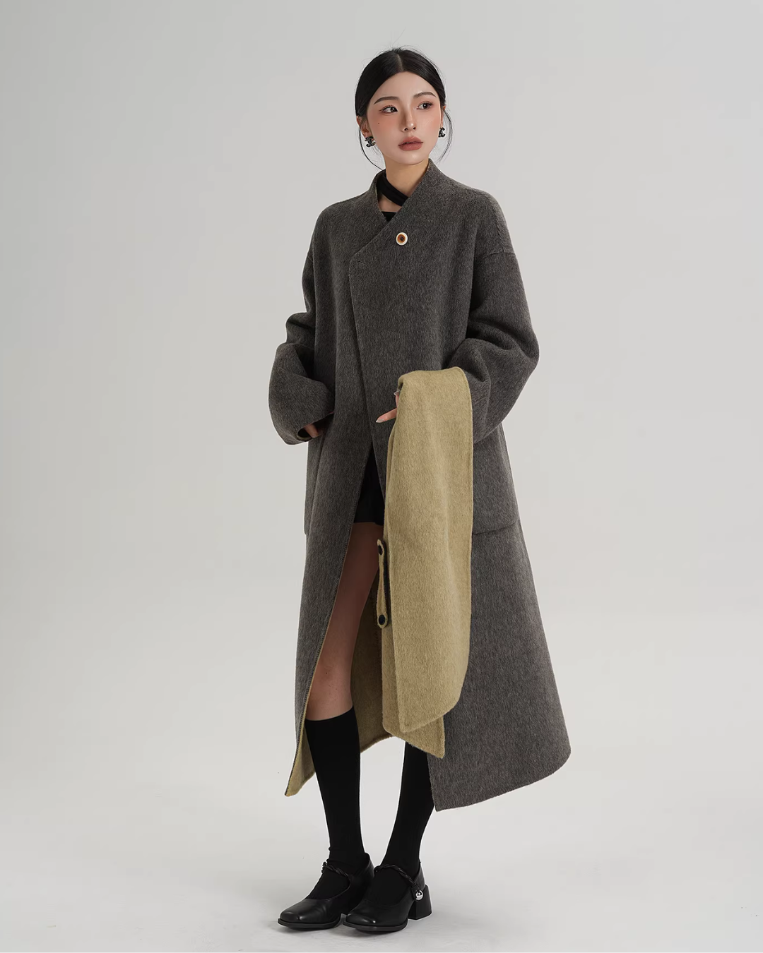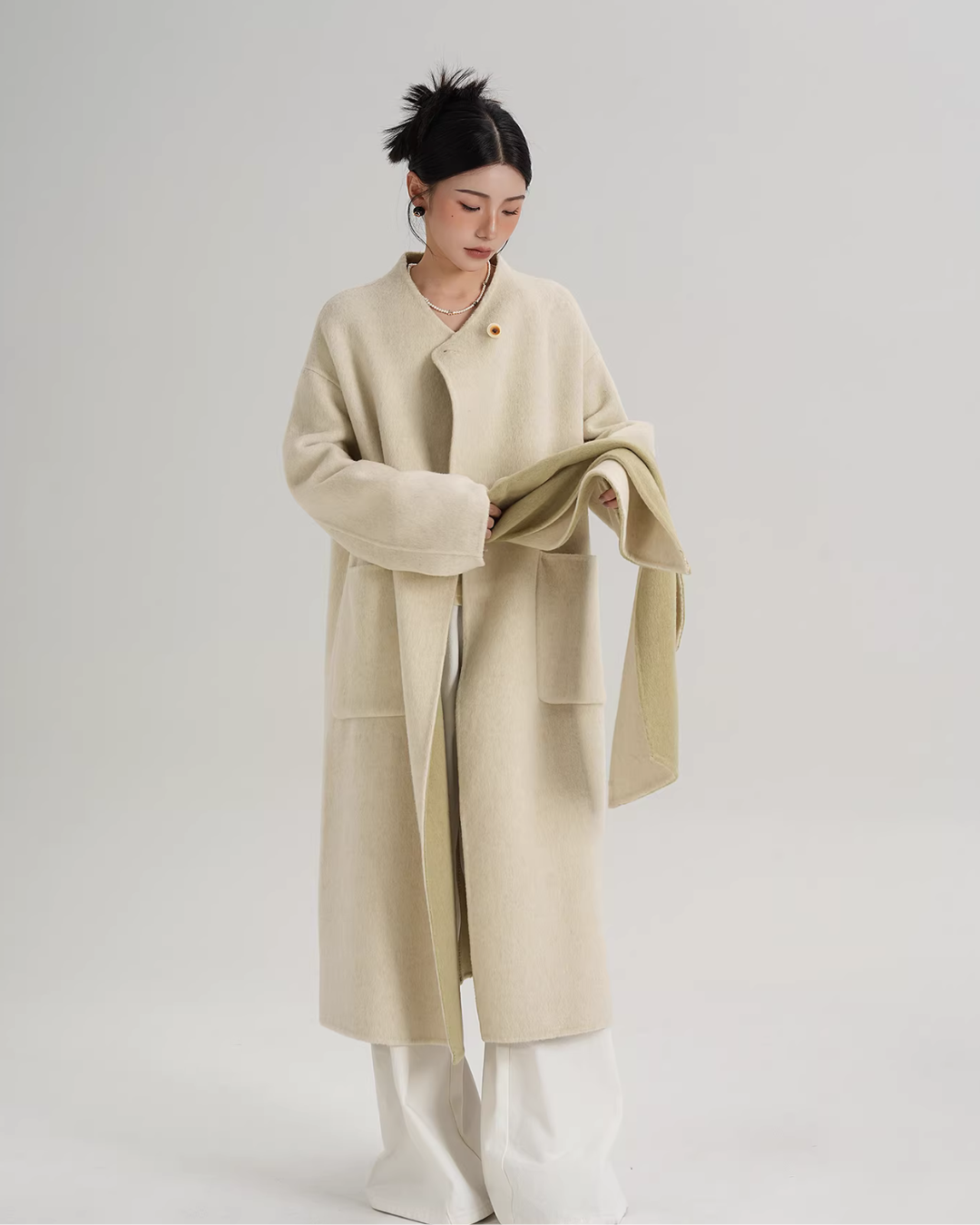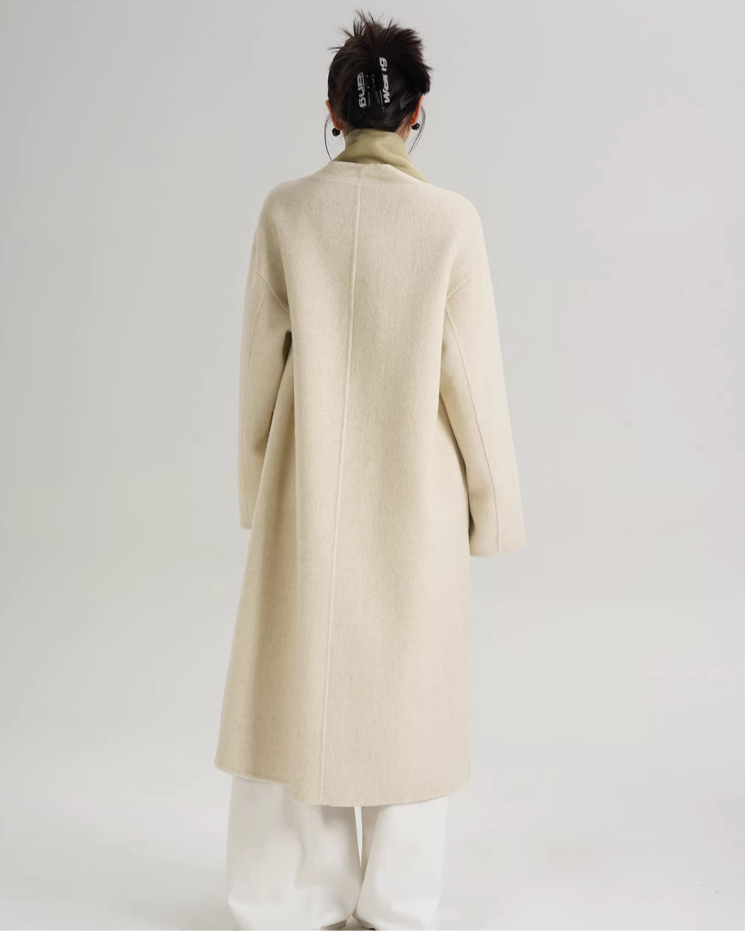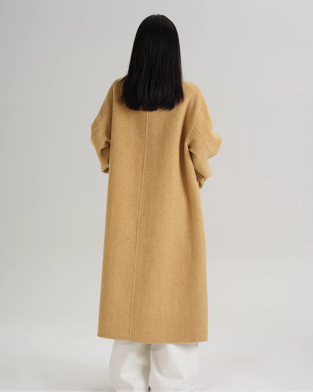 A long coat made of fake wool material that provides a warm and comfortable fit.