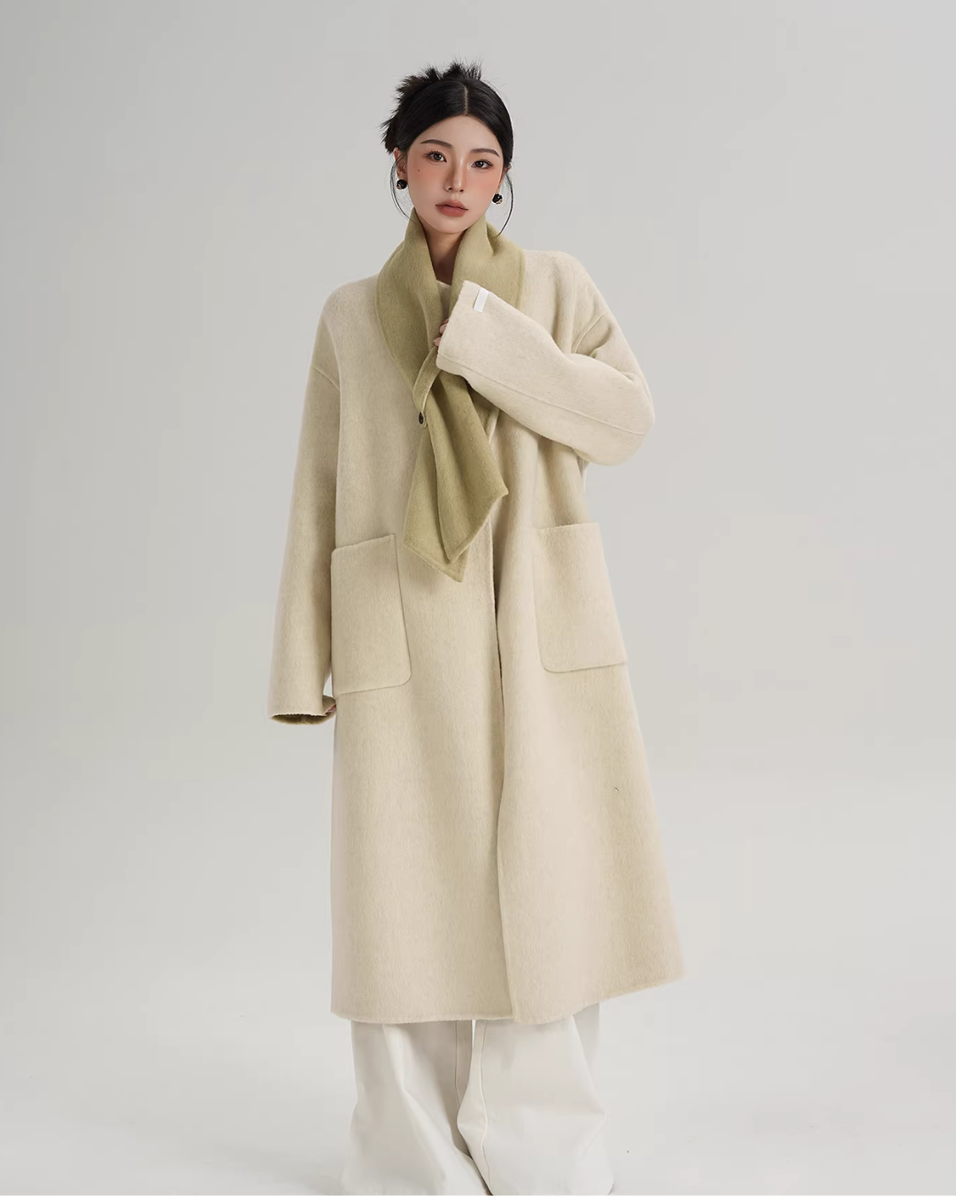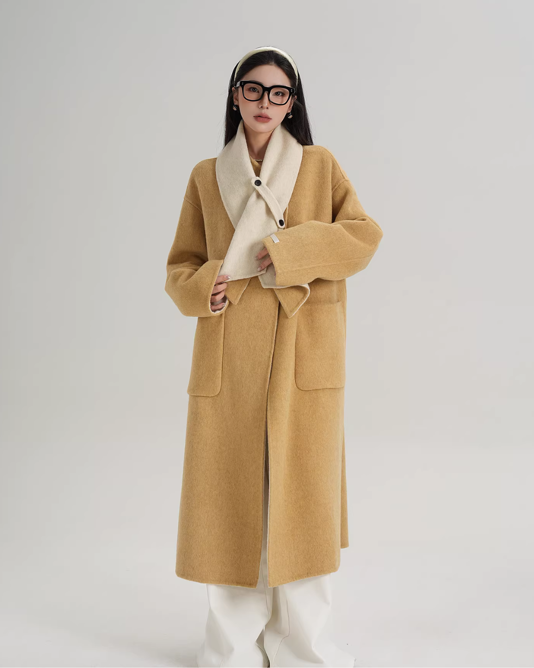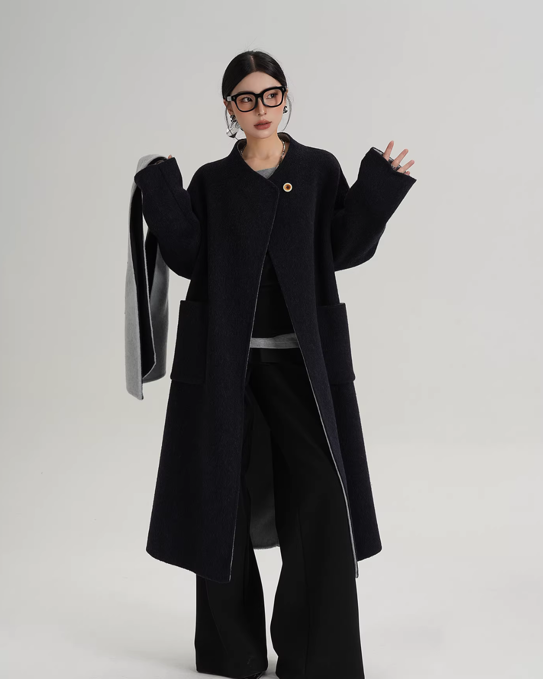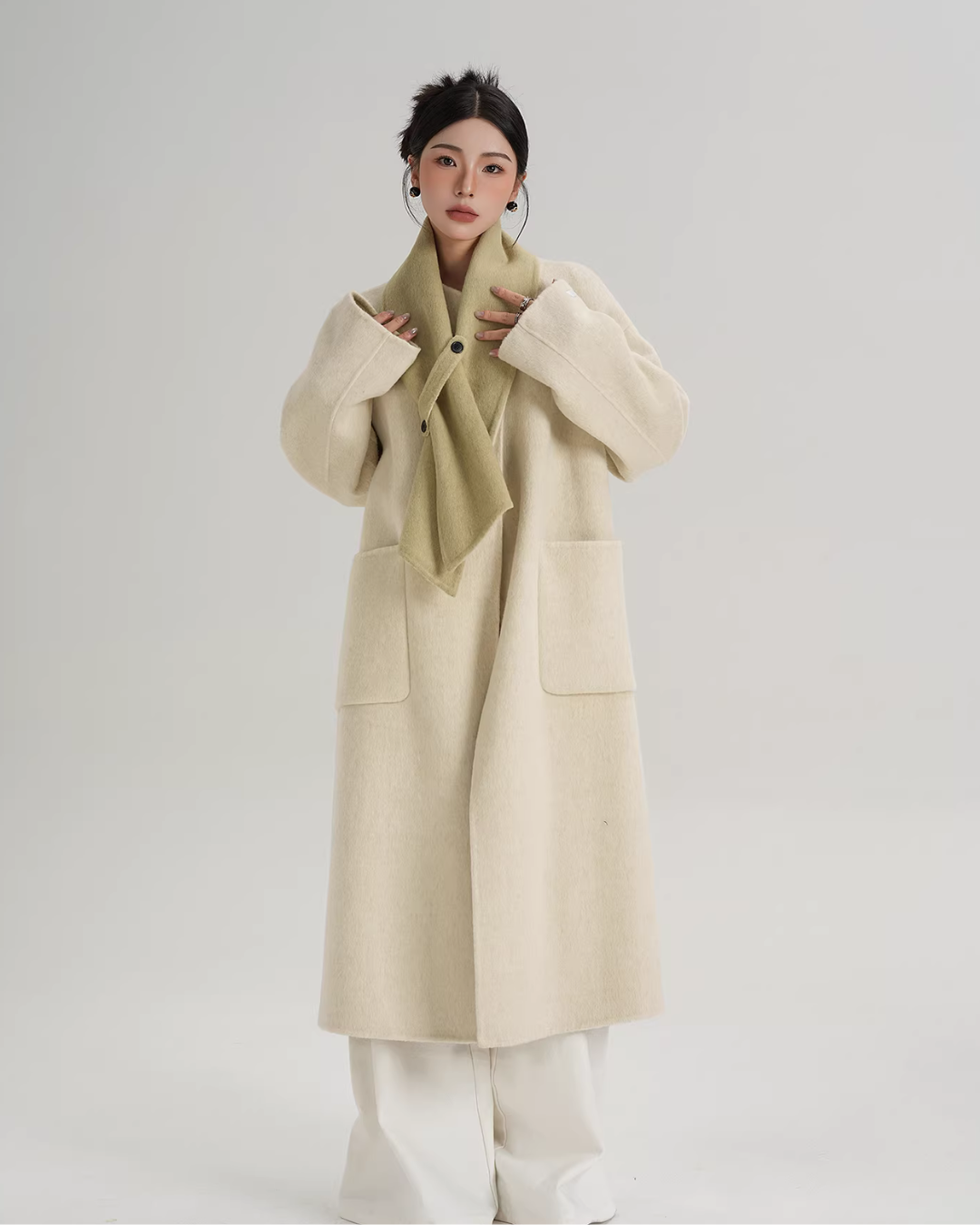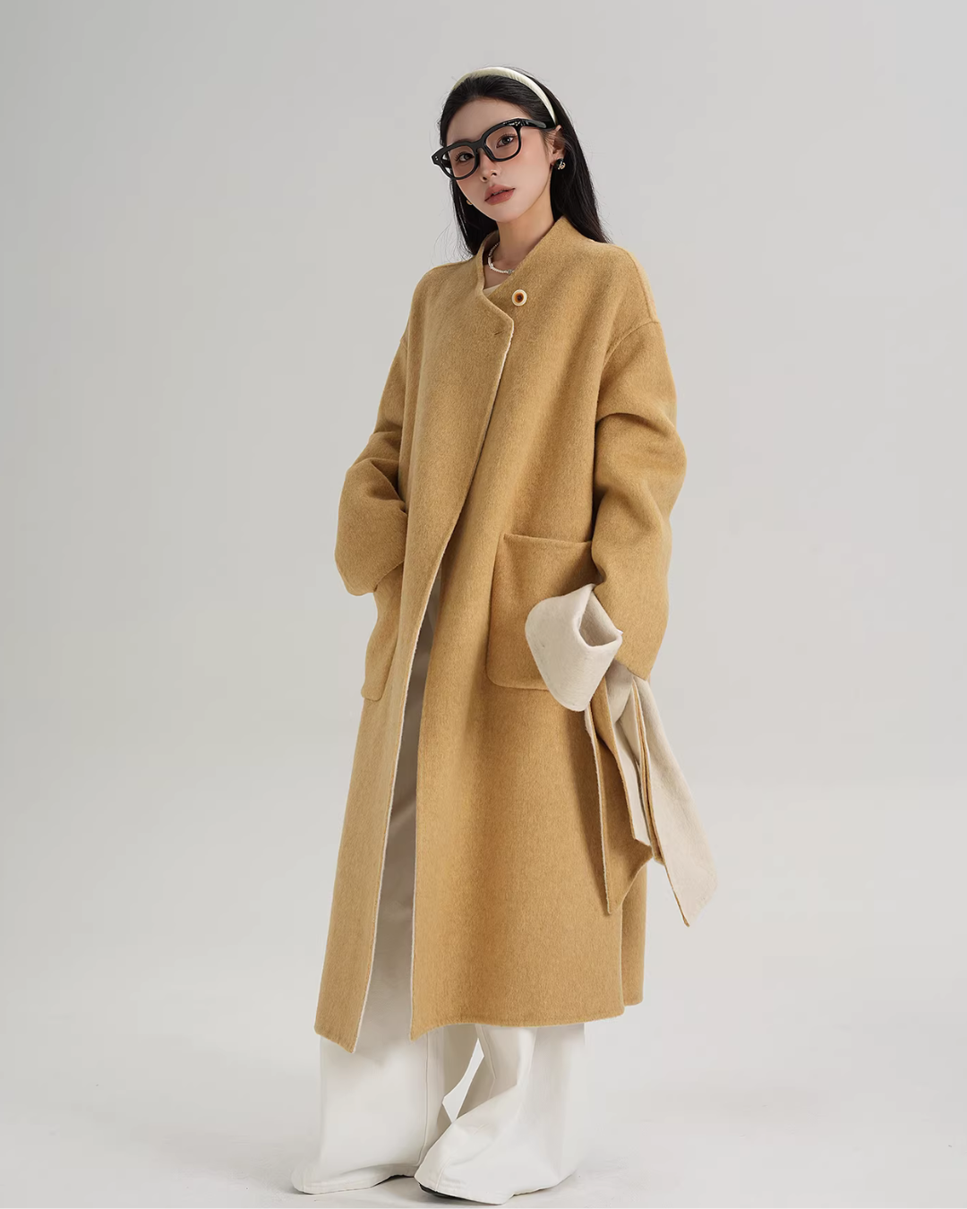 A long coat made of fake wool material that provides a warm and comfortable fit.