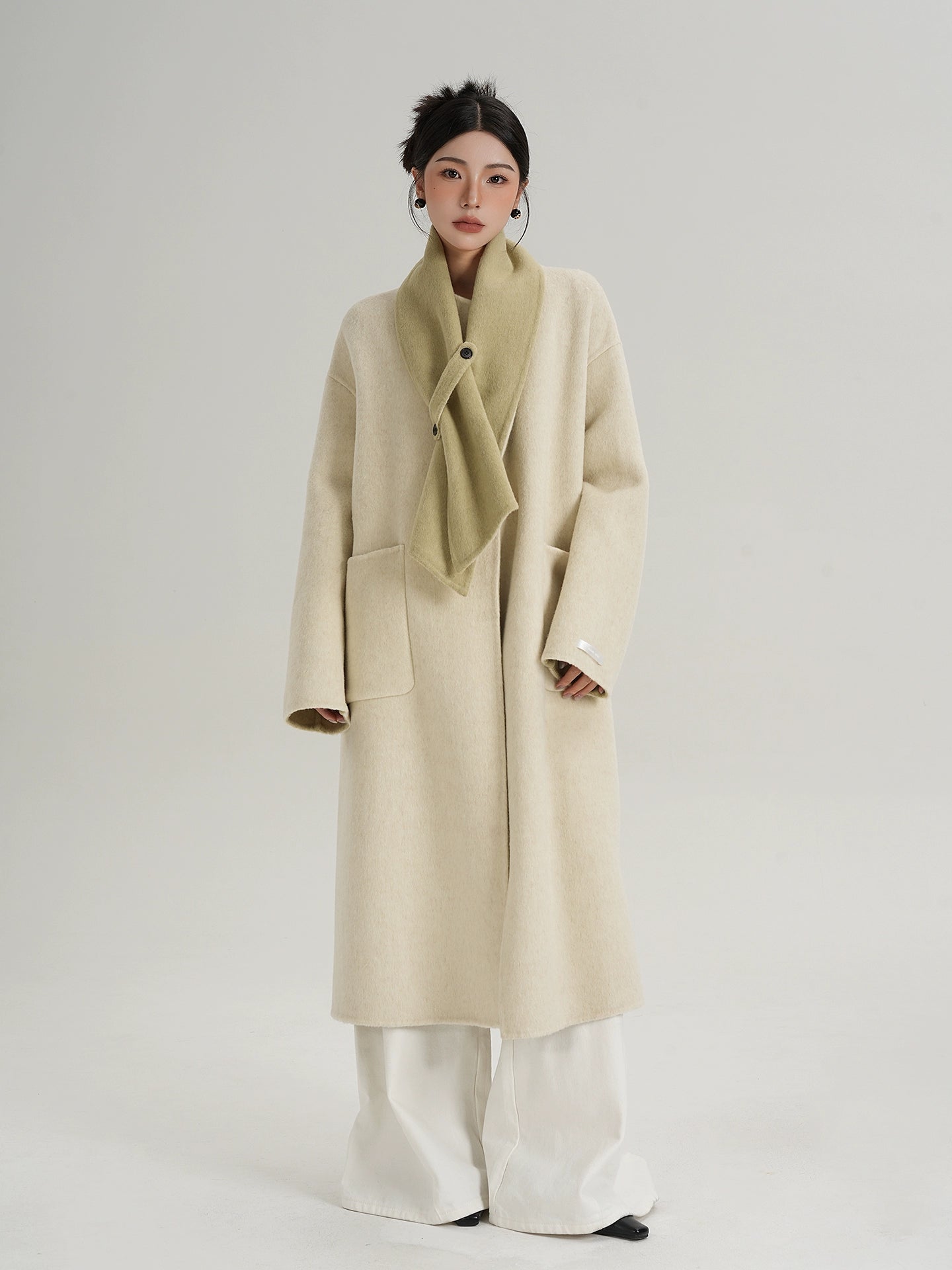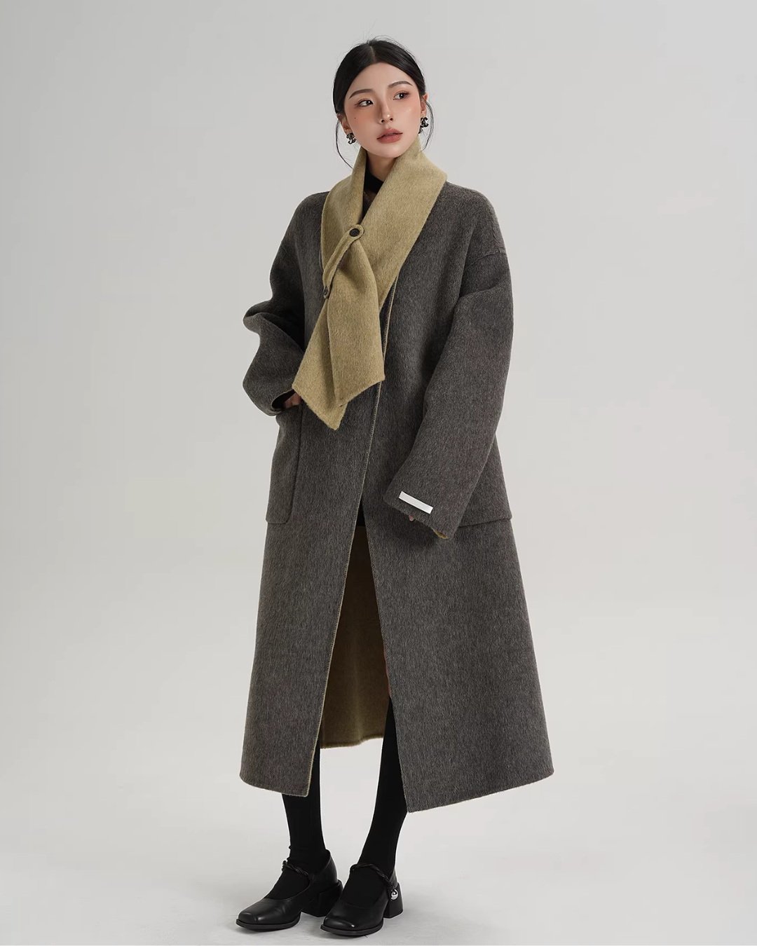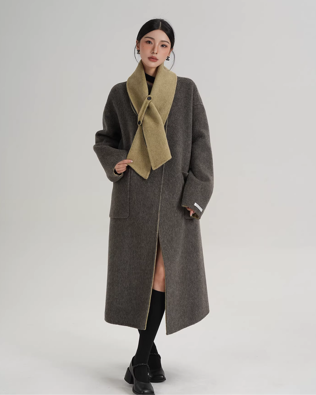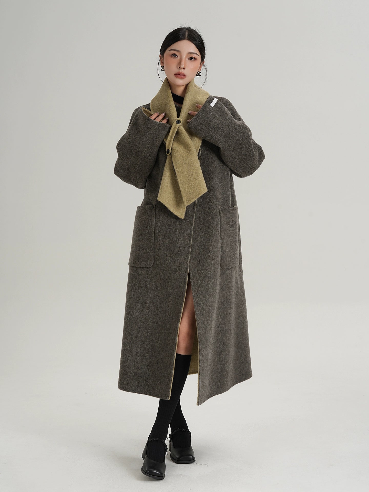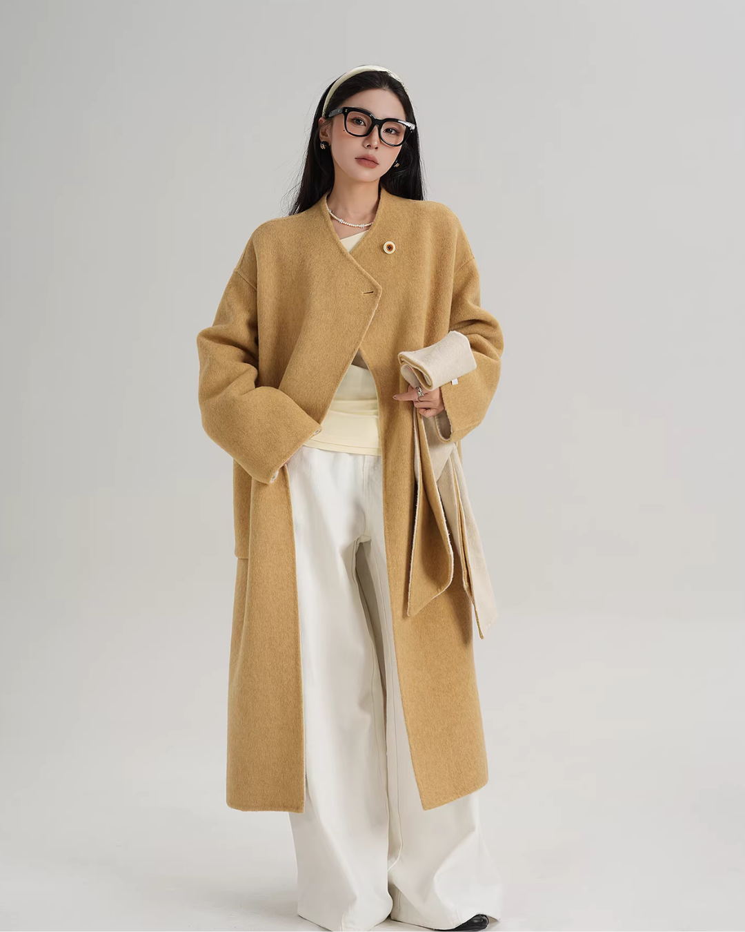 A long coat made of fake wool material that provides a warm and comfortable fit.