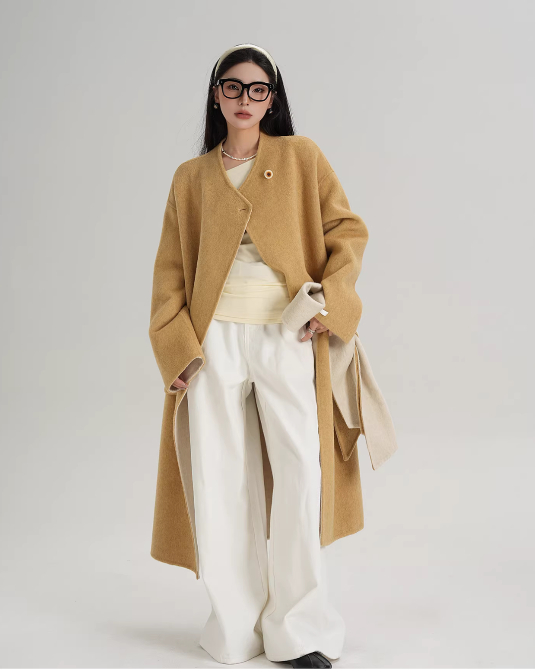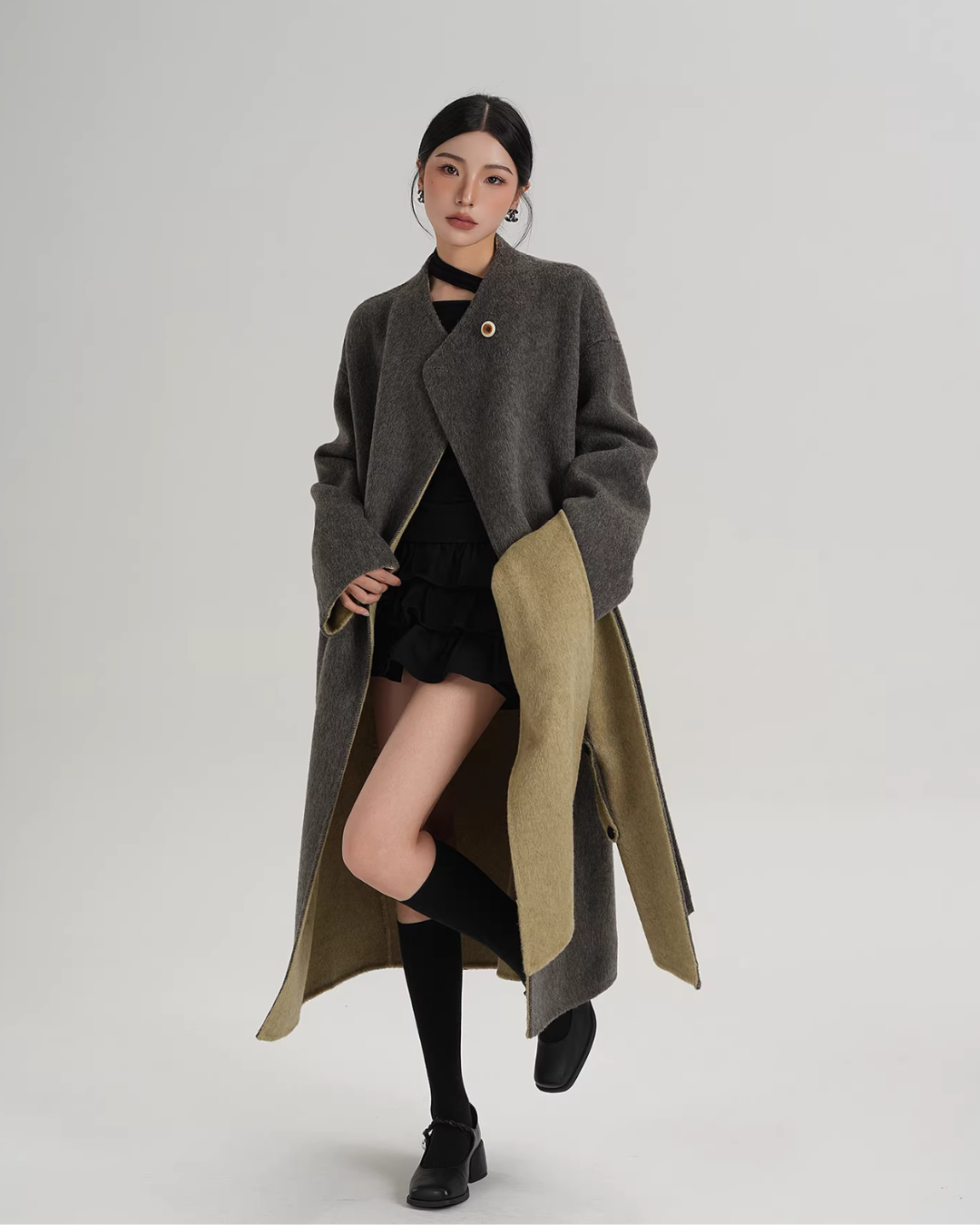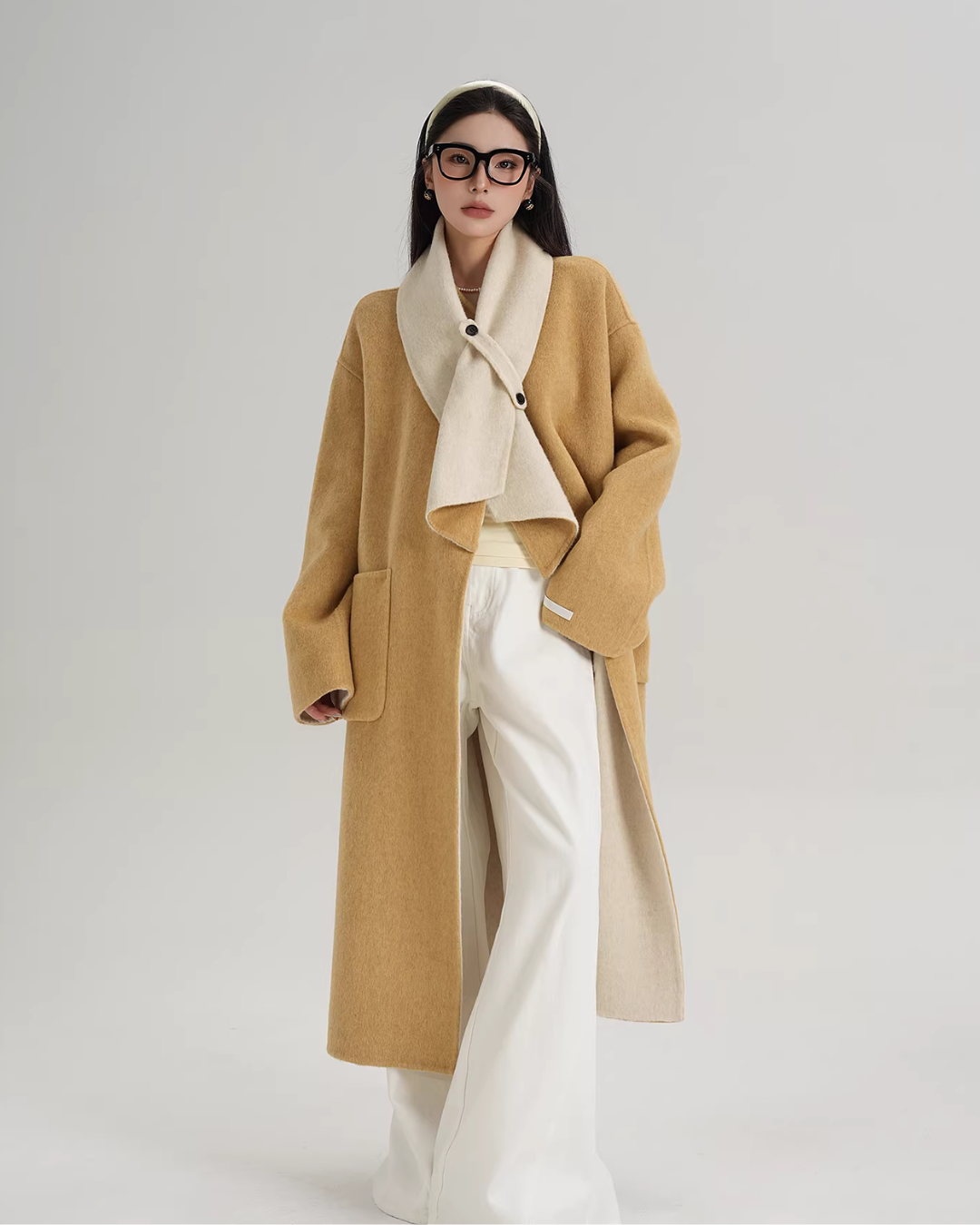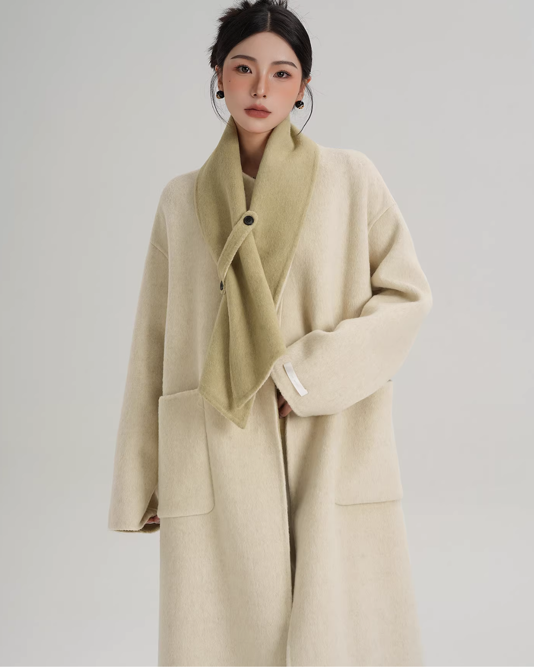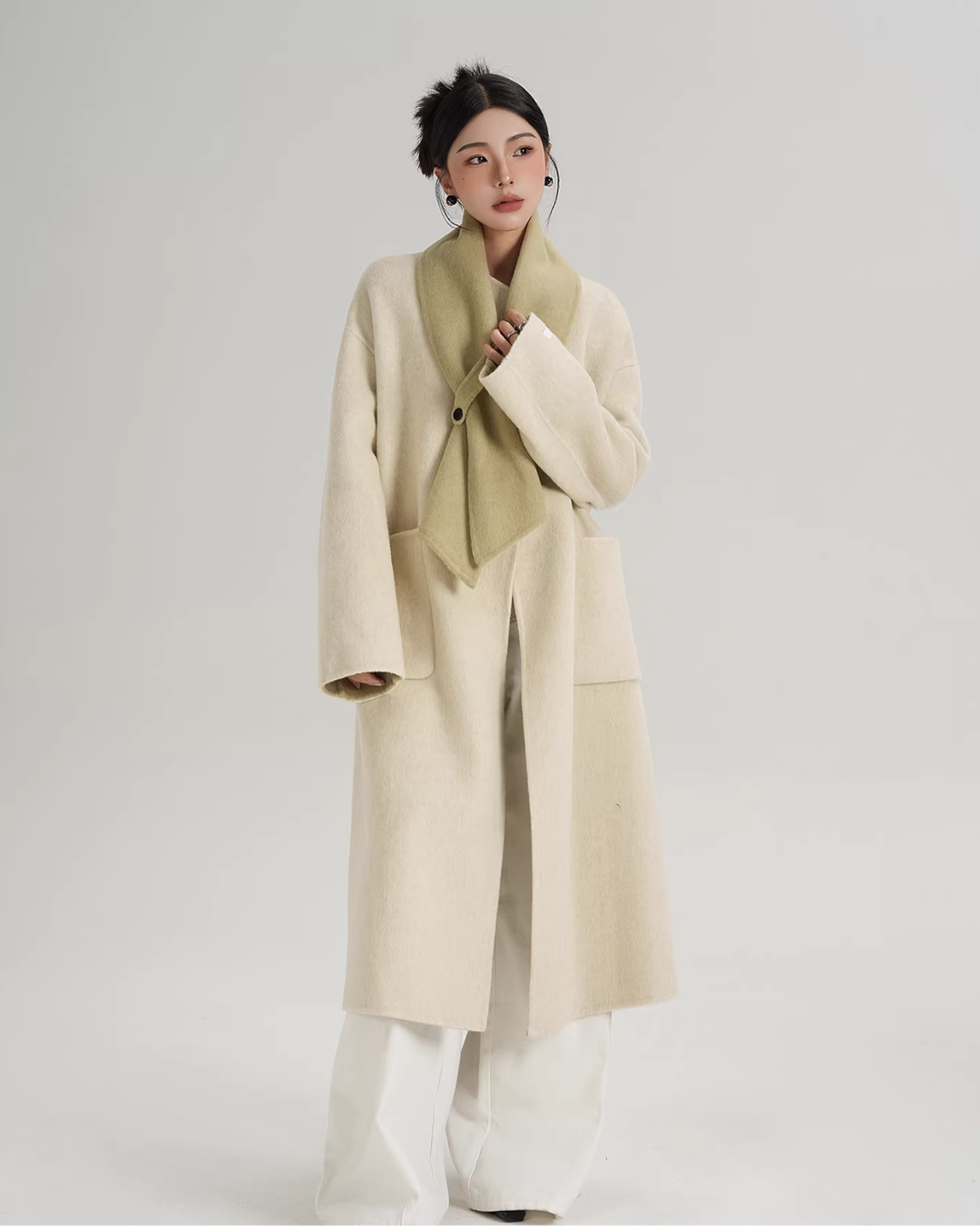 A long coat made of fake wool material that provides a warm and comfortable fit.
