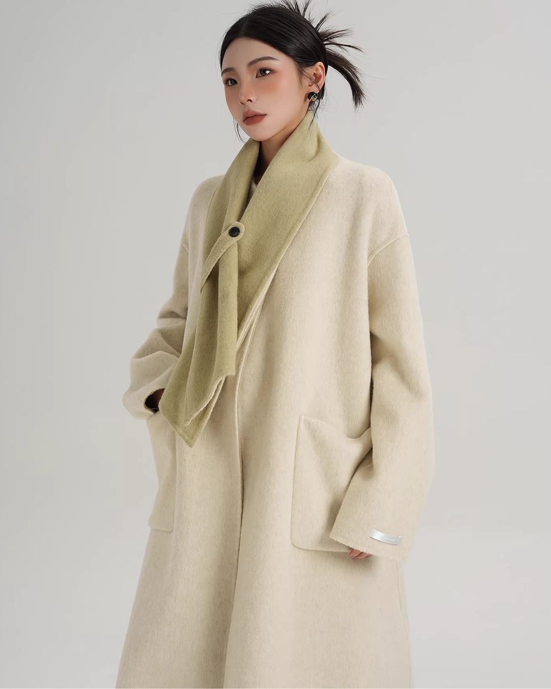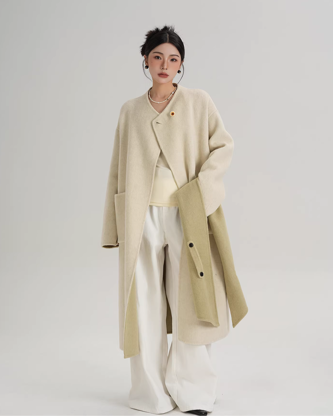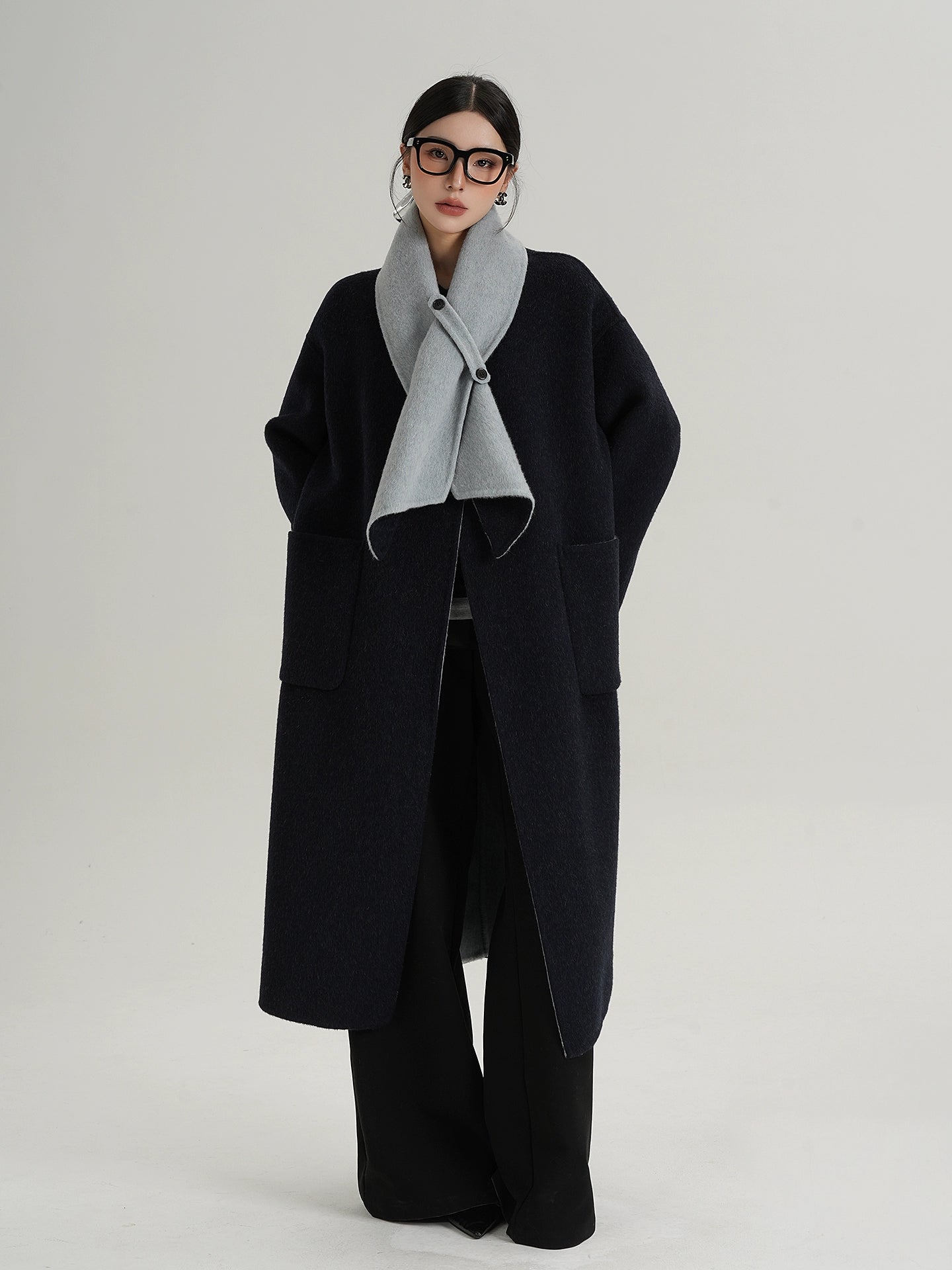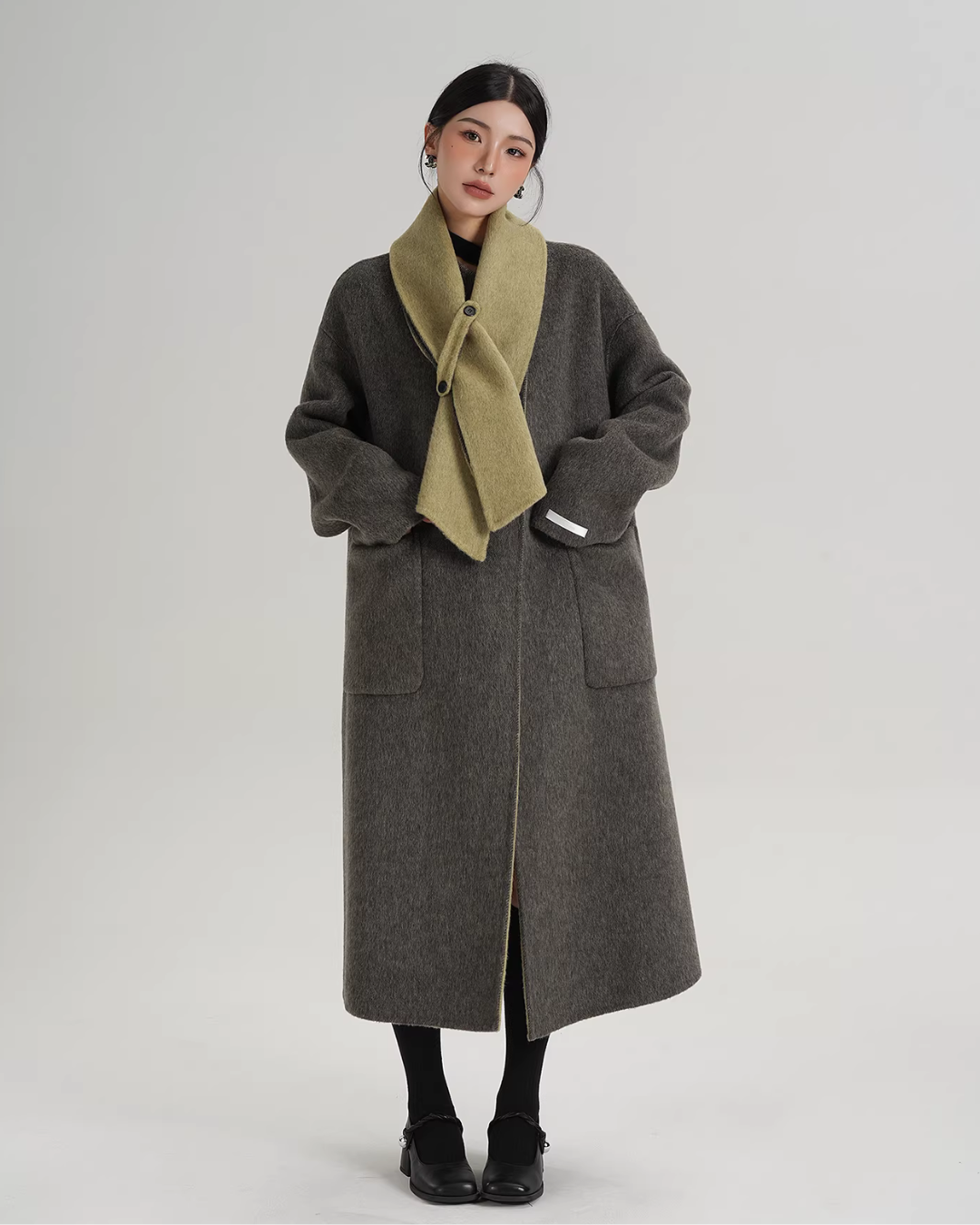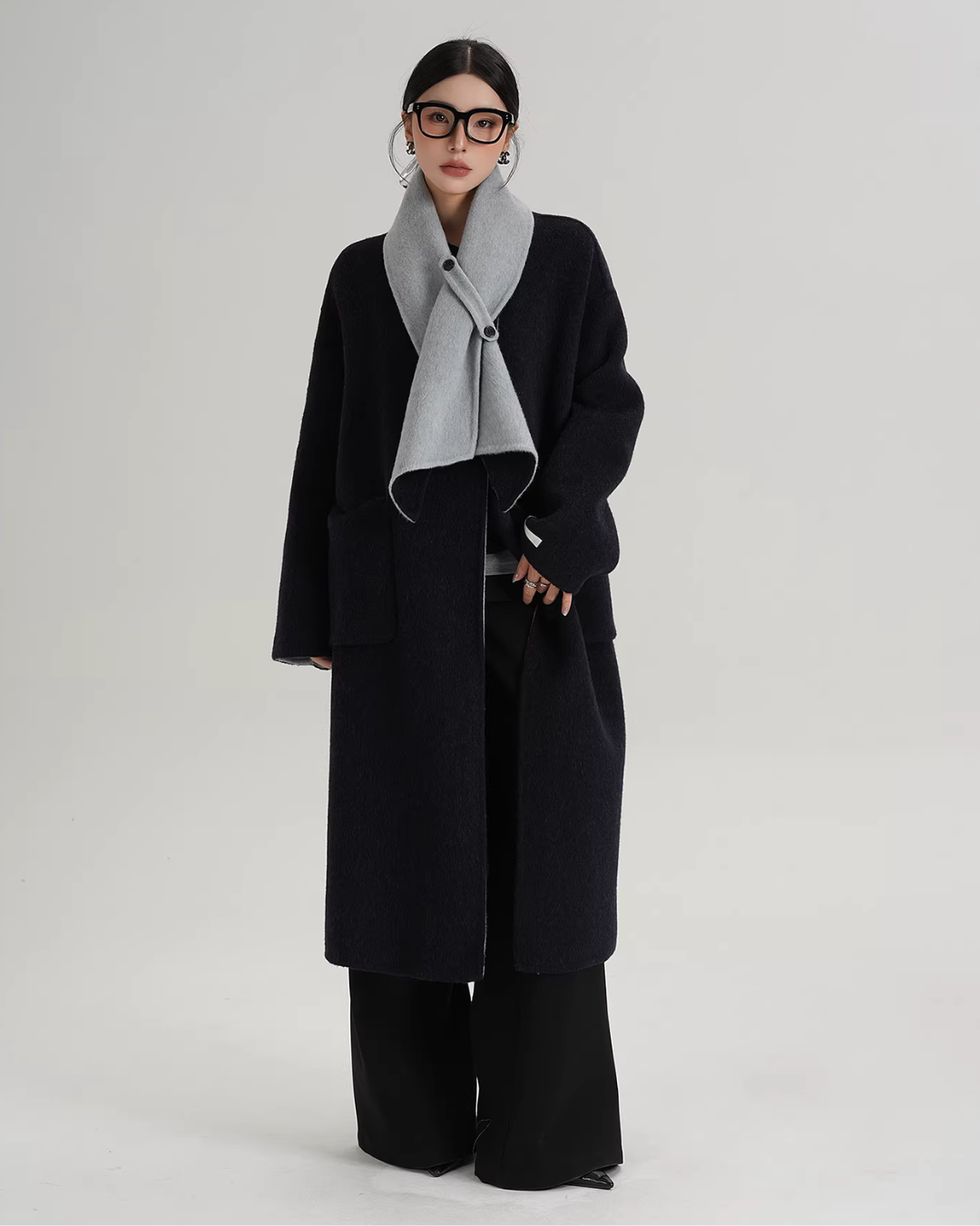 A long coat made of fake wool material that provides a warm and comfortable fit.