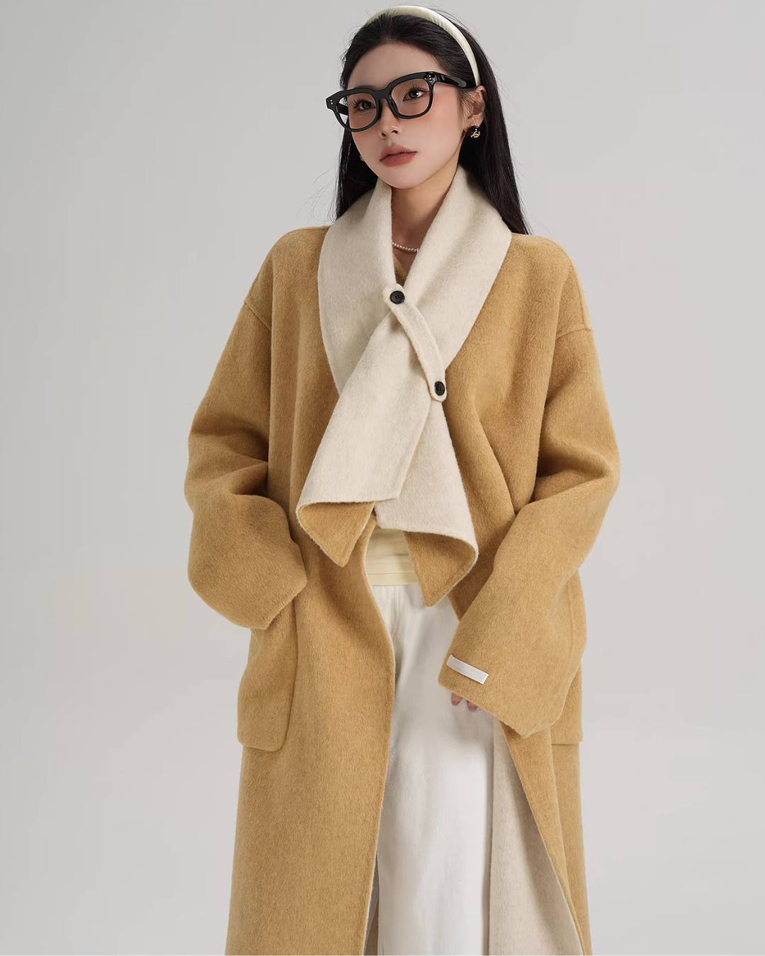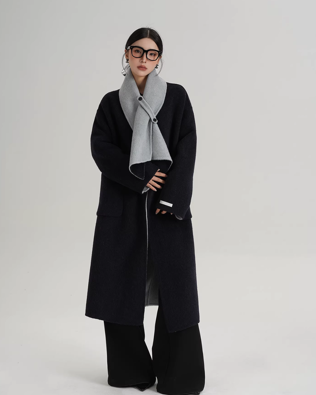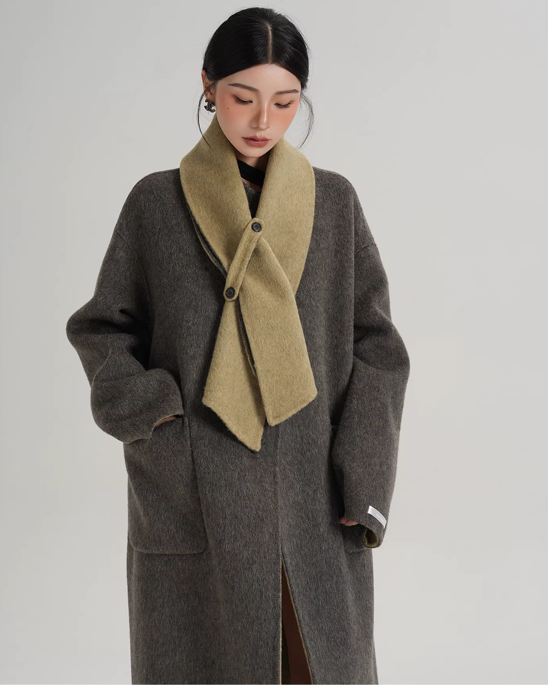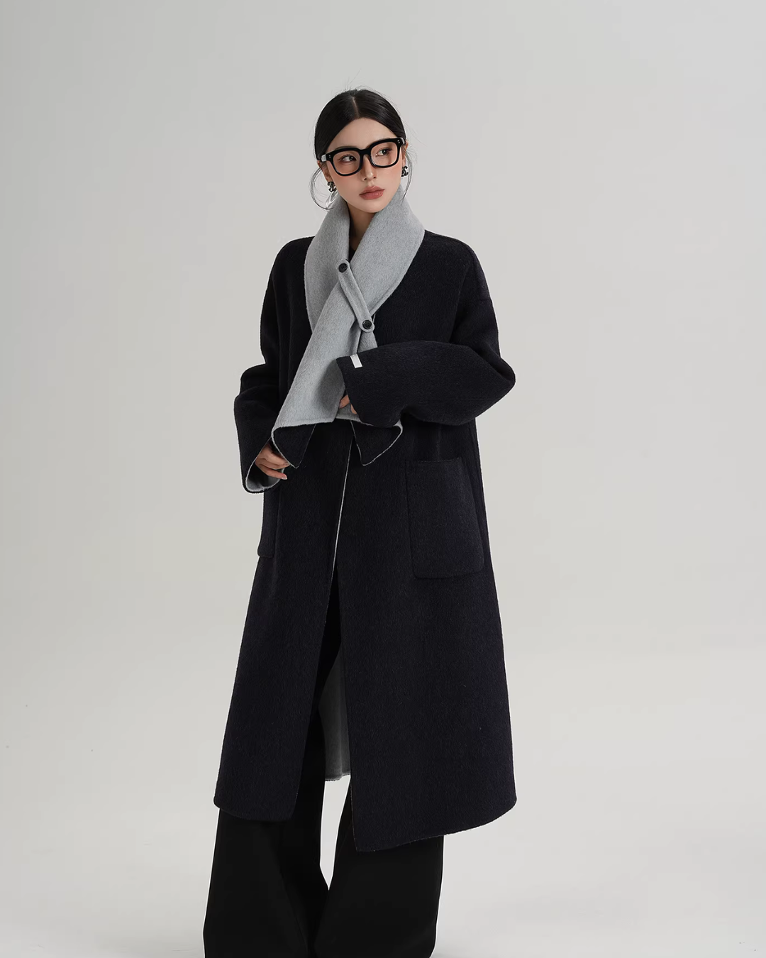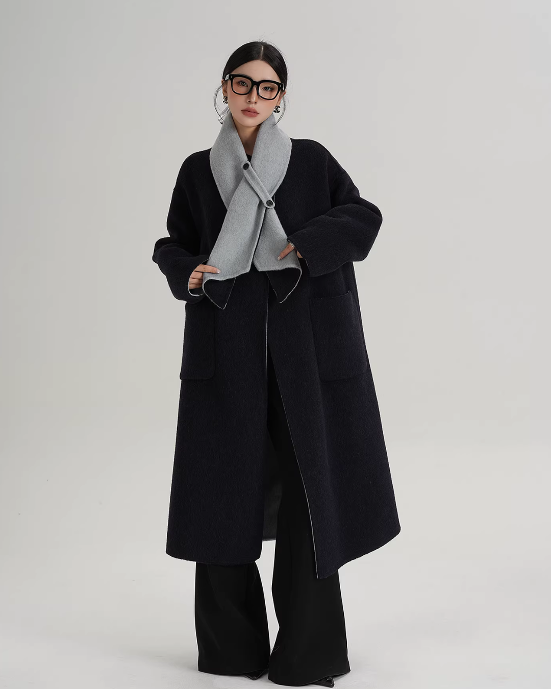 A long coat made of fake wool material that provides a warm and comfortable fit.
