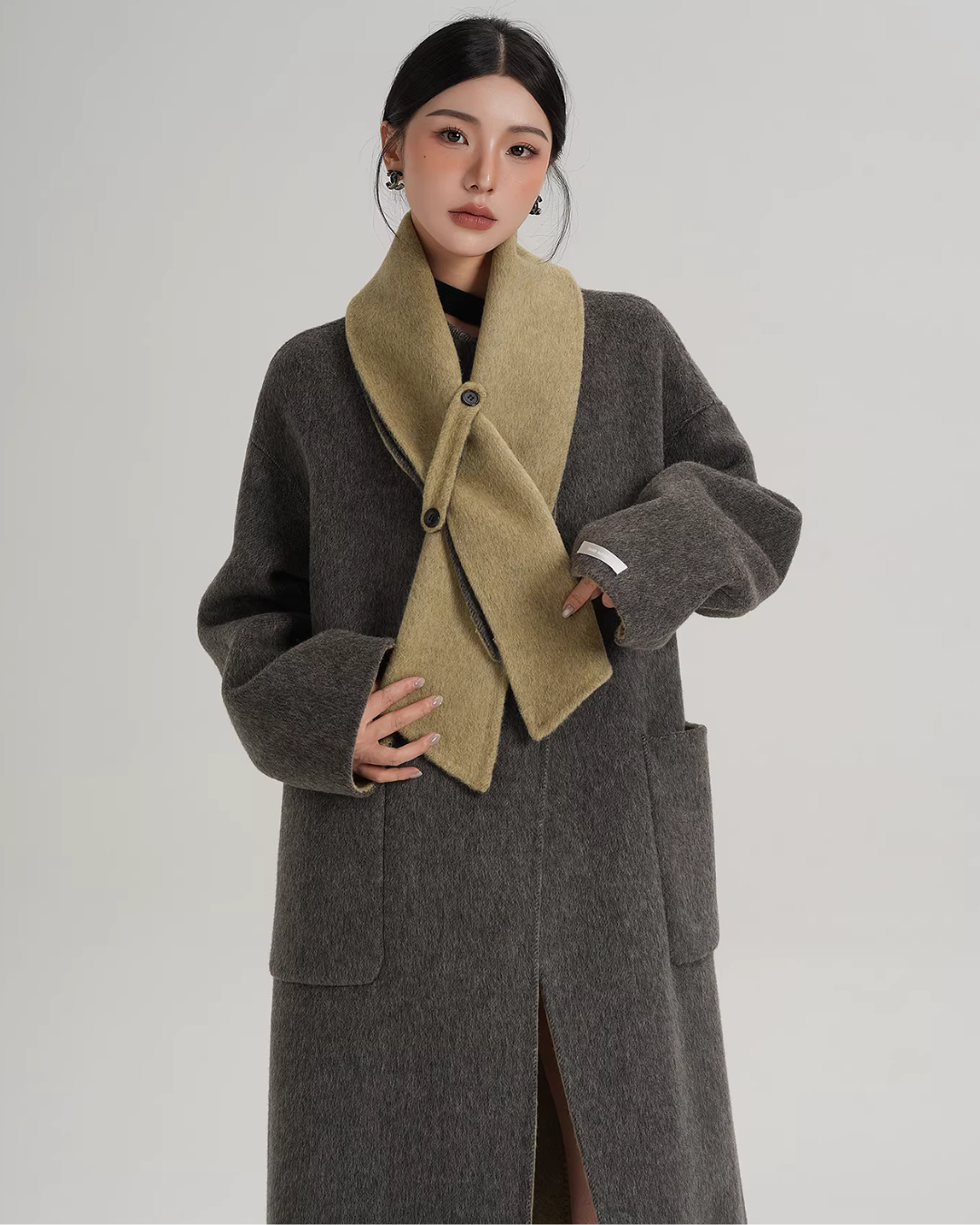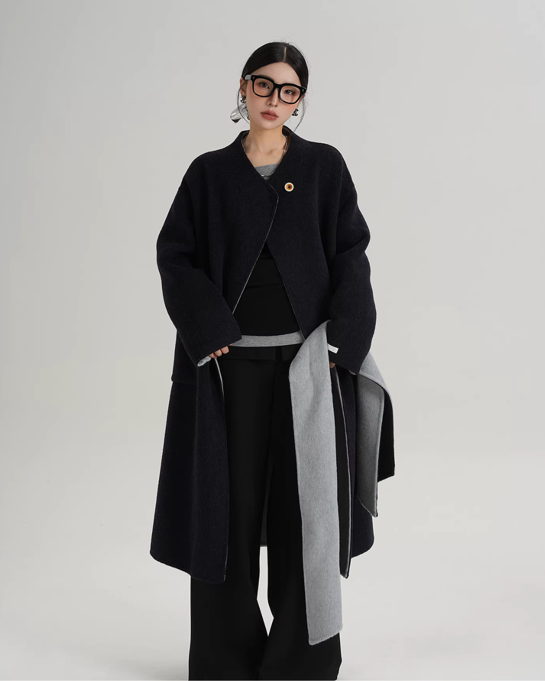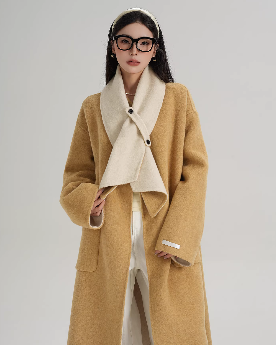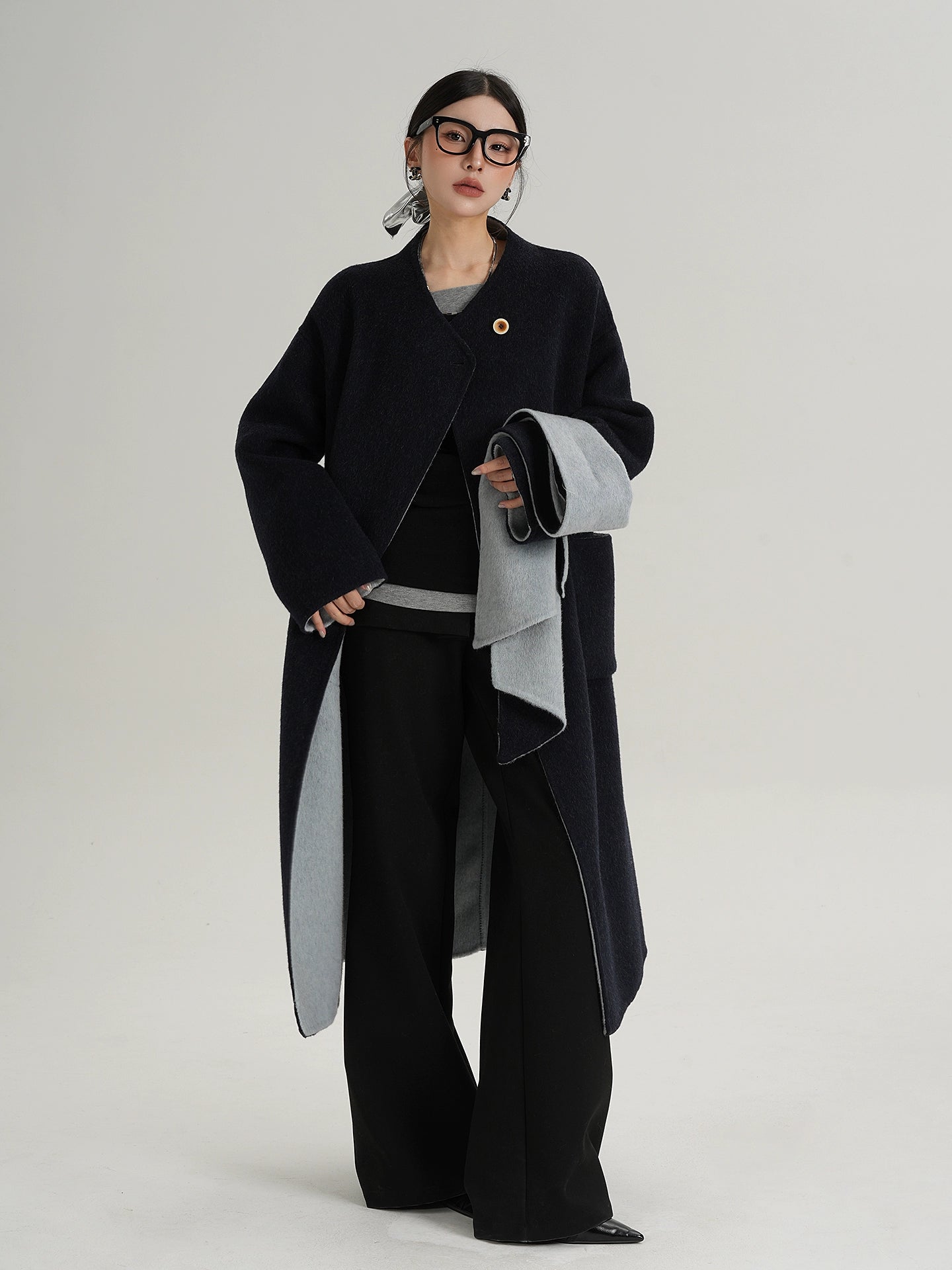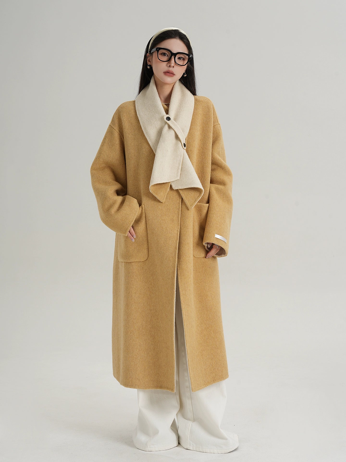 A long coat made of fake wool material that provides a warm and comfortable fit.