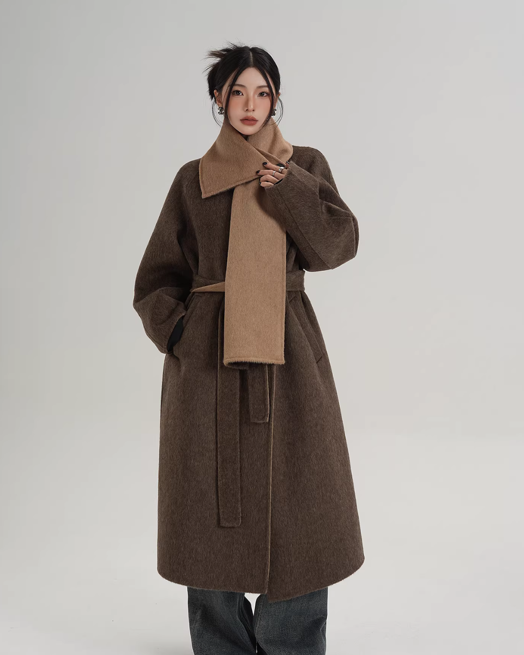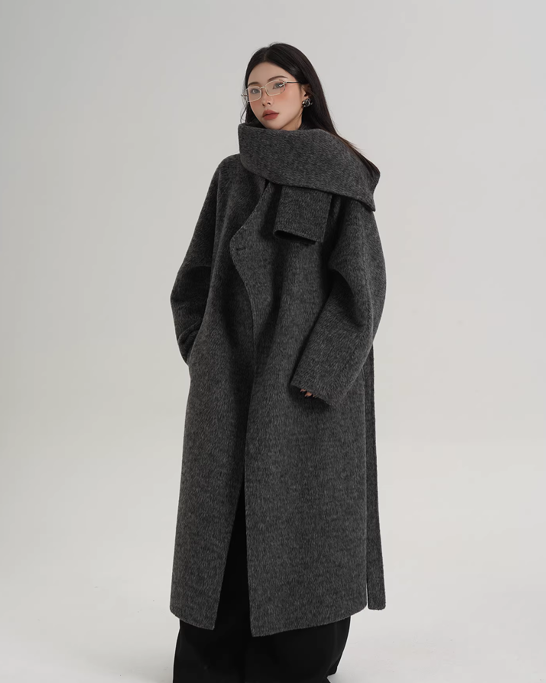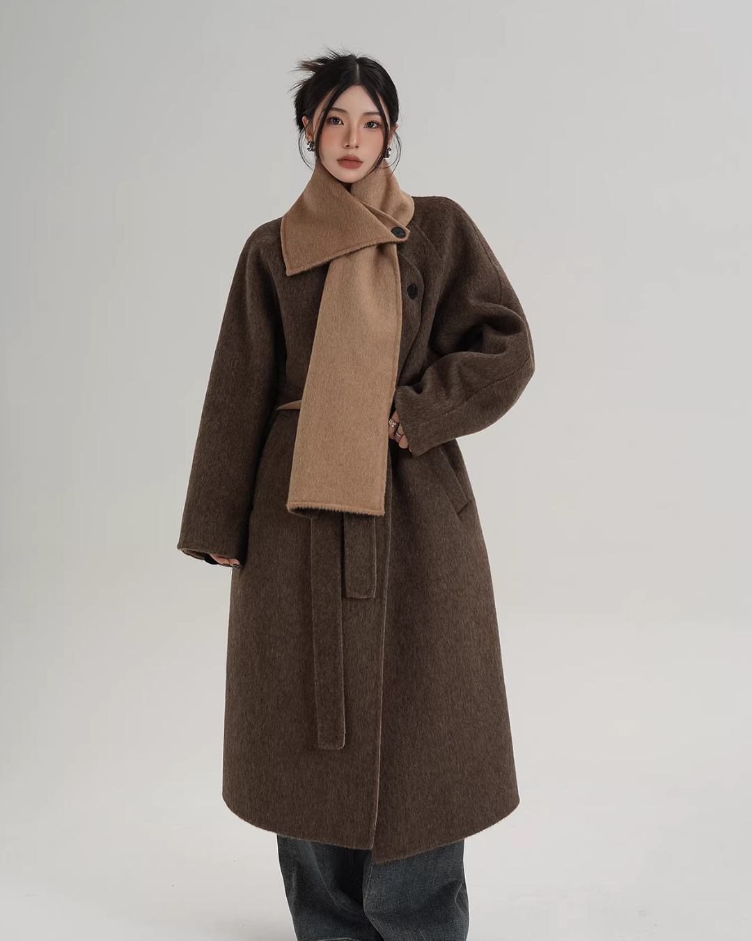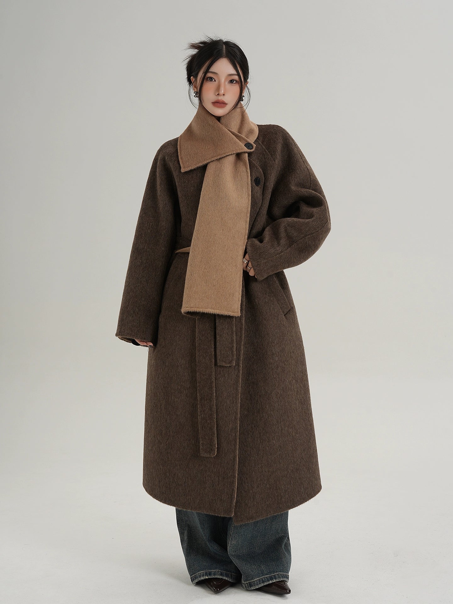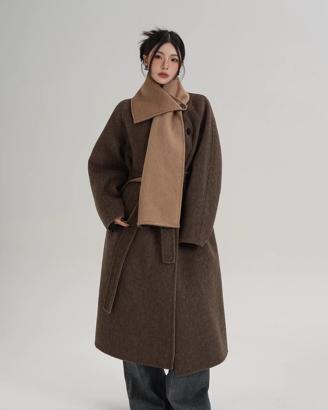 A long coat that can instantly complete an adult casual coordinate with a muffler design.