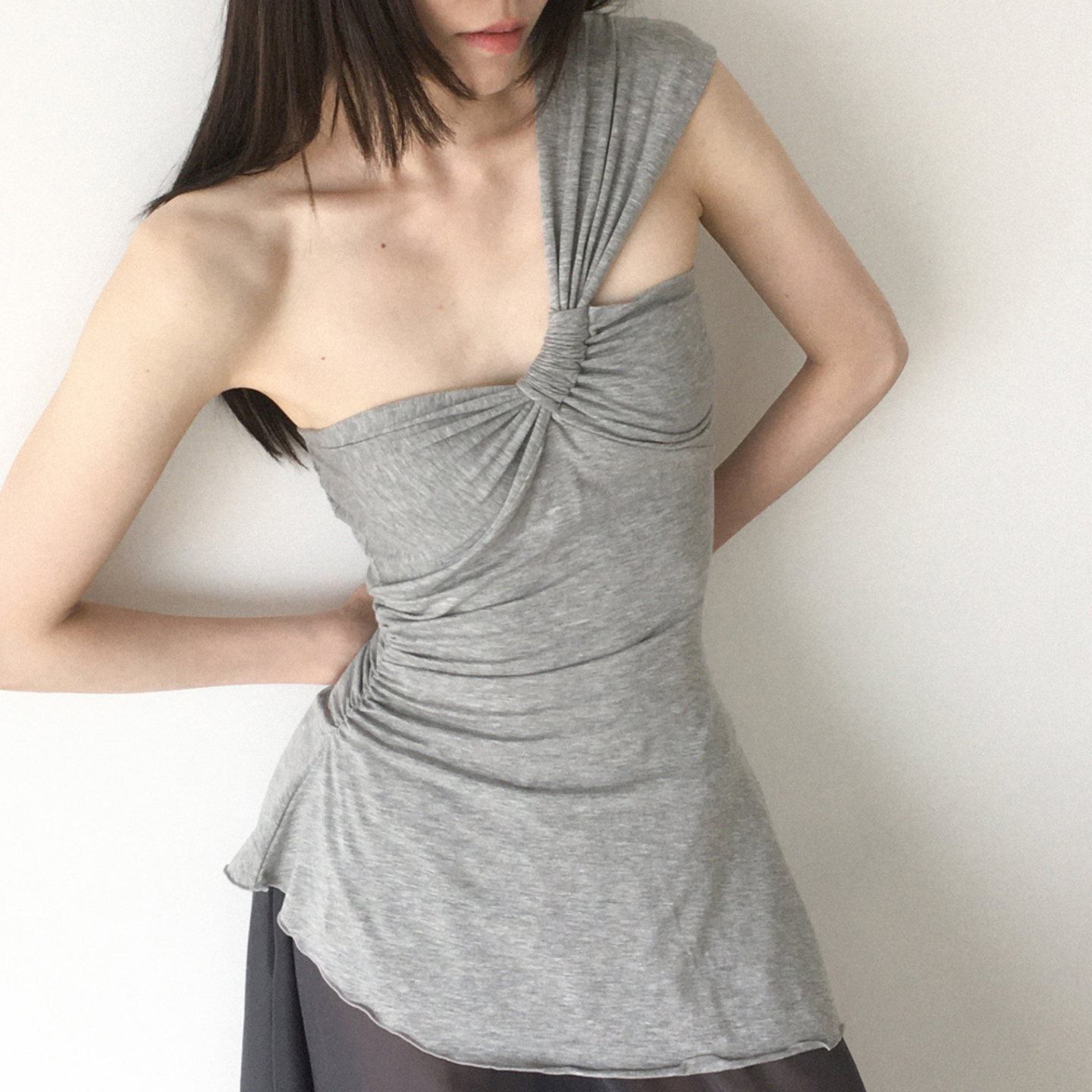 Gray Twisted One Shoulder Tank Top Slim Fit Stretchy Long Top, Y2K