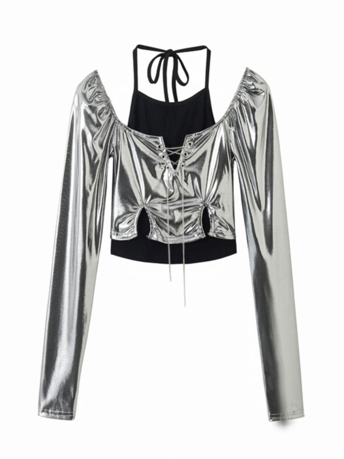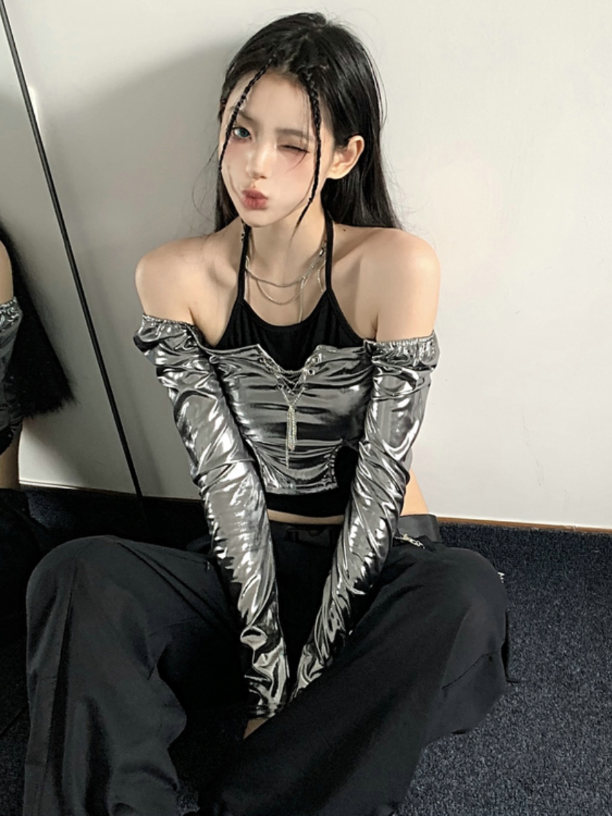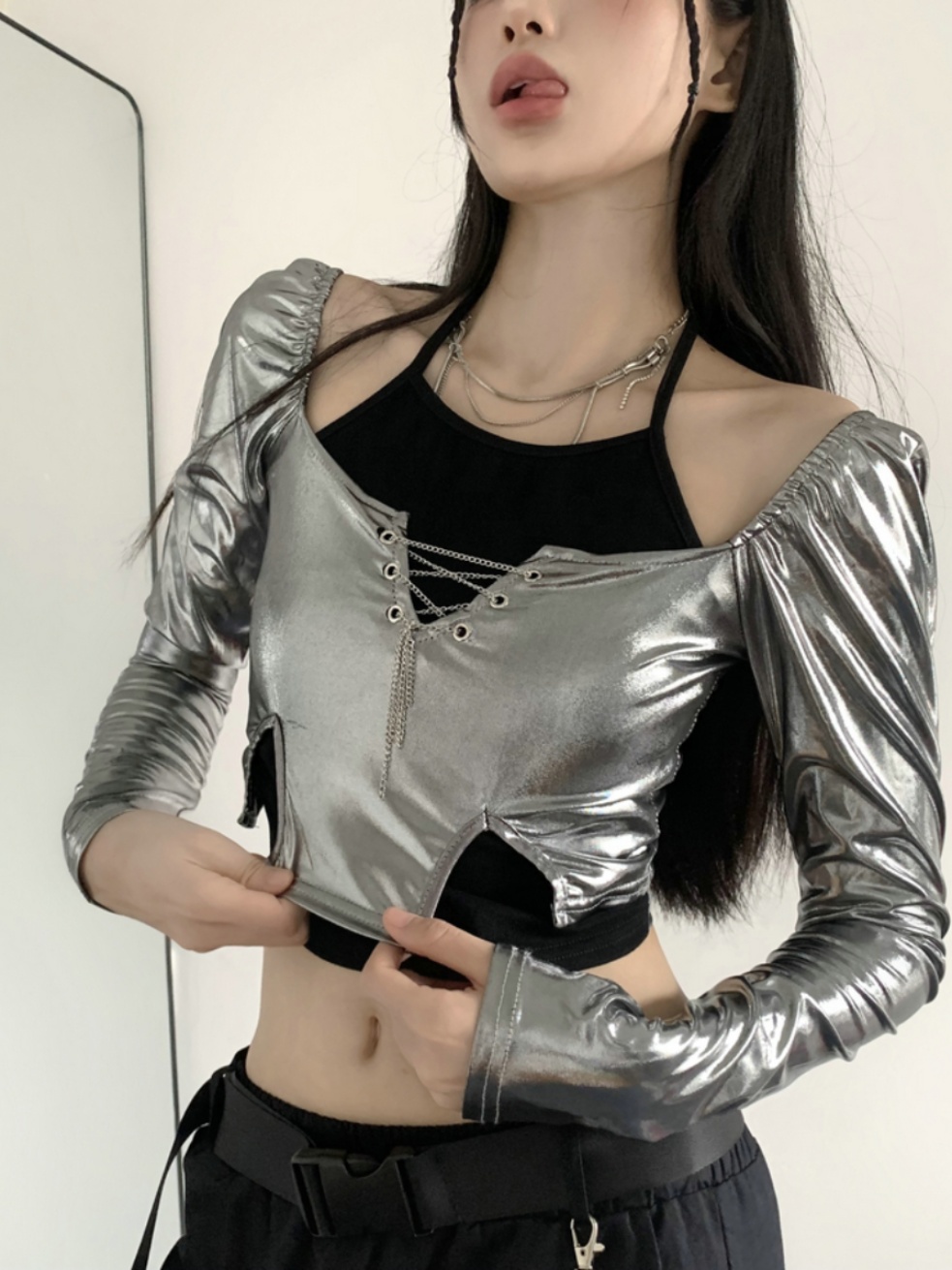 Elevate your dance wardrobe with our Silver Bling Neck-Hanging Spliced Two-Piece Long Sleeve Women’s Jazz Dance Top, designed for the bold and fashionable. This sexy Y2K style piece features a unique spliced design that flatters your figure and showcases your moves with every twirl. The shimmering silver accents catch the light, ensuring you stand out on stage or in the studio. Perfect for jazz dance or a night out, this top combines comfort and trendiness effortlessly. Don’t miss out on adding this statement piece to your collection shop now!