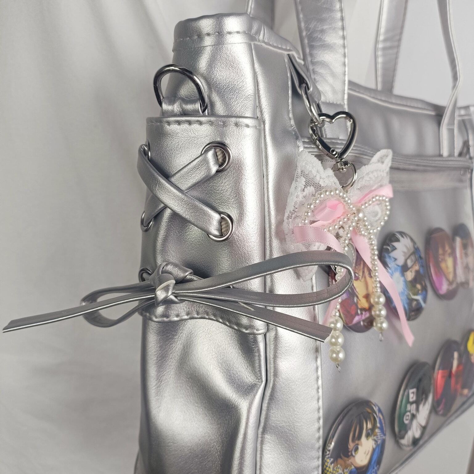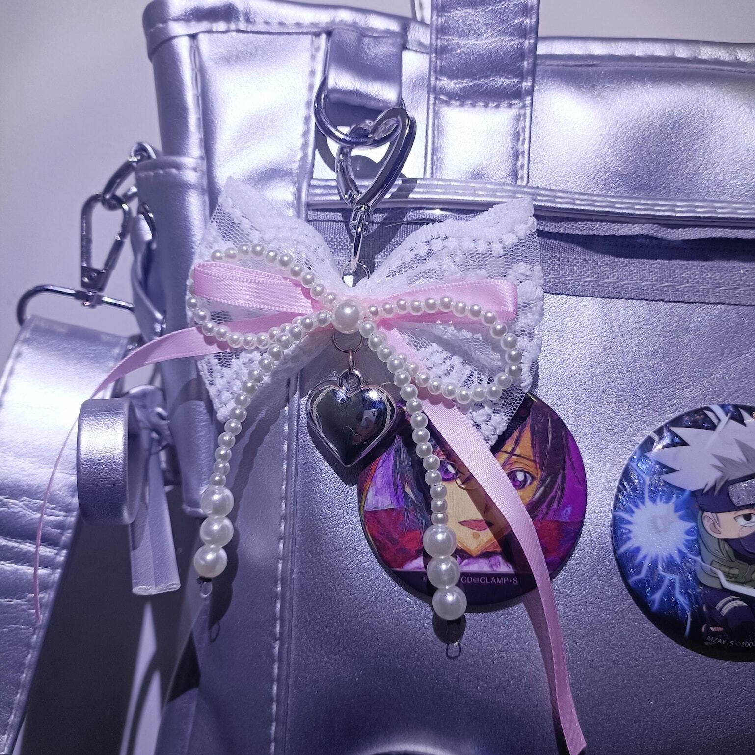 The bag and pearl bow charm are both handmade. The bag has ribbons on the sides, and whether the ribbons are loose or tied into a bow shape, they are very unique.