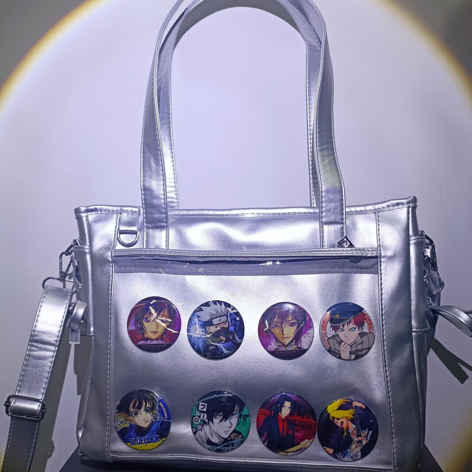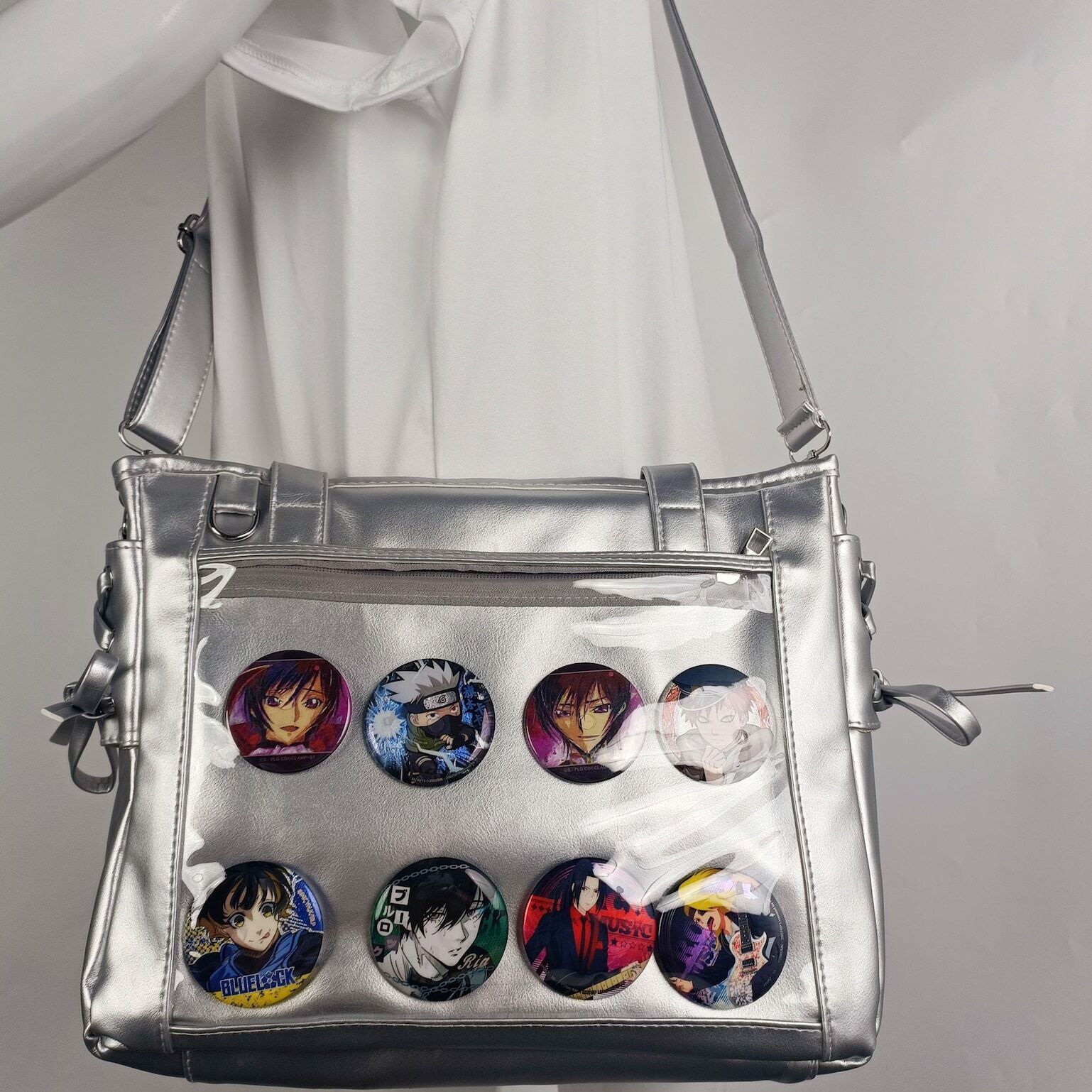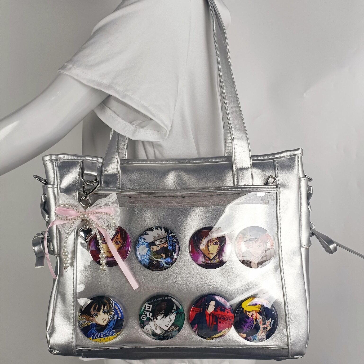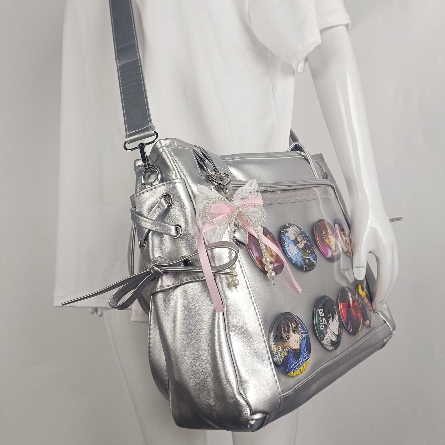 Silver Ita Crossbody Bag with Clear Window and Included Insert for Pin Display combines everyday carry with a clear display area for pins, badges, charms, or character merch.