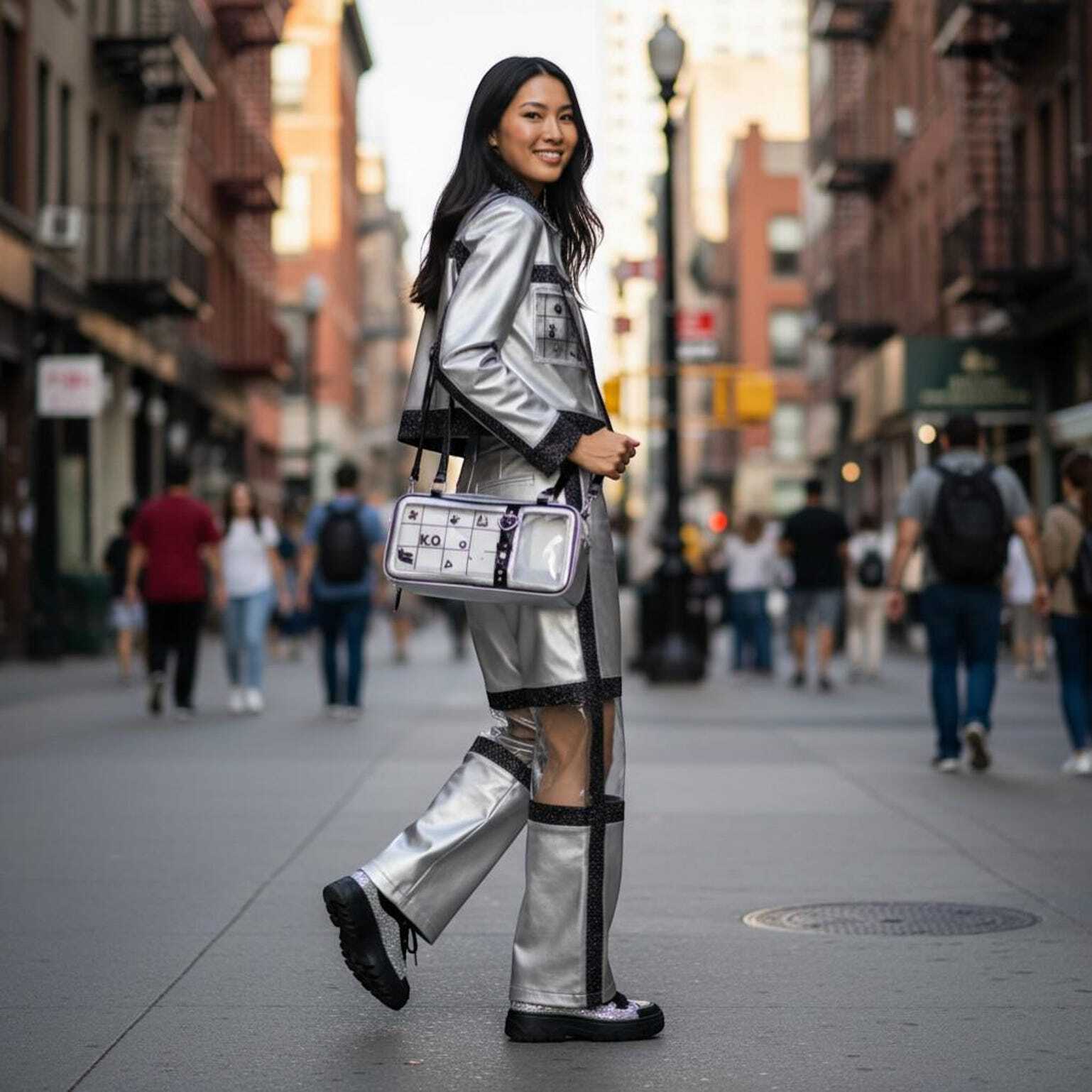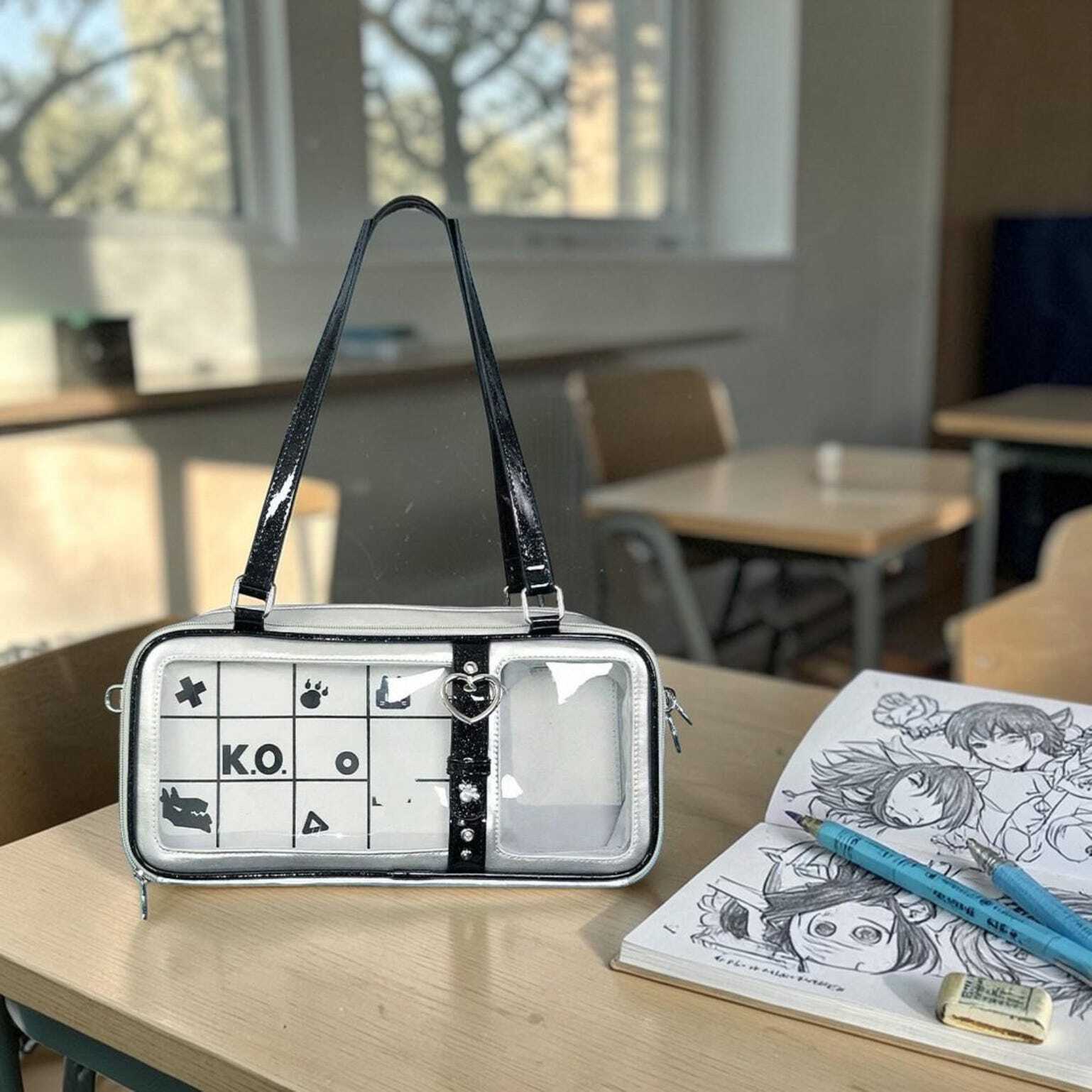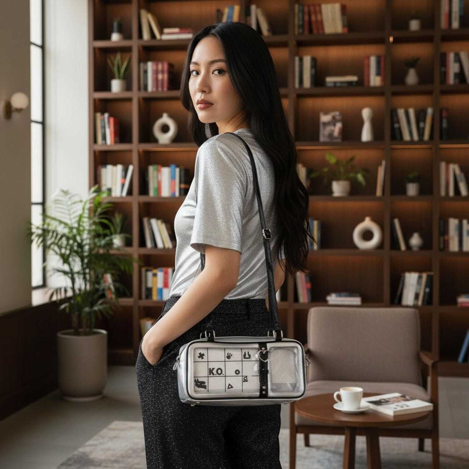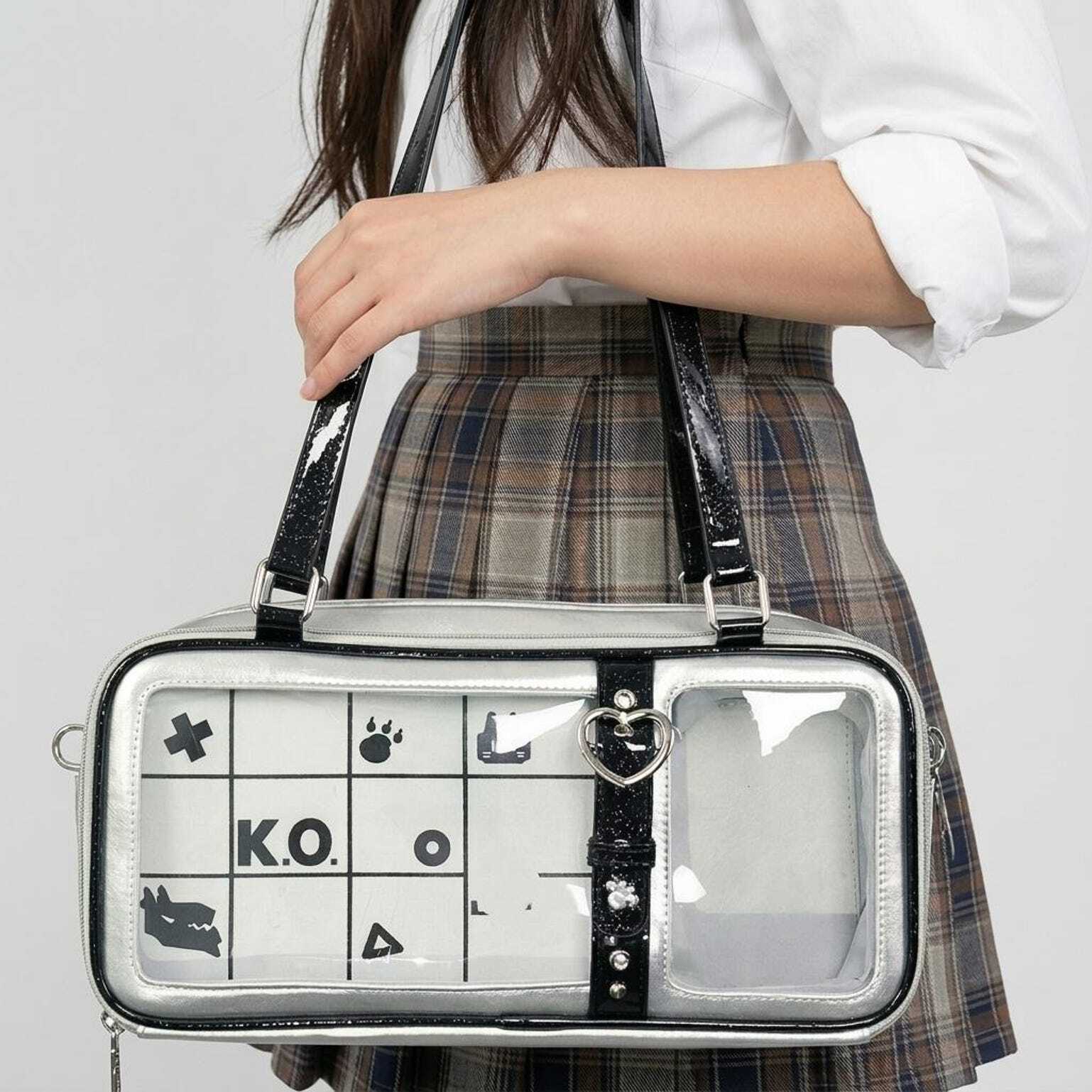 Silver Kawaii Convertible Ita Bag for Pin Display combines everyday carry with a clear display area for pins, badges, charms, or character merch.