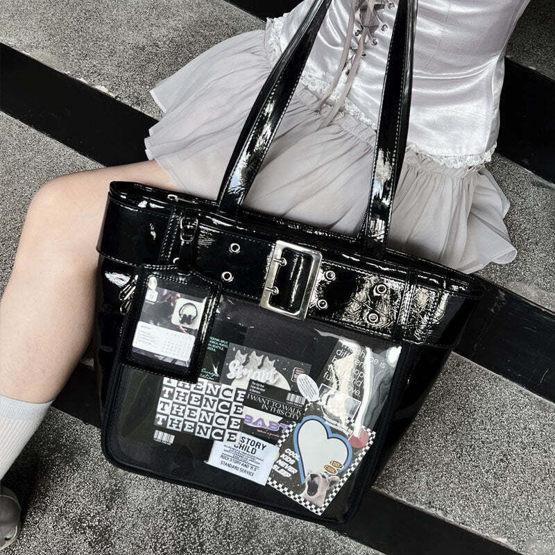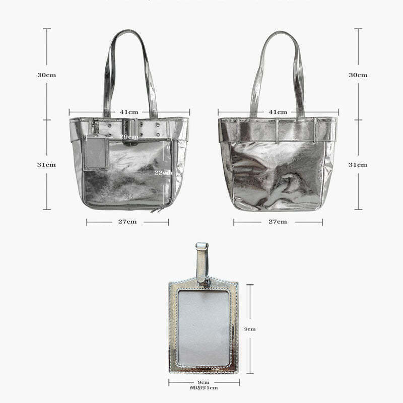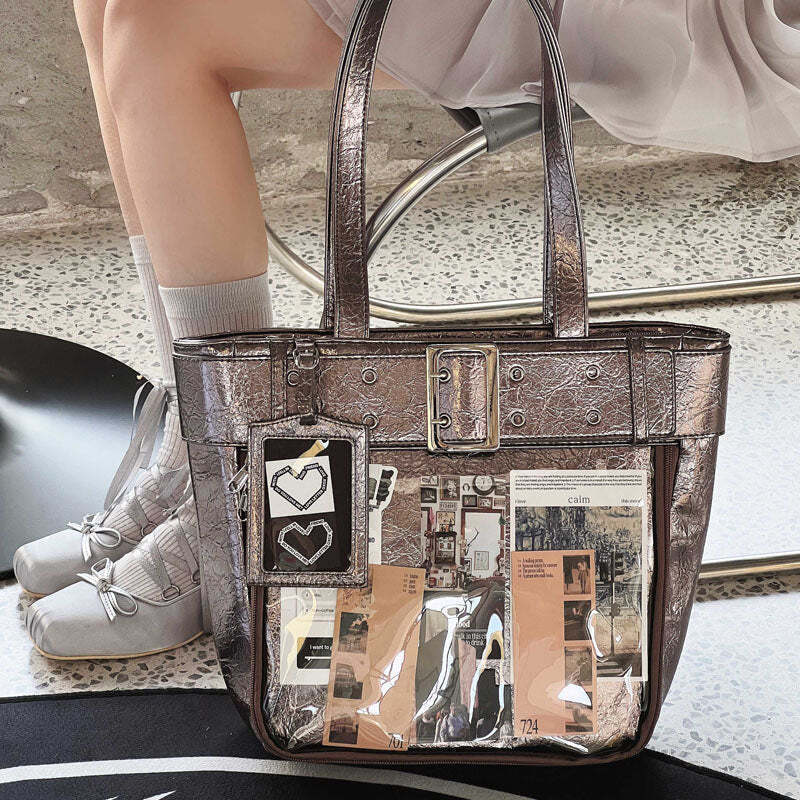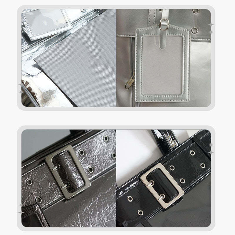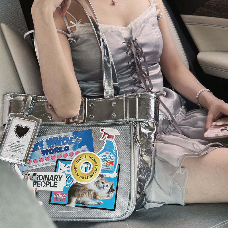 Silver Y2K Ita Tote Bag for Plushies and Pins is designed to display plushies, dolls, pins, and badges while keeping everyday essentials organized.