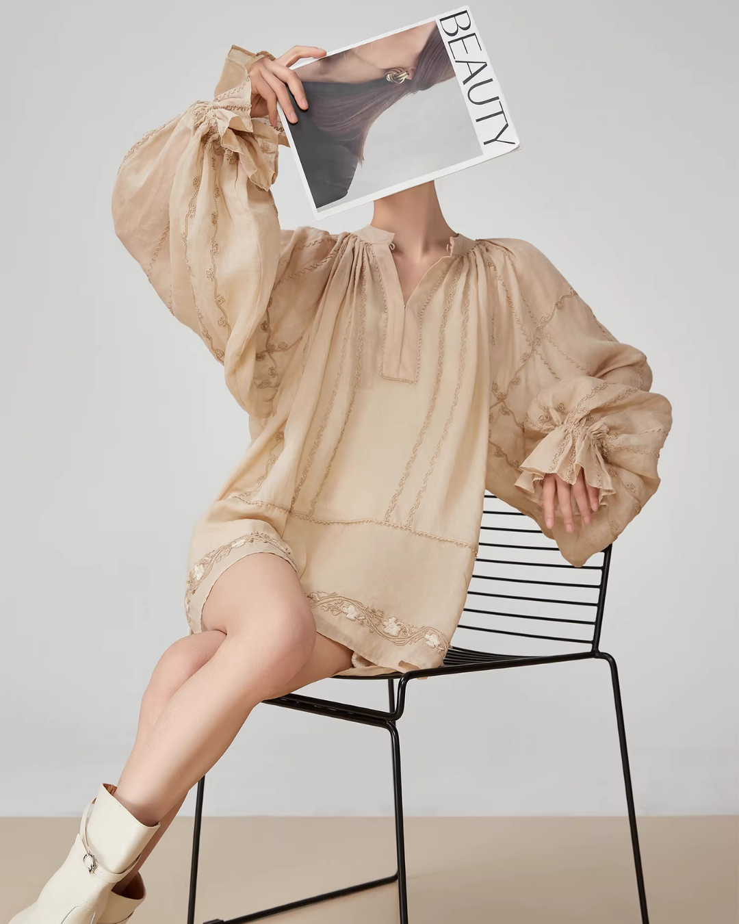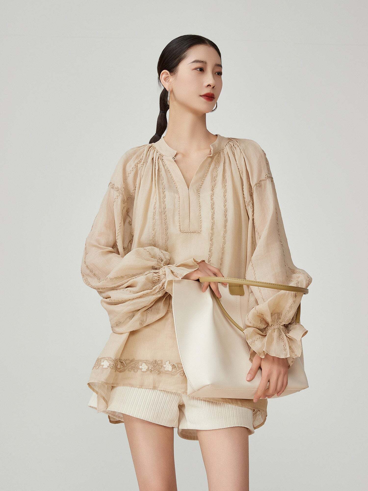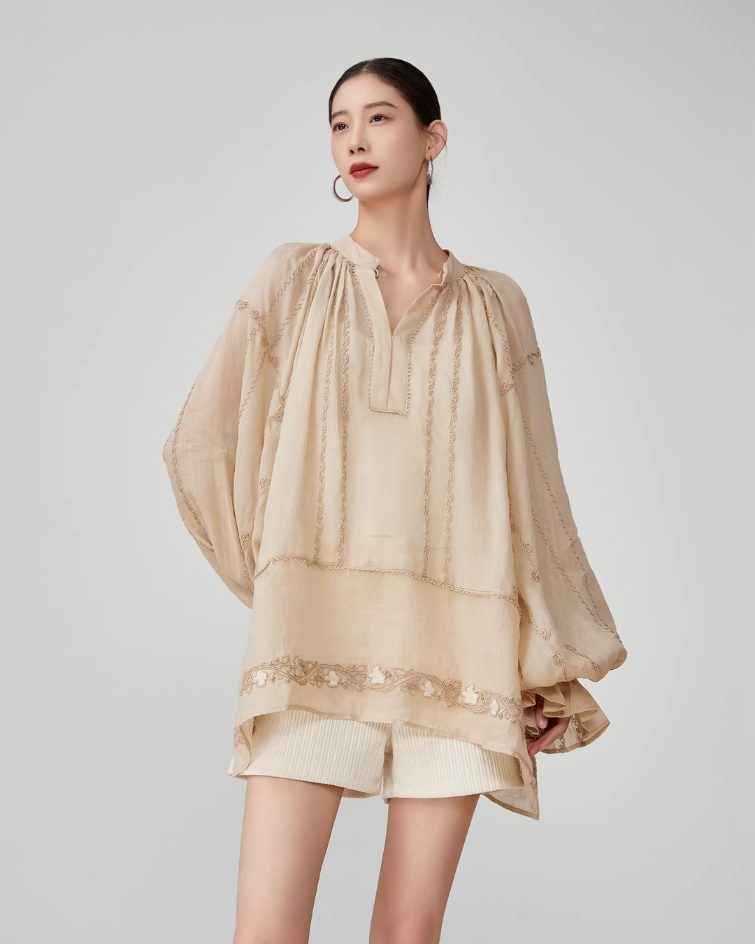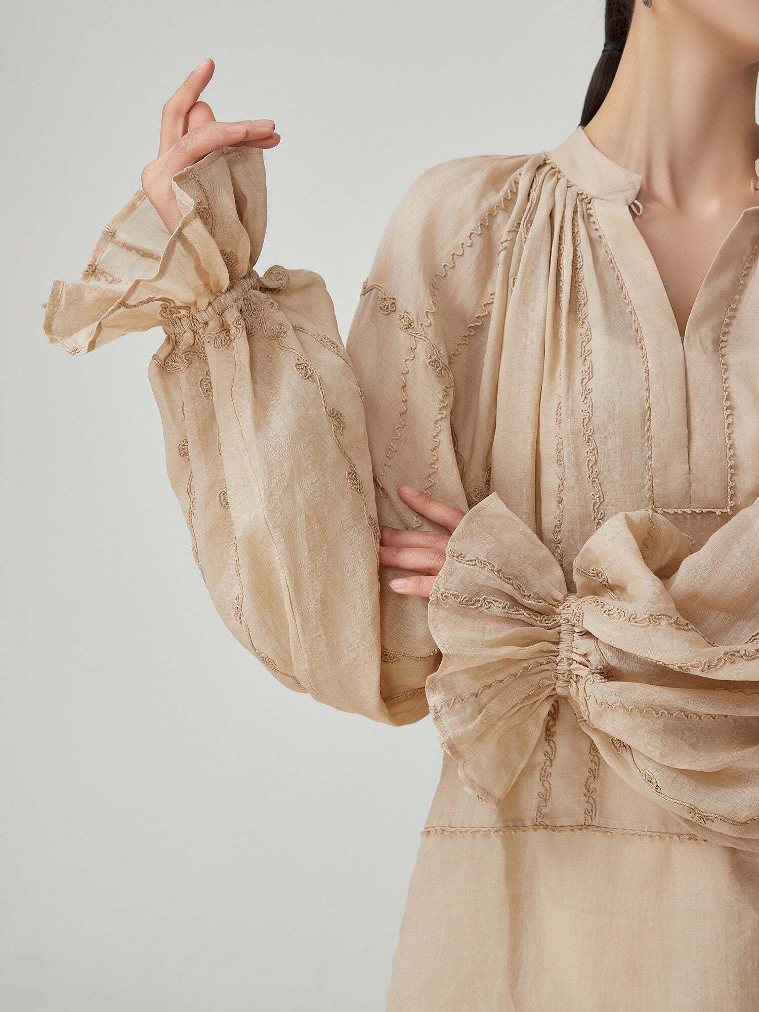 Voluminous sleeves enhance femininity.