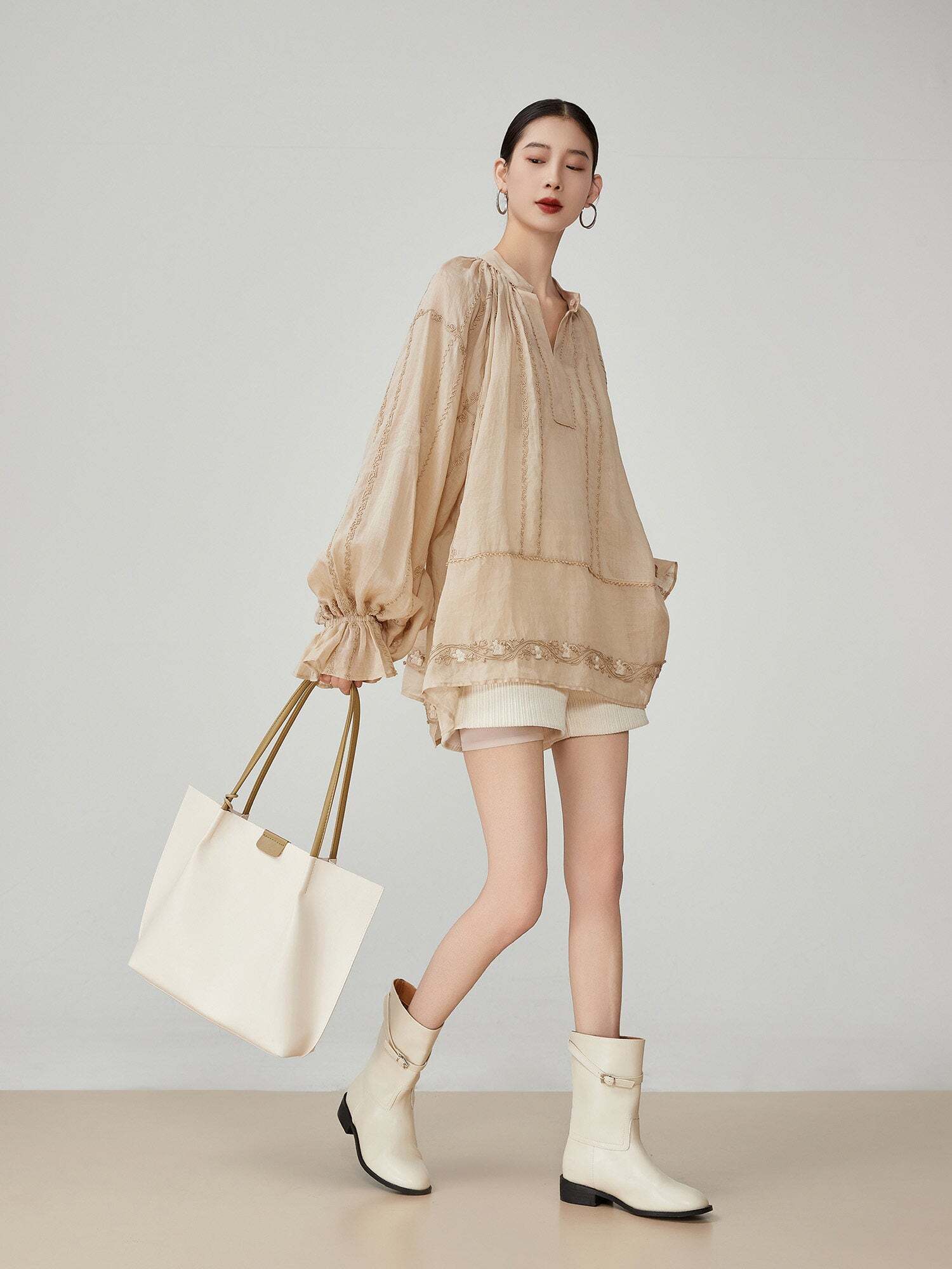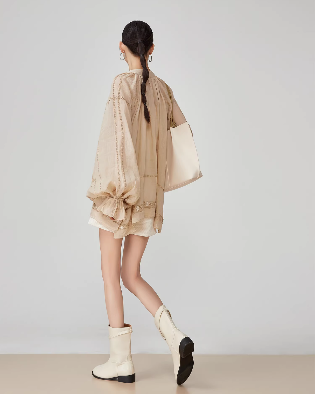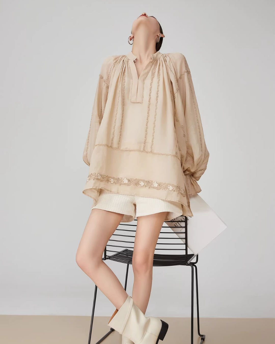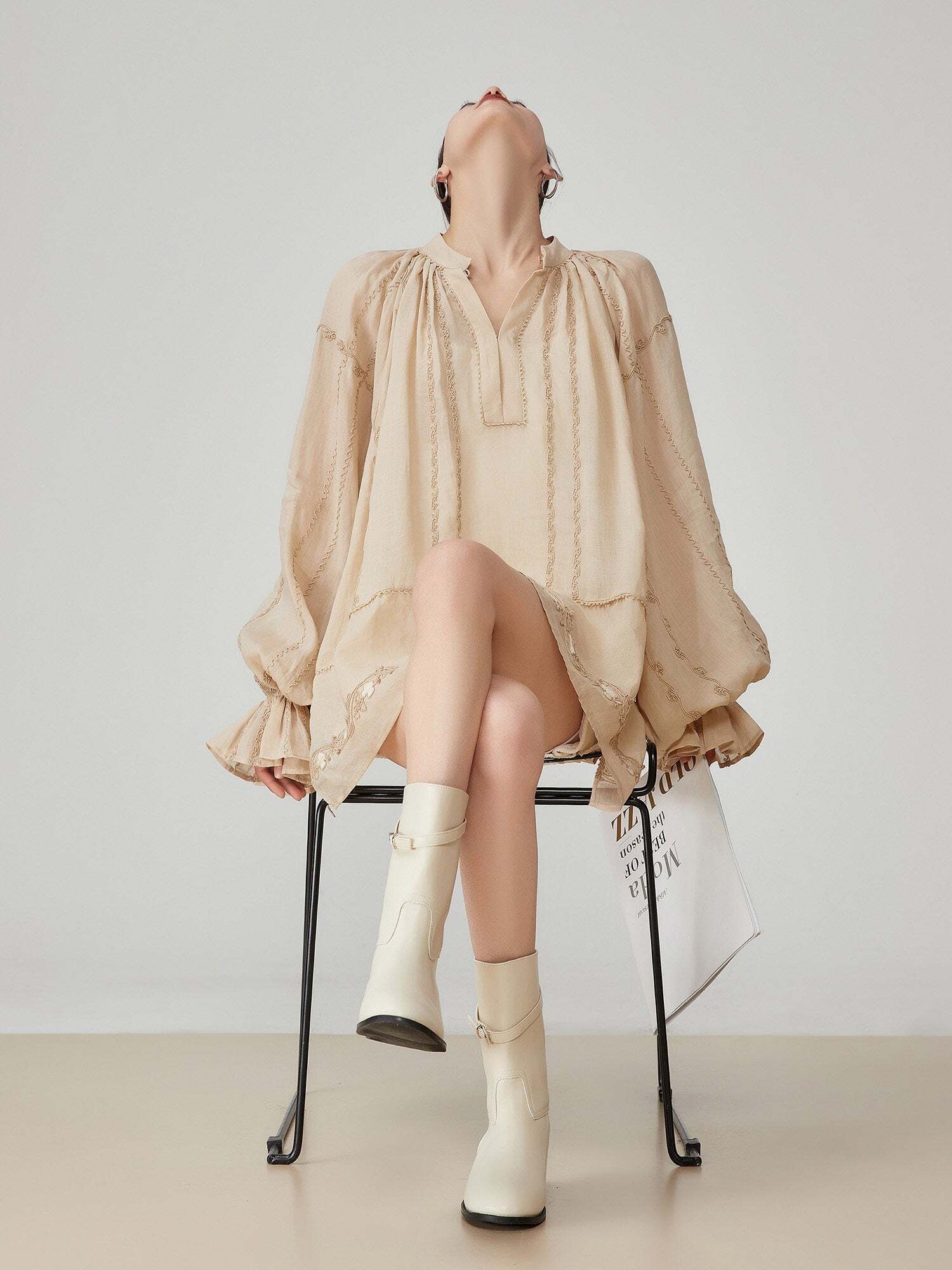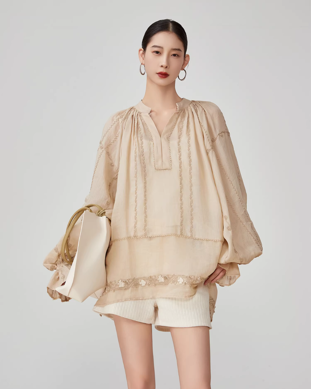 Voluminous sleeves enhance femininity.