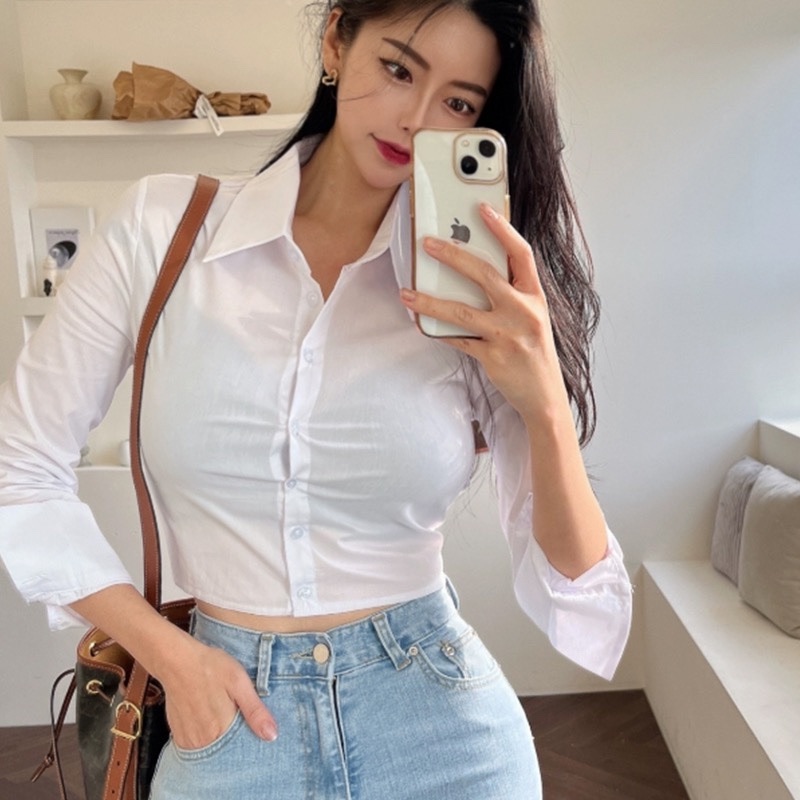 Elevate your wardrobe with our Solid Color Slim Fit Sexy Short Long Sleeve Blouse, designed with a chic collar and an alluring exposed waist. This versatile Korean-style top effortlessly combines sophistication and edginess, making it perfect for both casual outings and dressier occasions. Crafted for a flattering fit that accentuates your silhouette, this blouse pairs beautifully with skirts, jeans, or shorts. Don’t miss out on this essential addition to your fashion collection add to your cart today!