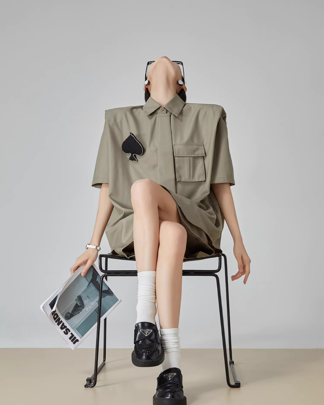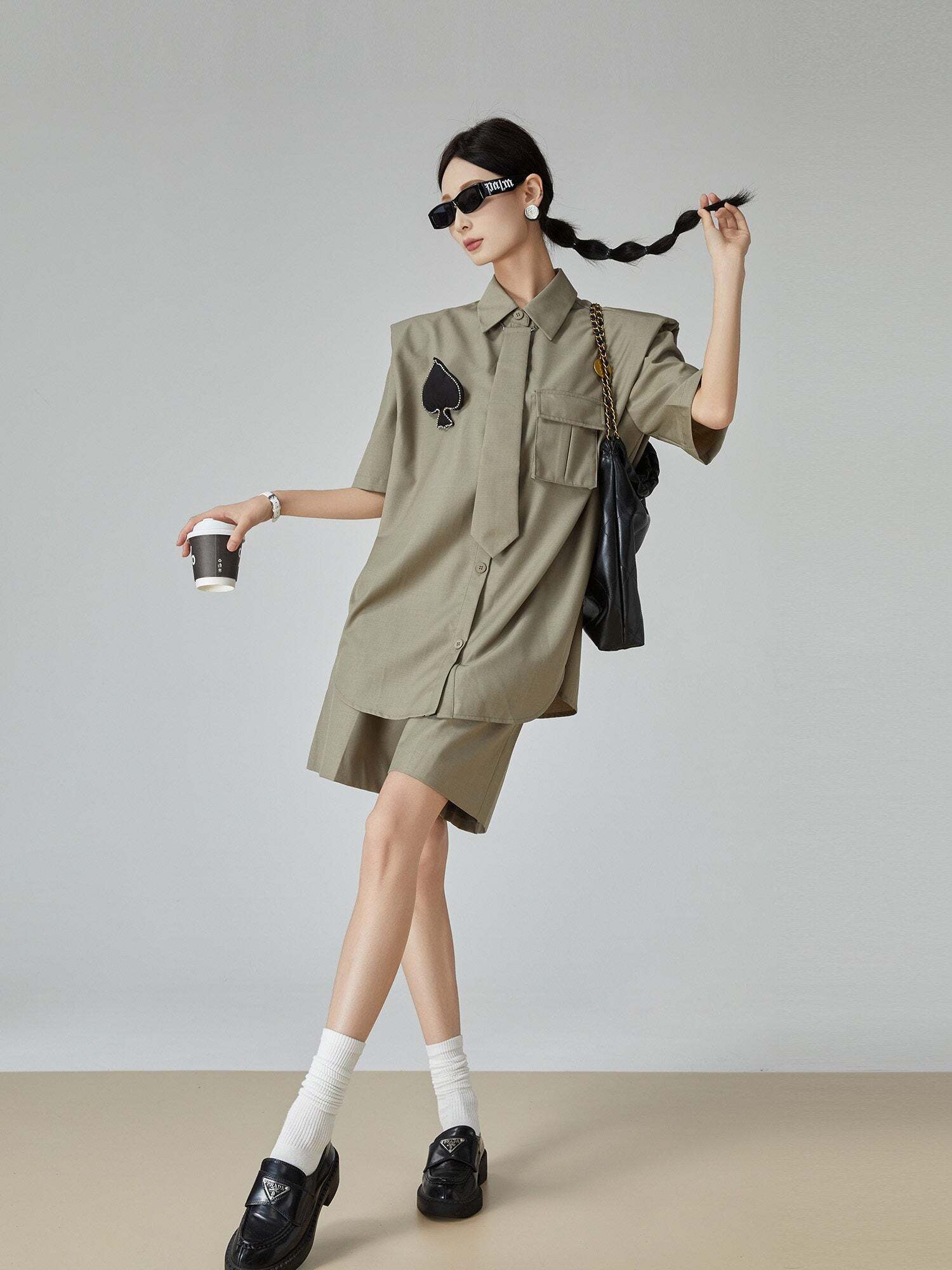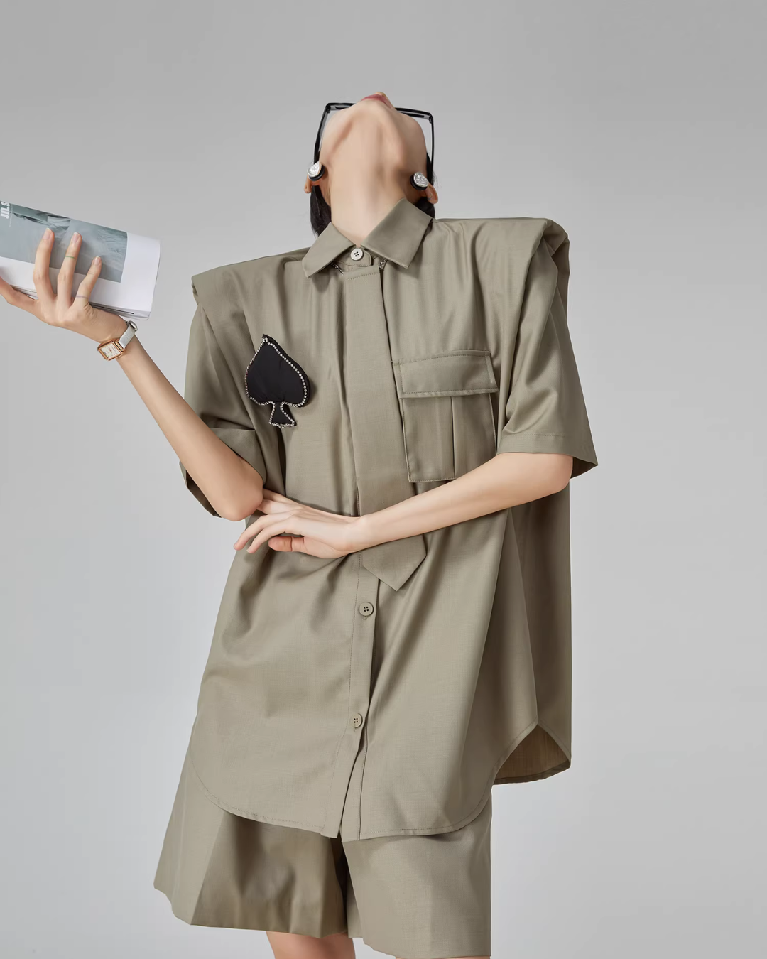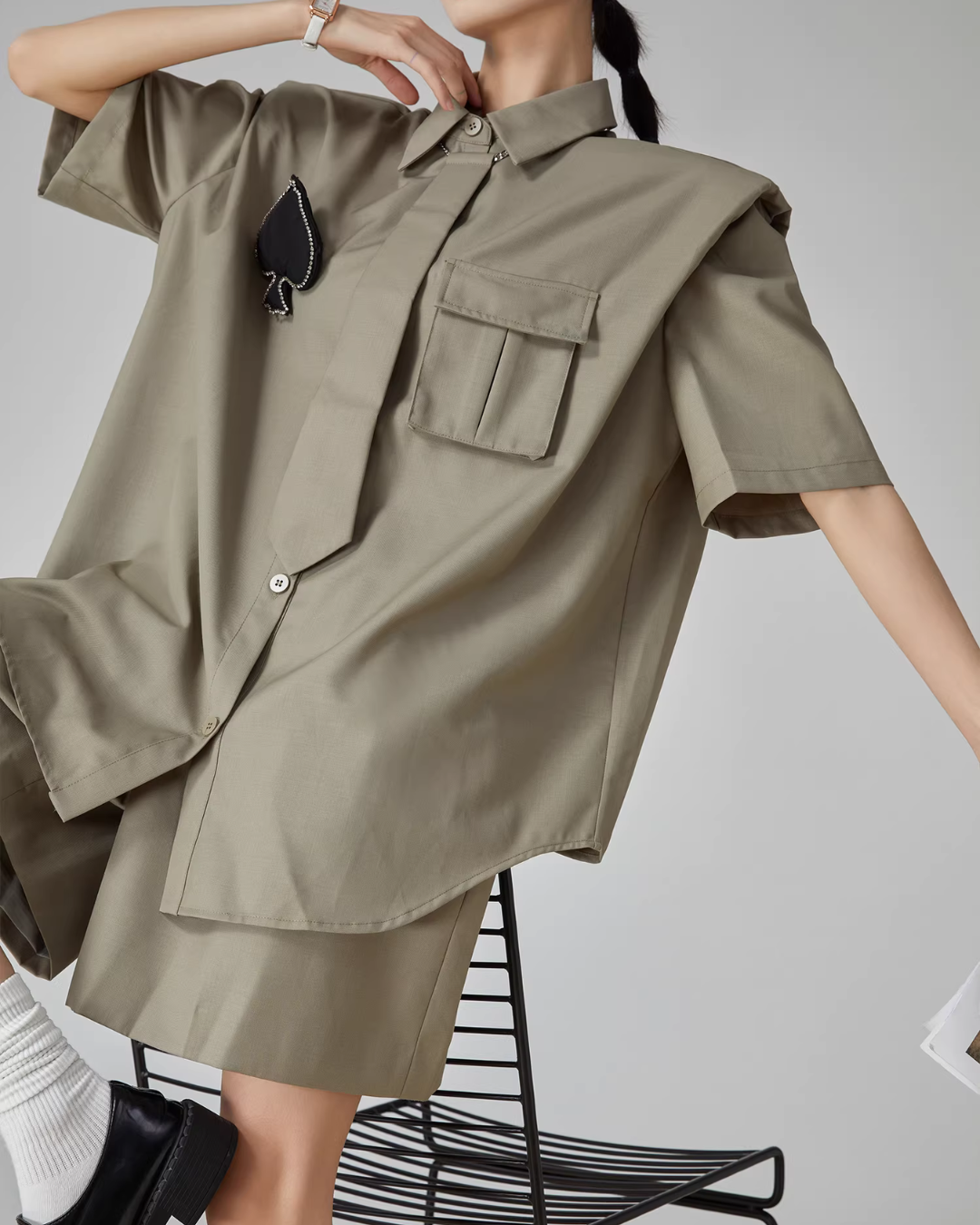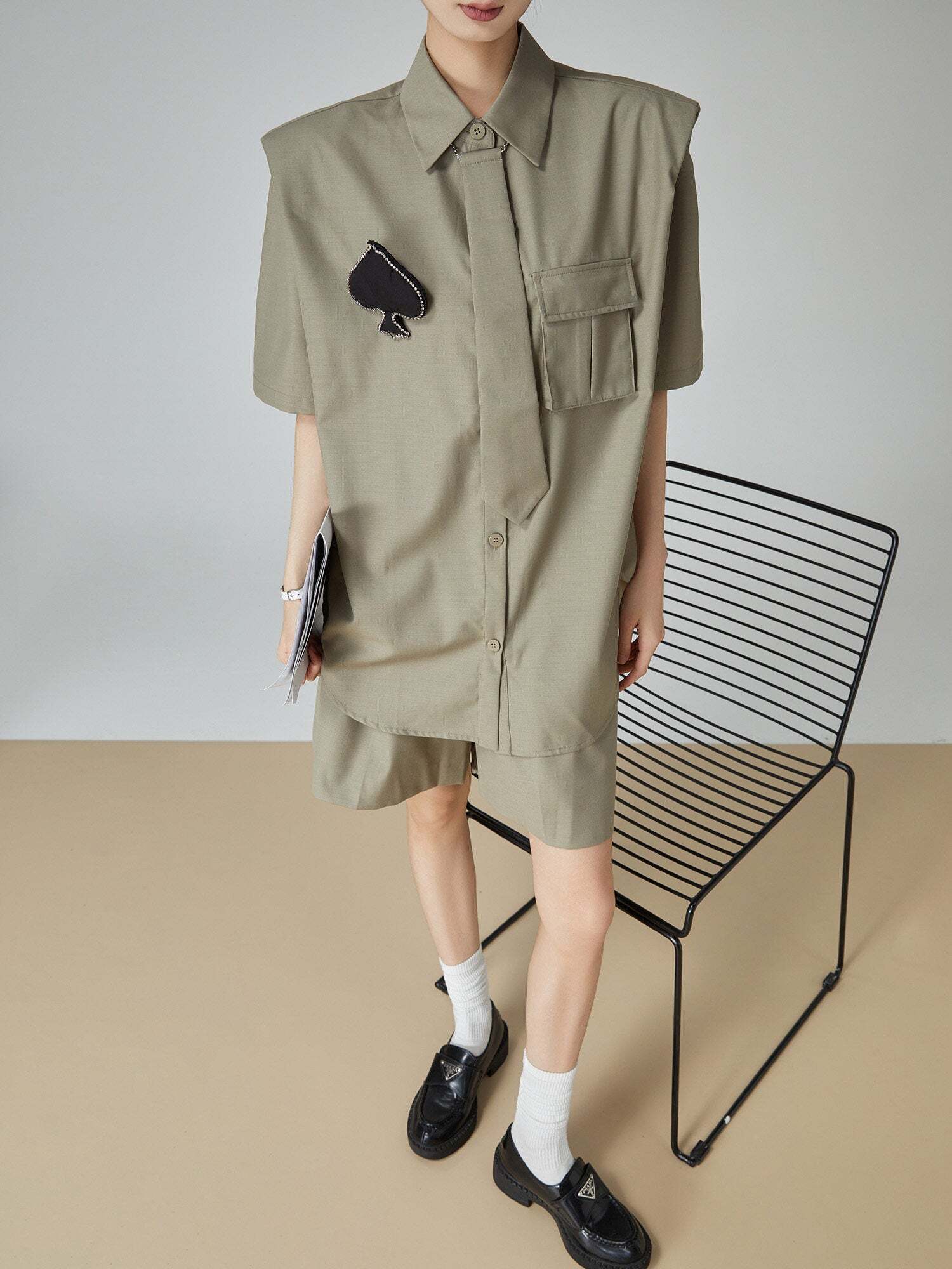 A setup of a shirt and shorts with a spade patch and tie that makes a strong impression.