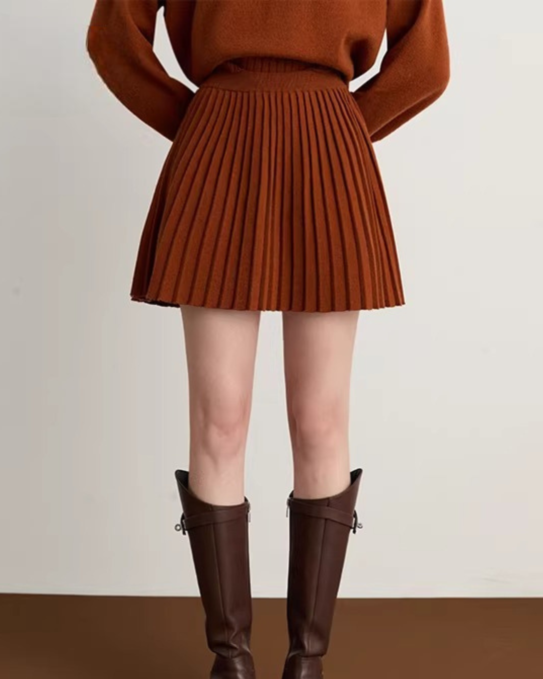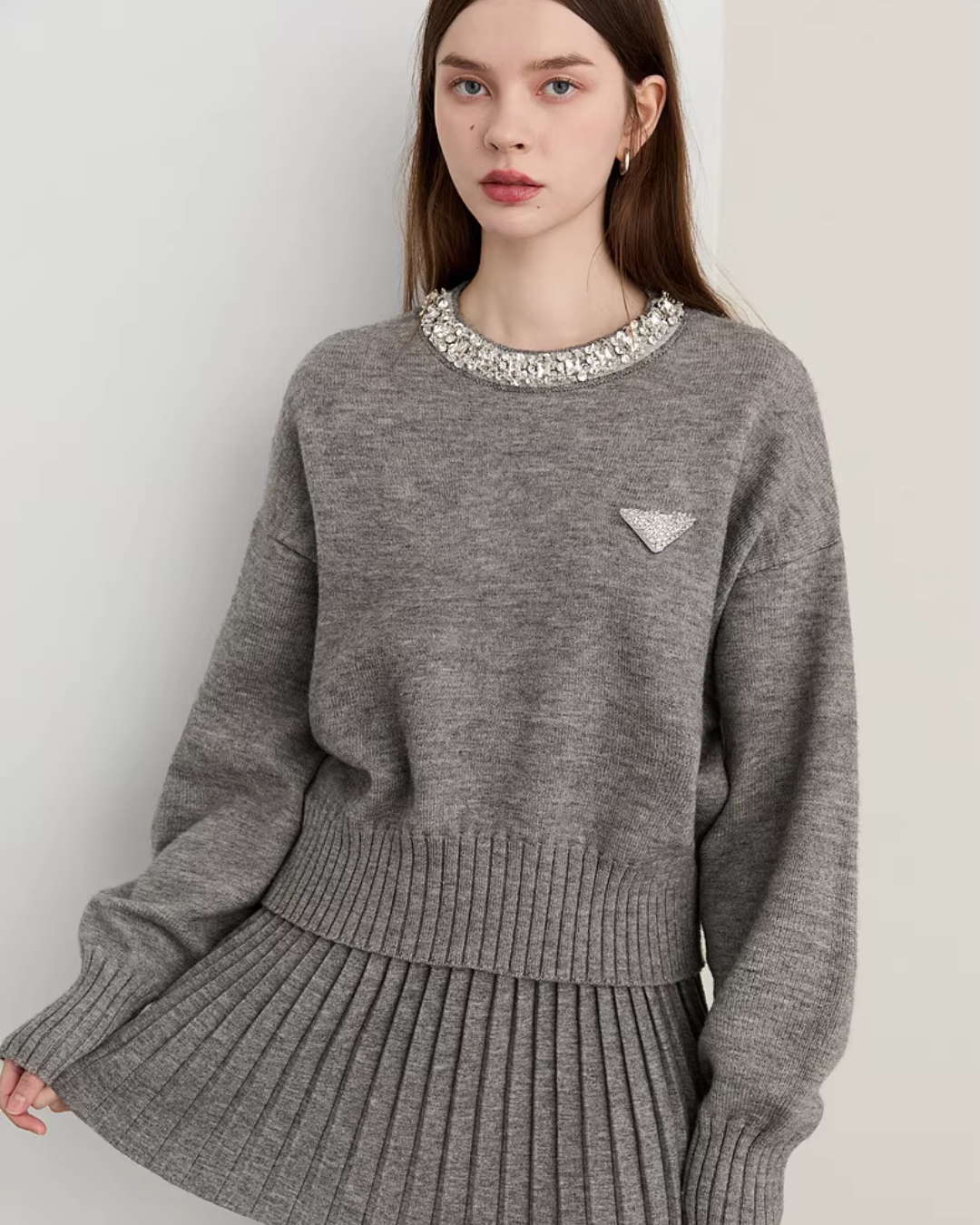 A set-up with a gentle texture knit top and skirt that looks great when worn.