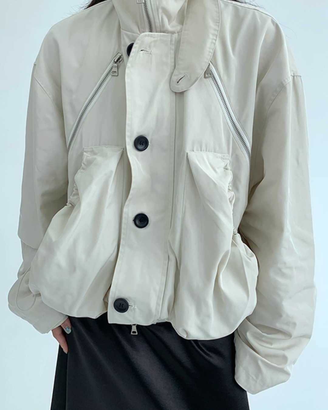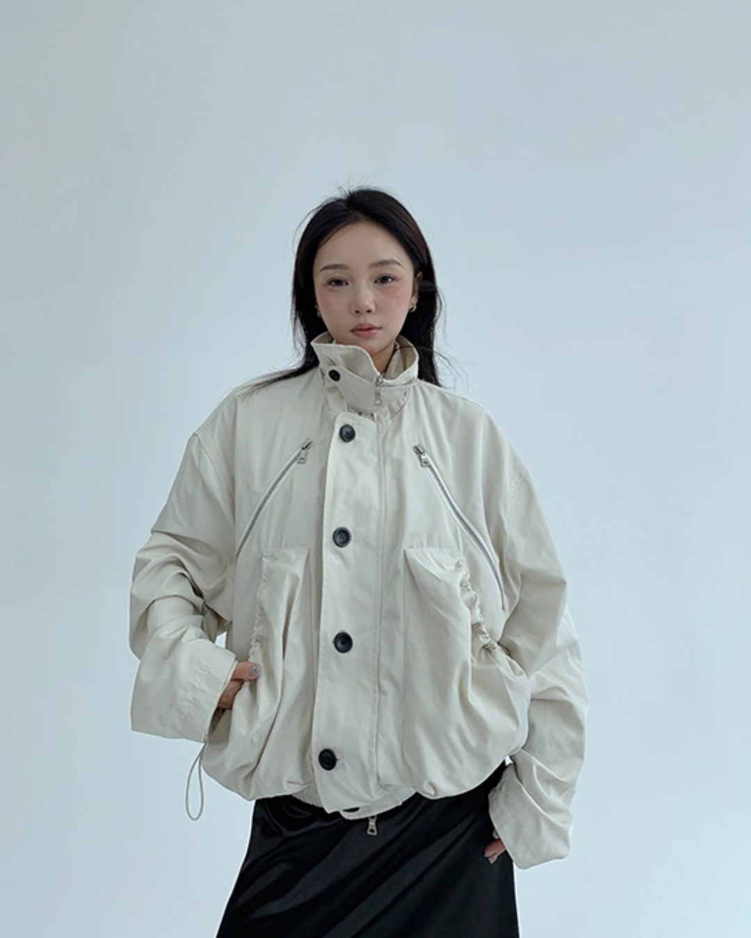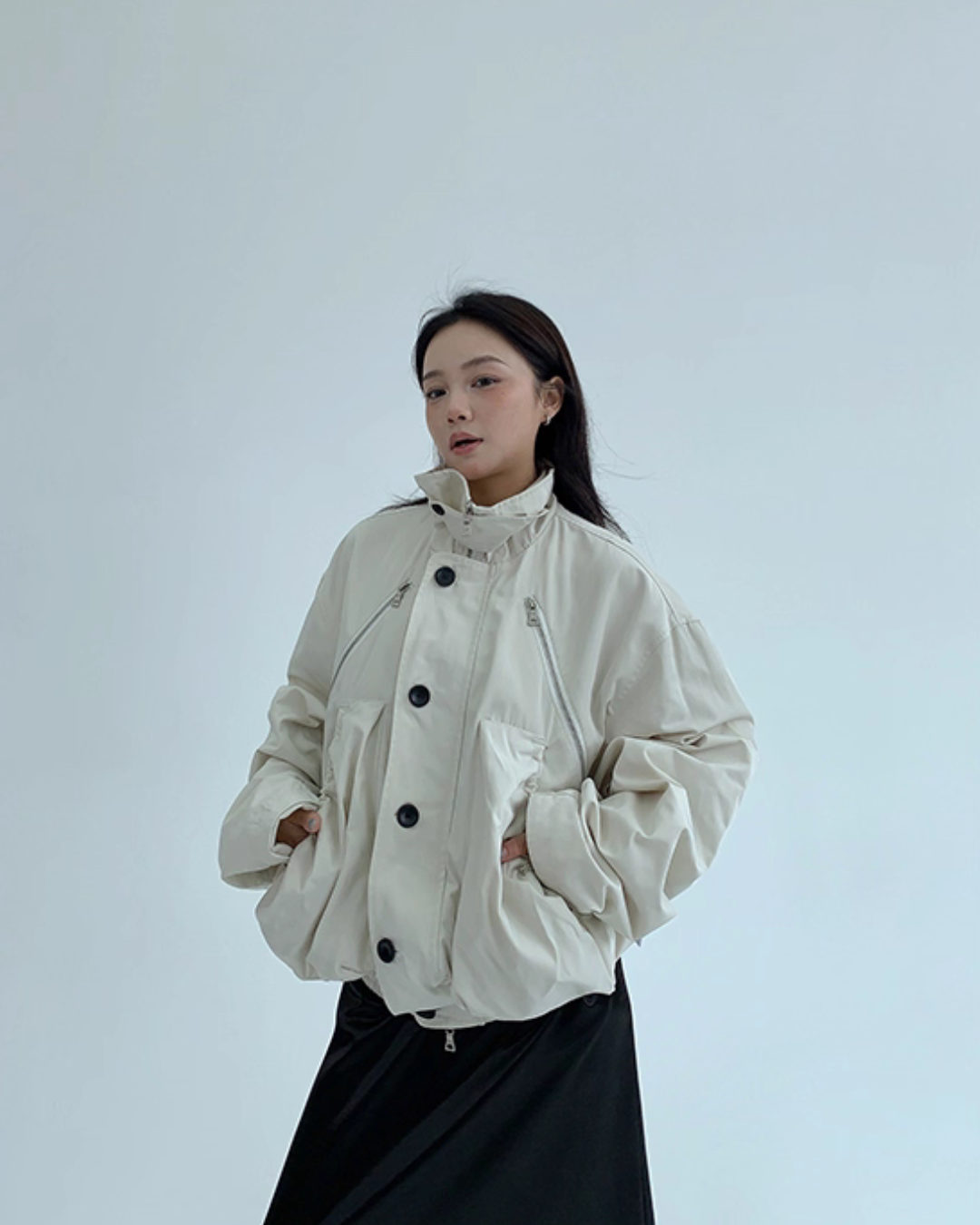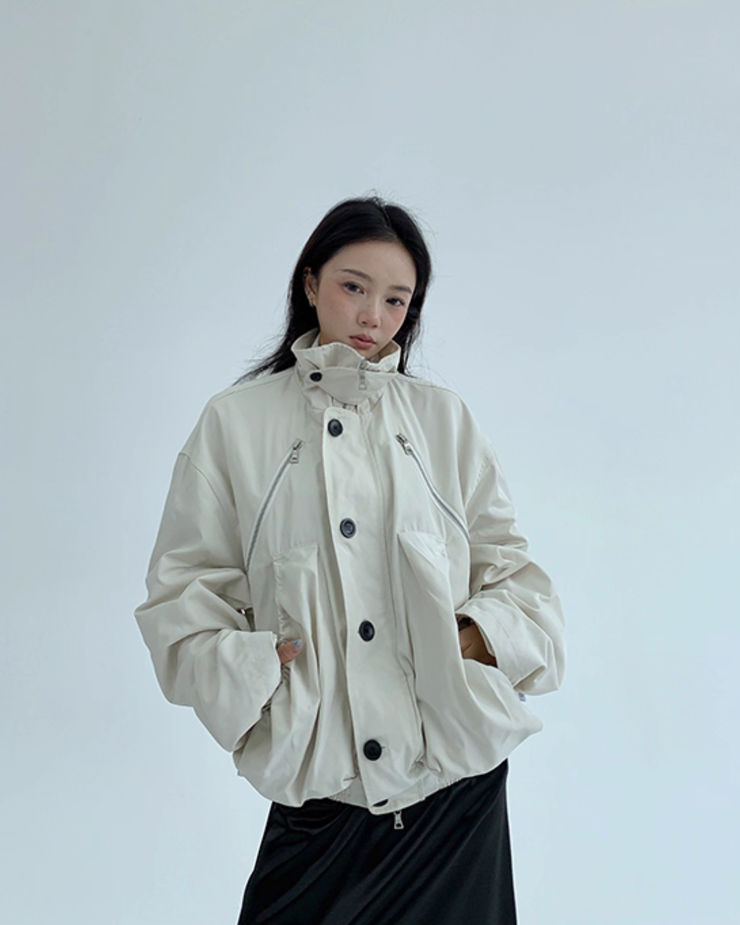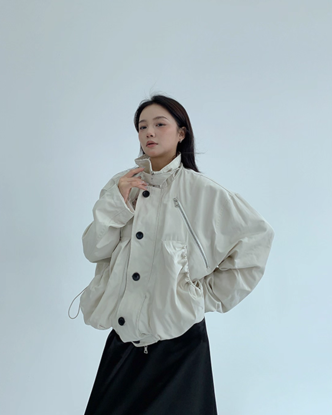 An elegant design with a stand collar that keeps the neck warm.