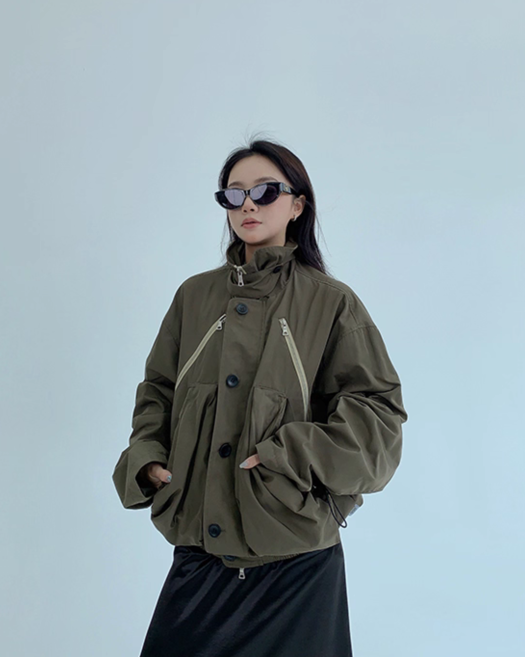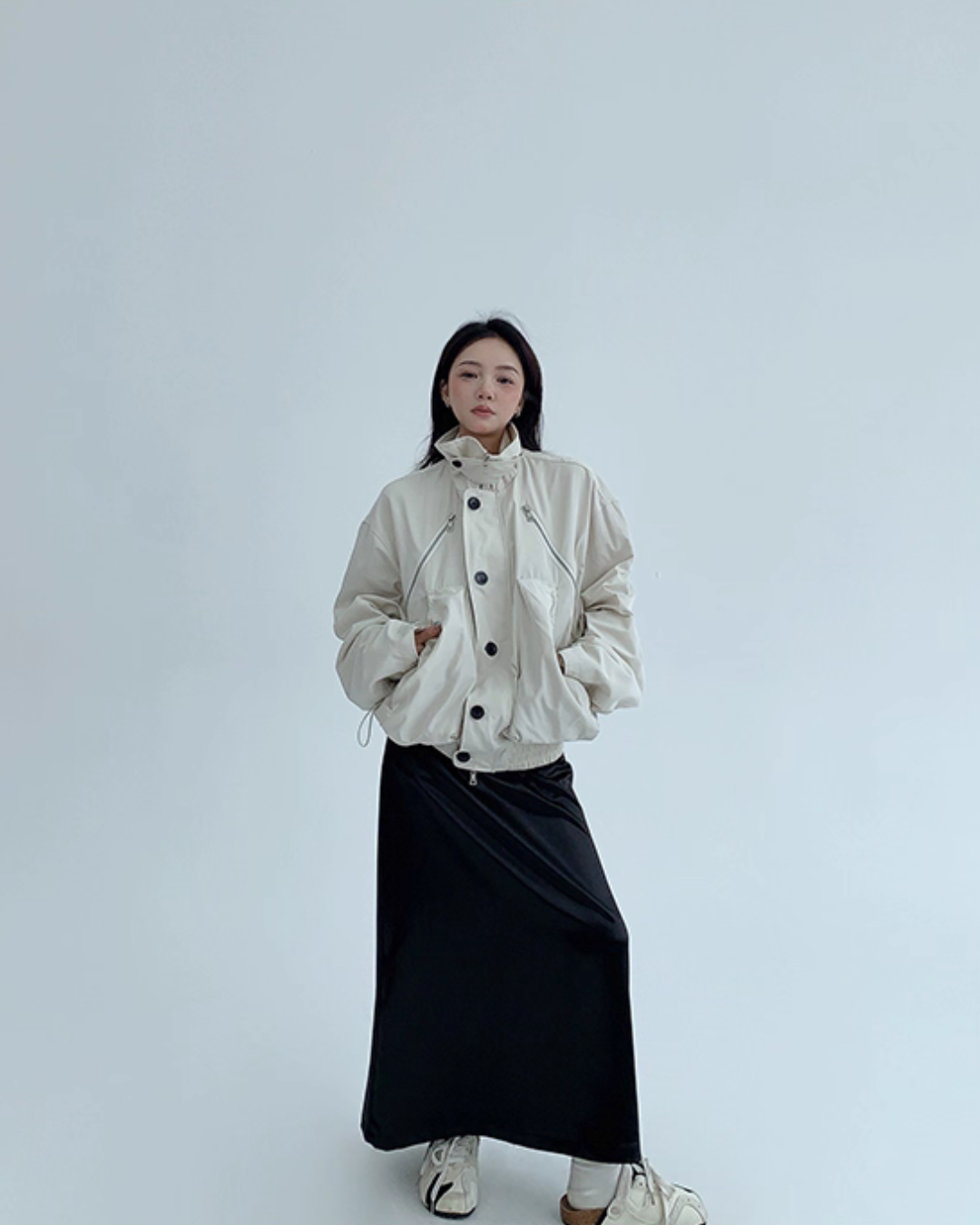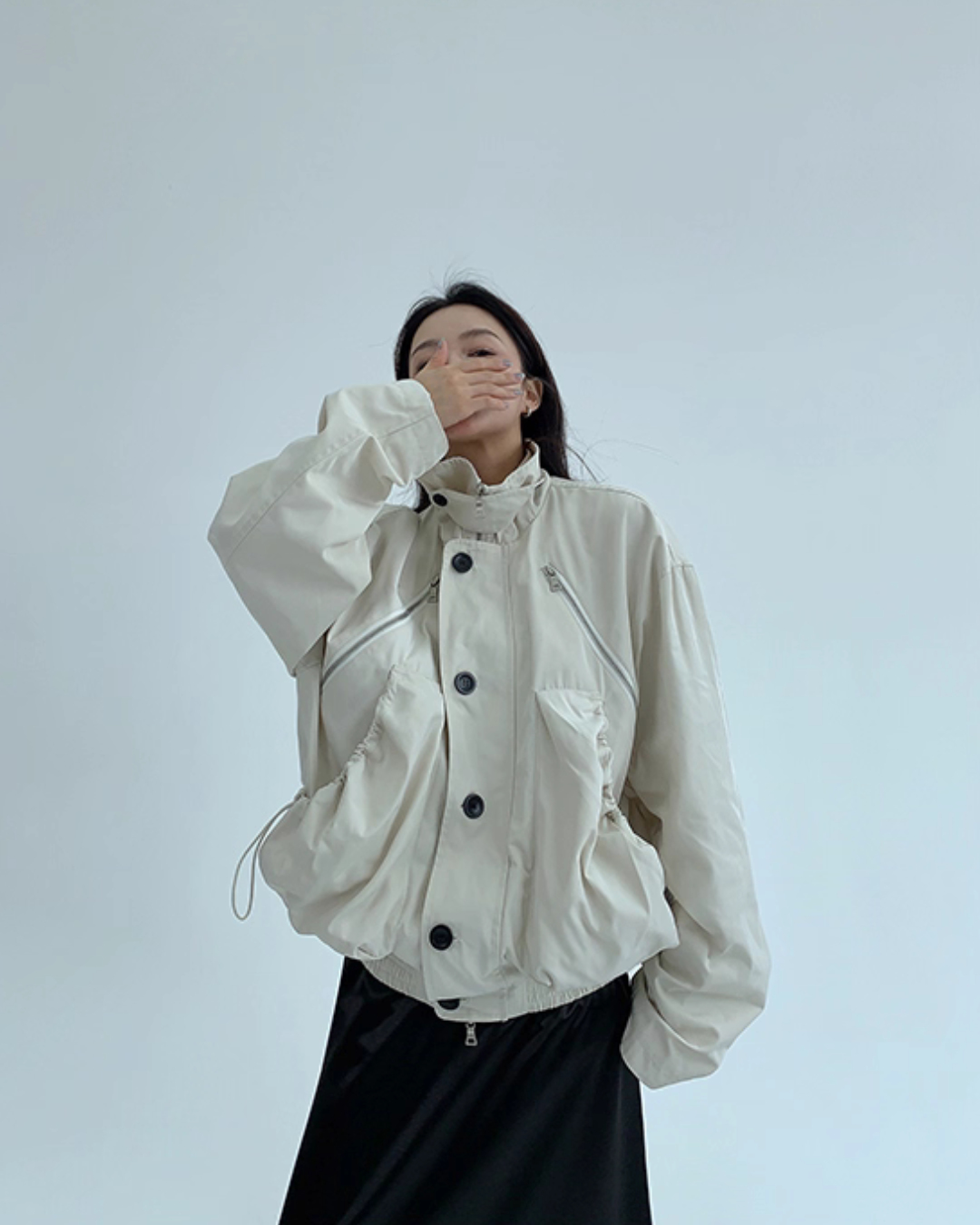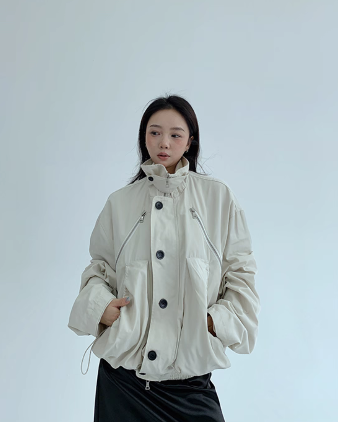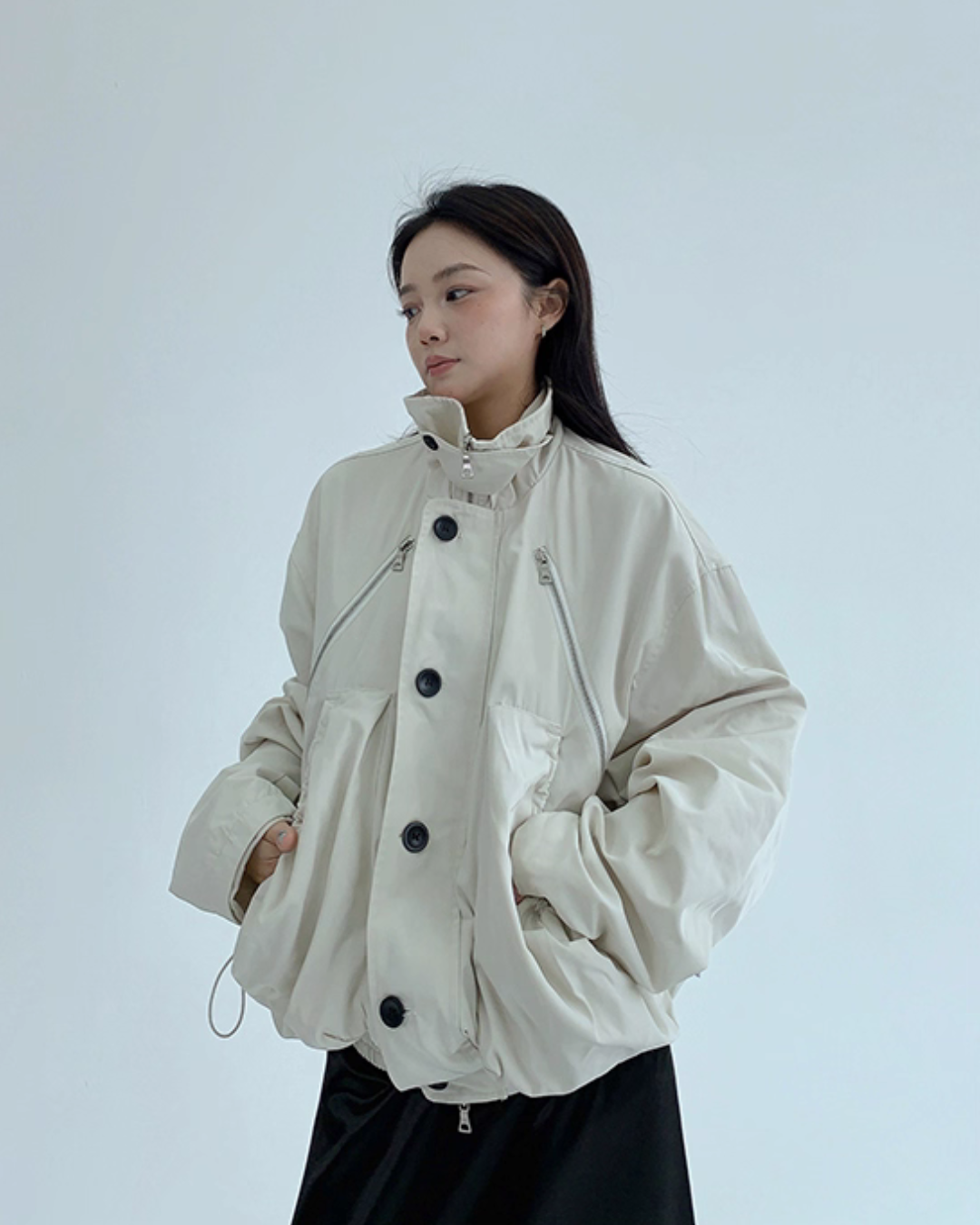 An elegant design with a stand collar that keeps the neck warm.