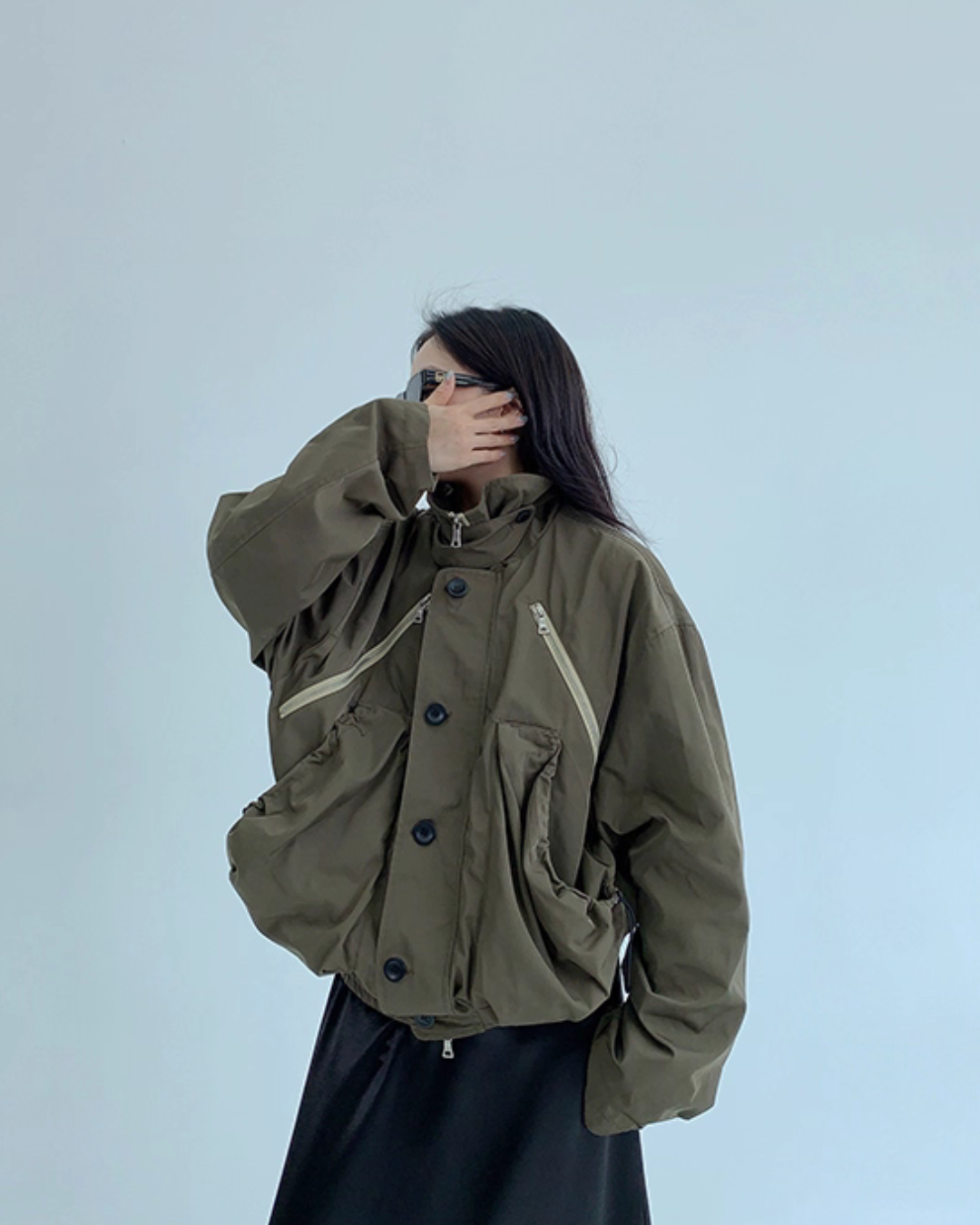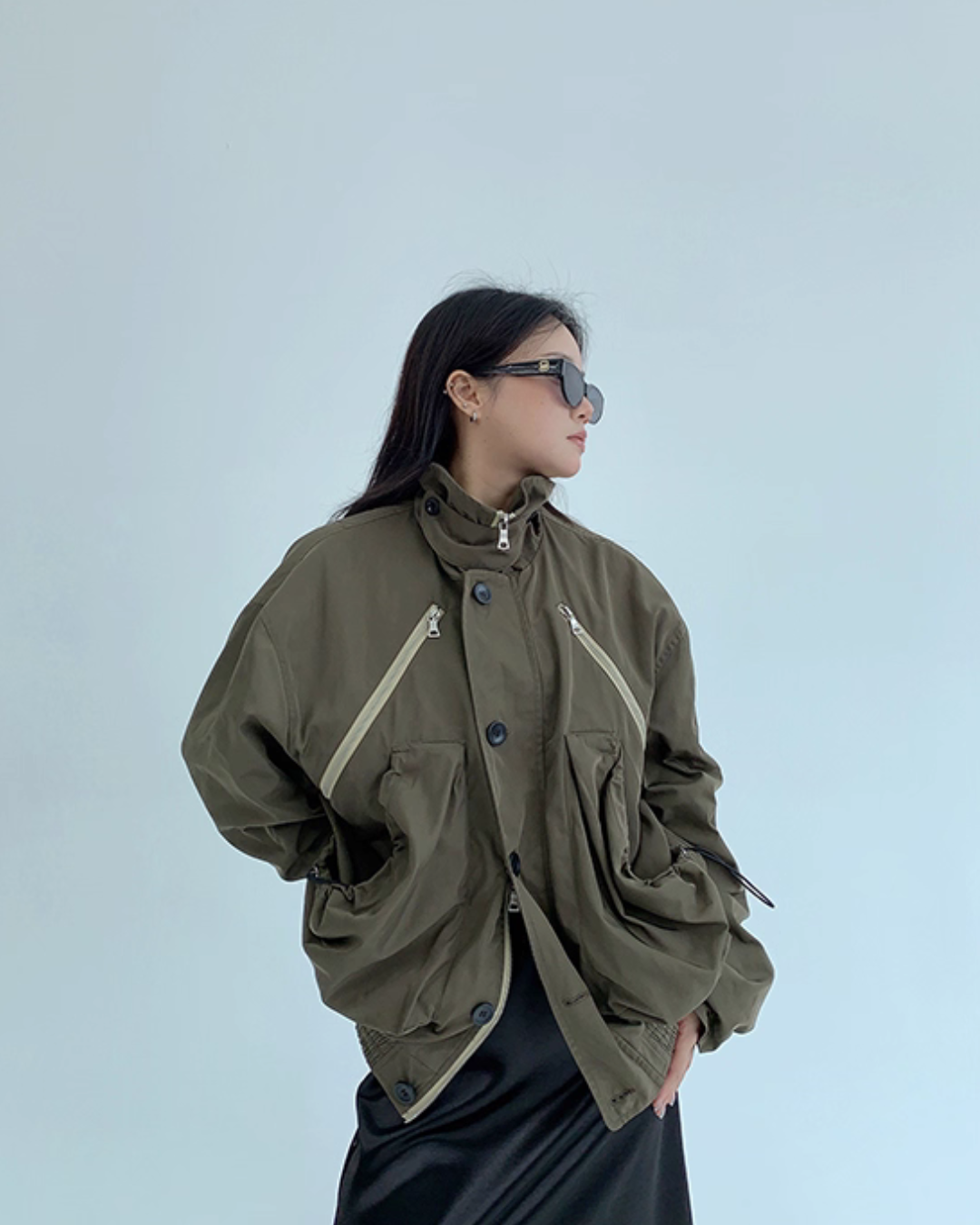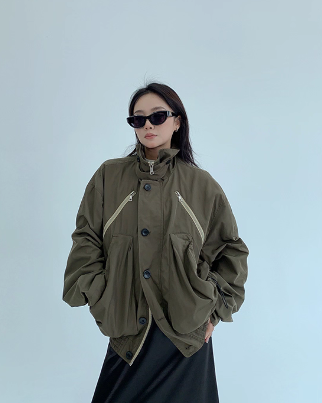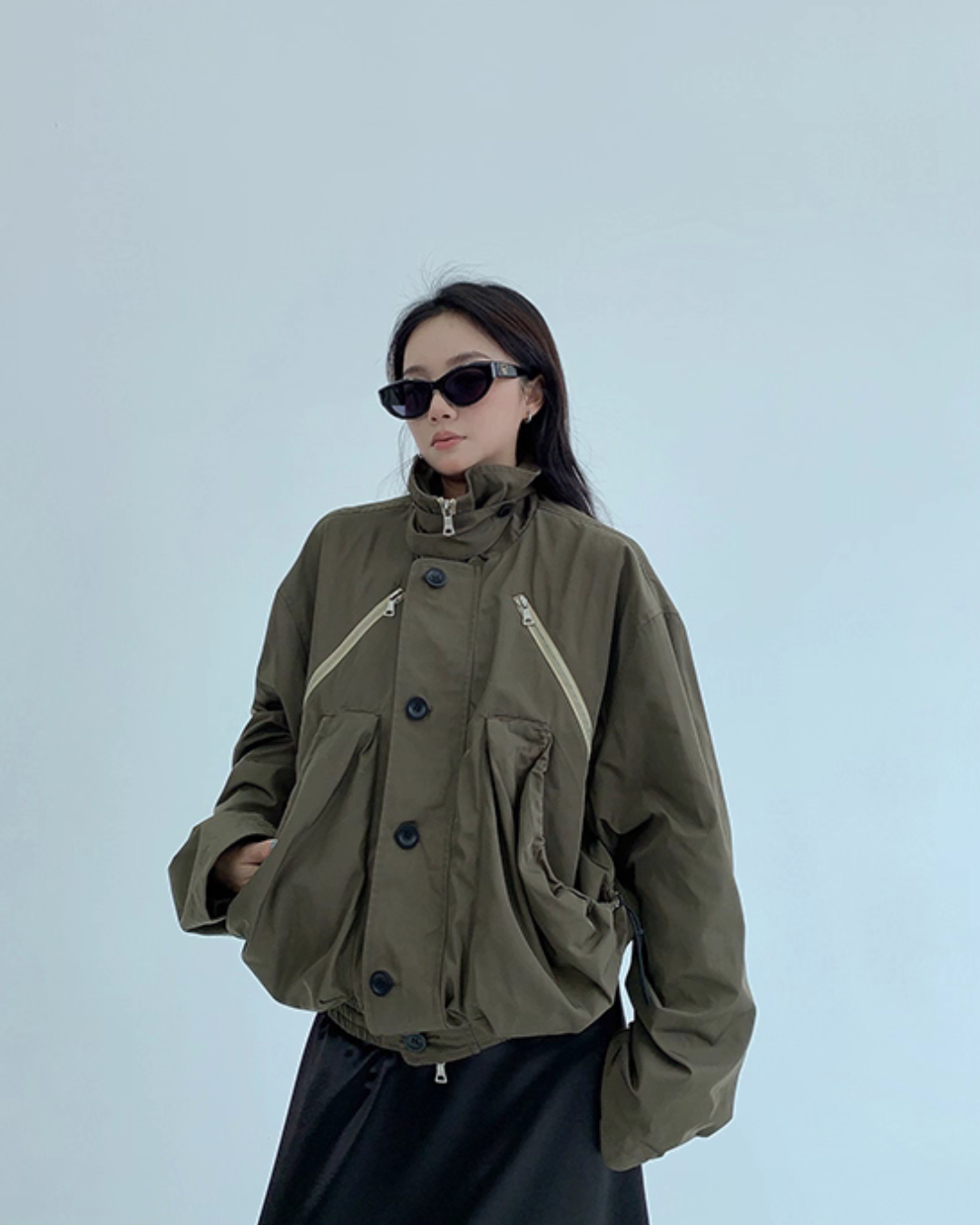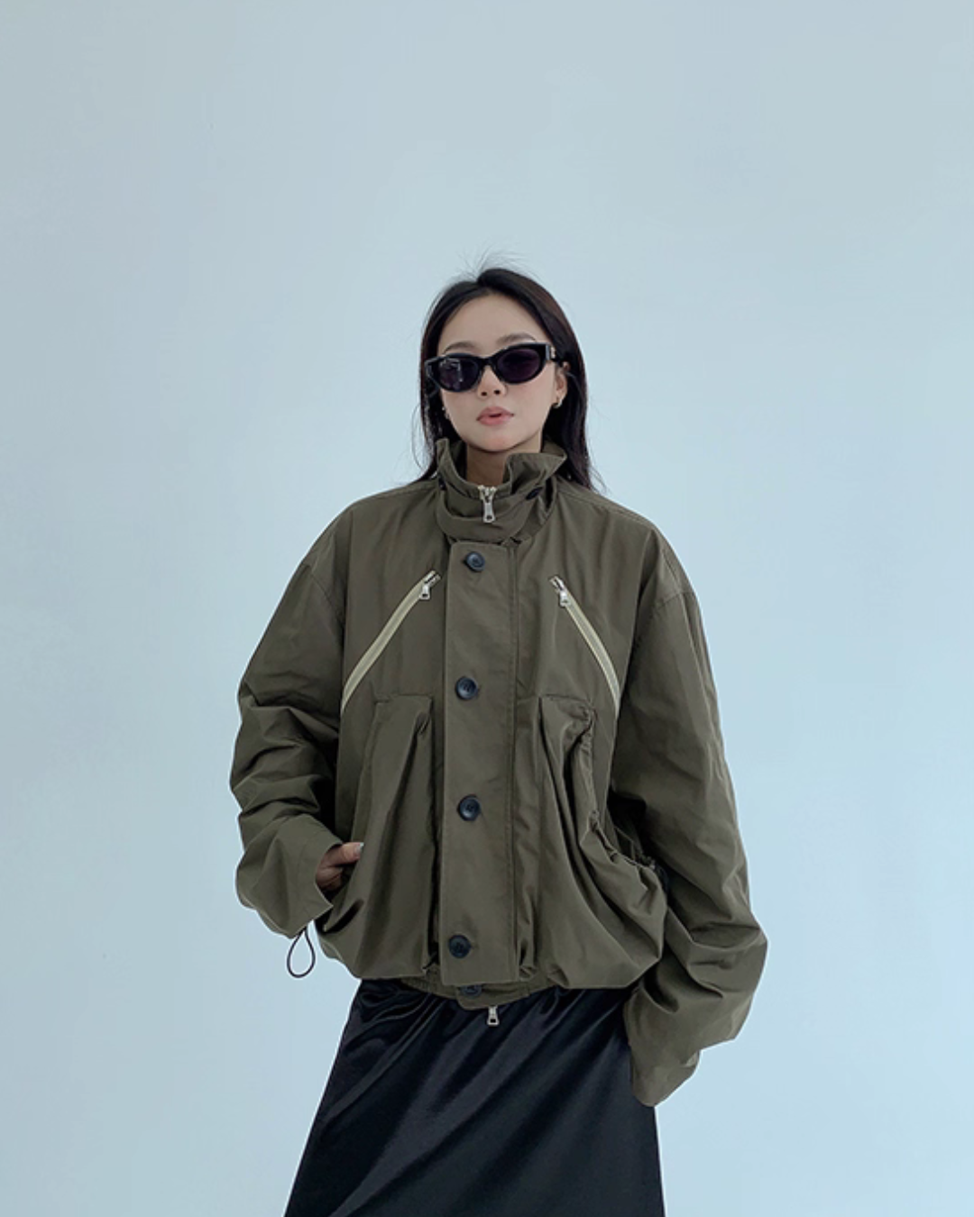 An elegant design with a stand collar that keeps the neck warm.