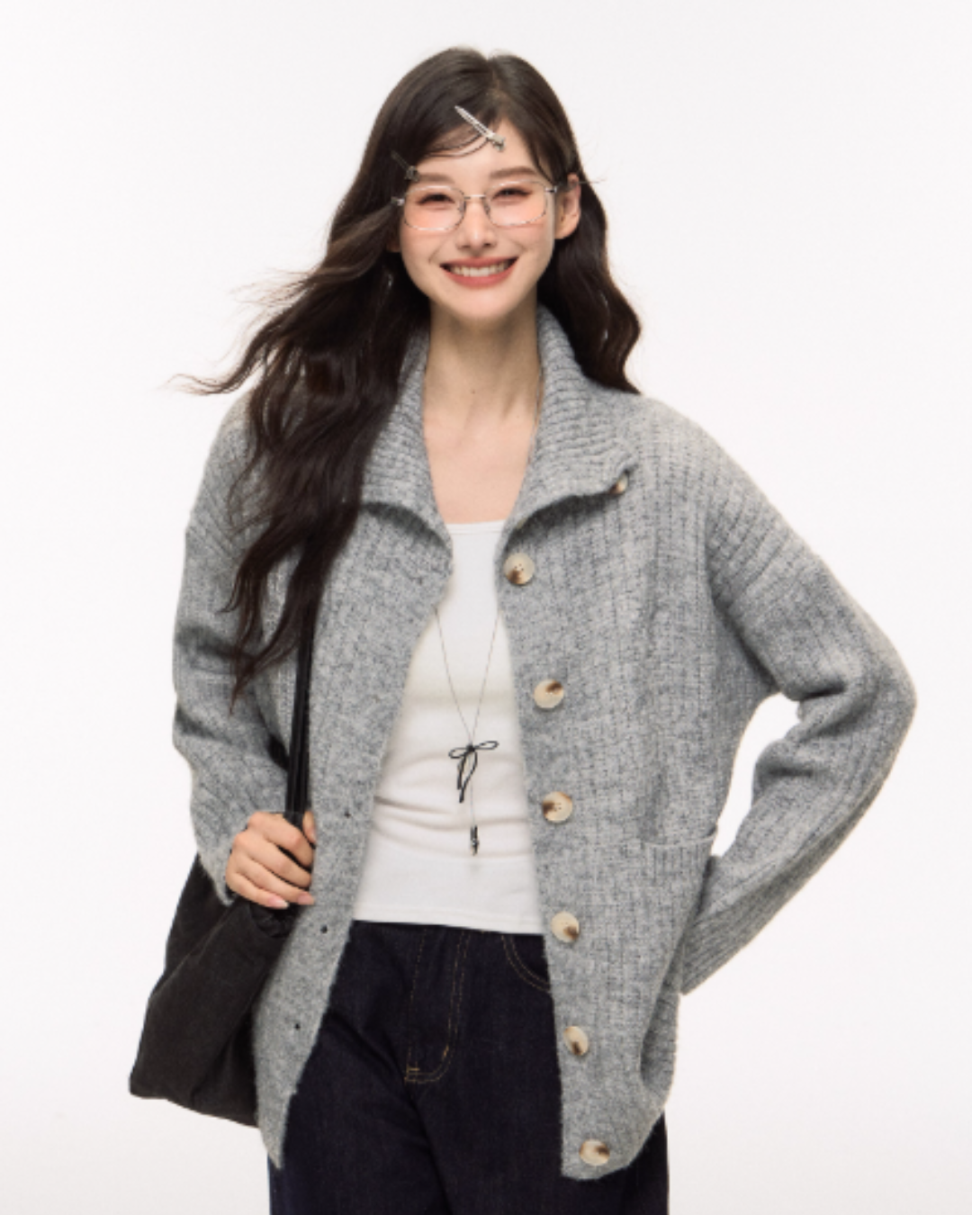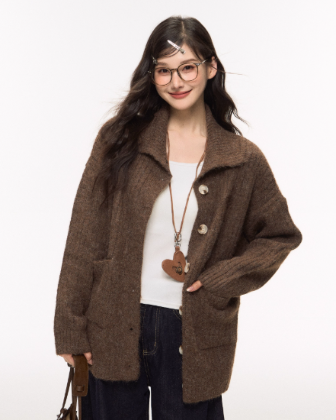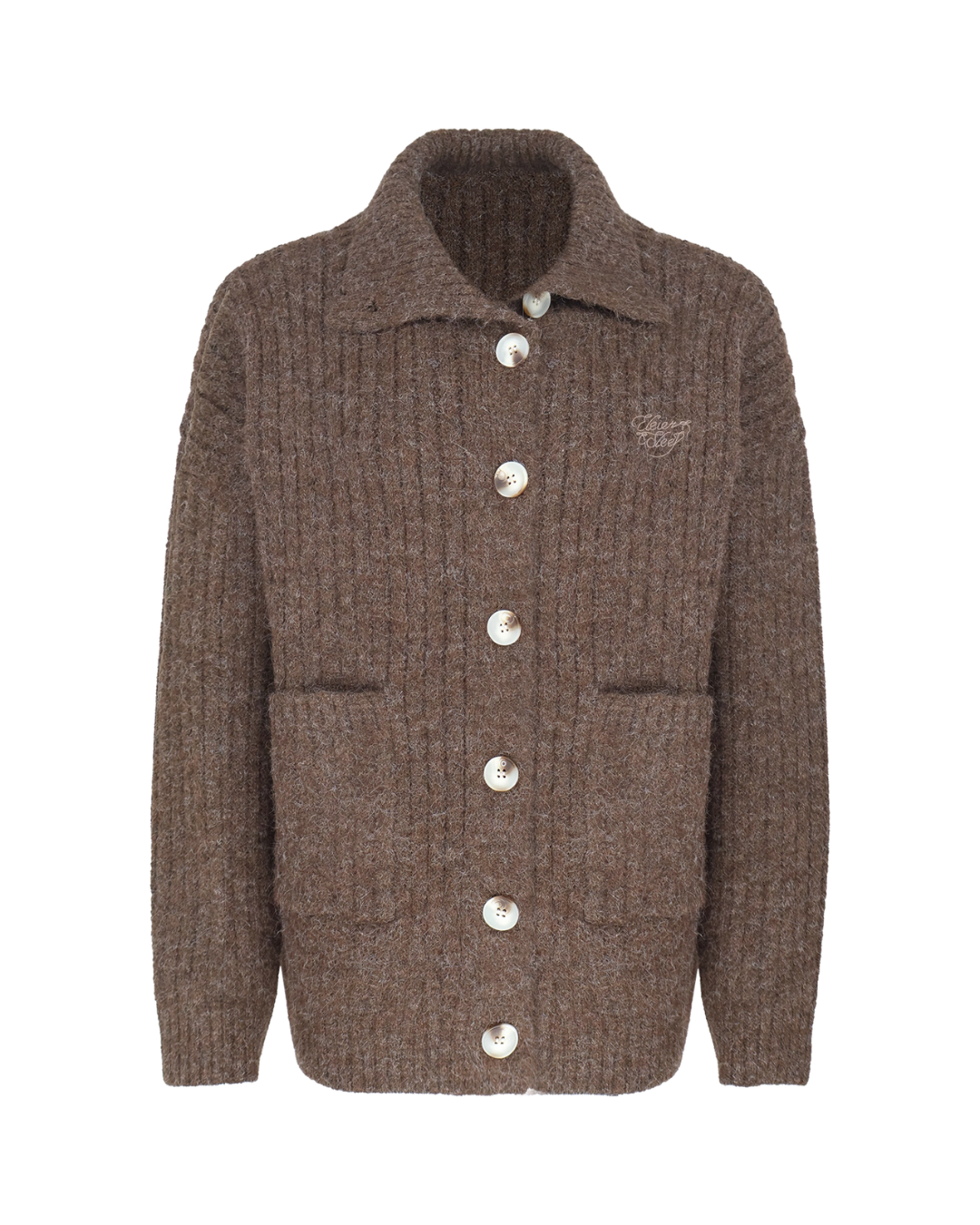 A simple design that eliminates unnecessary decorations, this knit cardigan has an adult-like appeal.