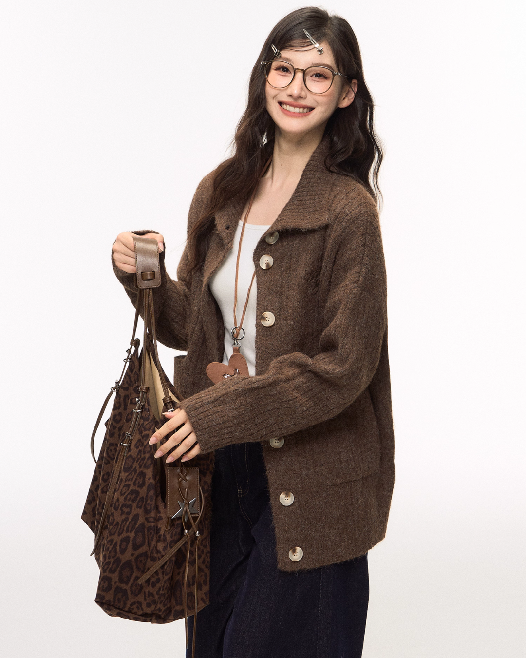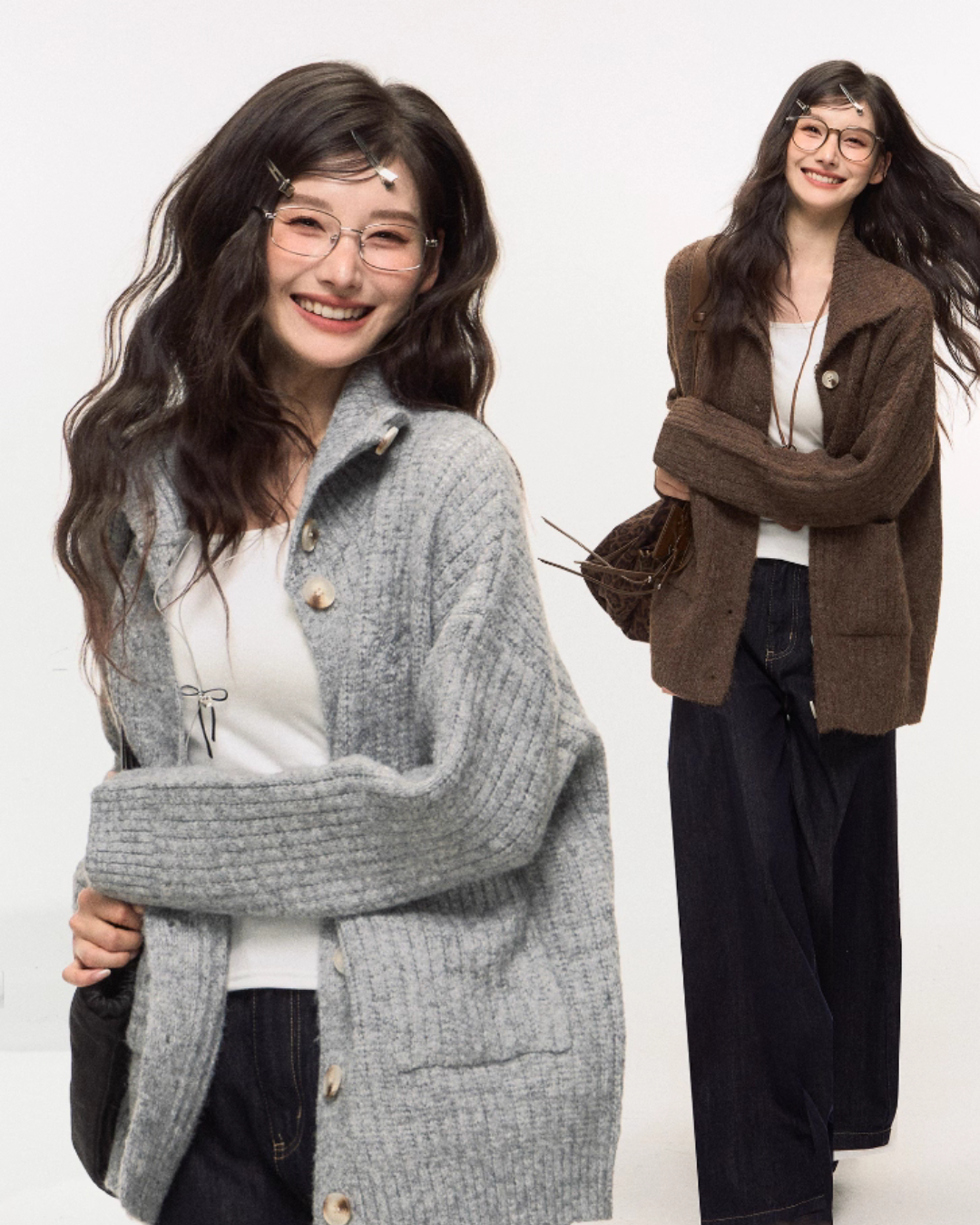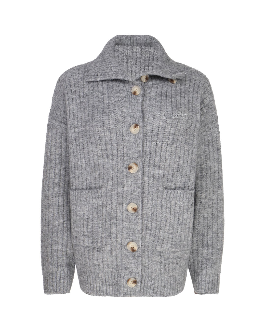 A simple design that eliminates unnecessary decorations, this knit cardigan has an adult-like appeal.
