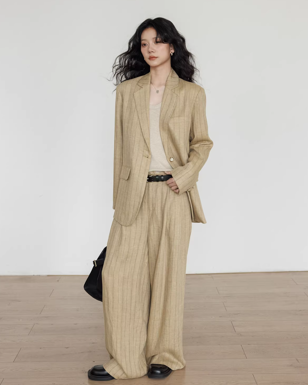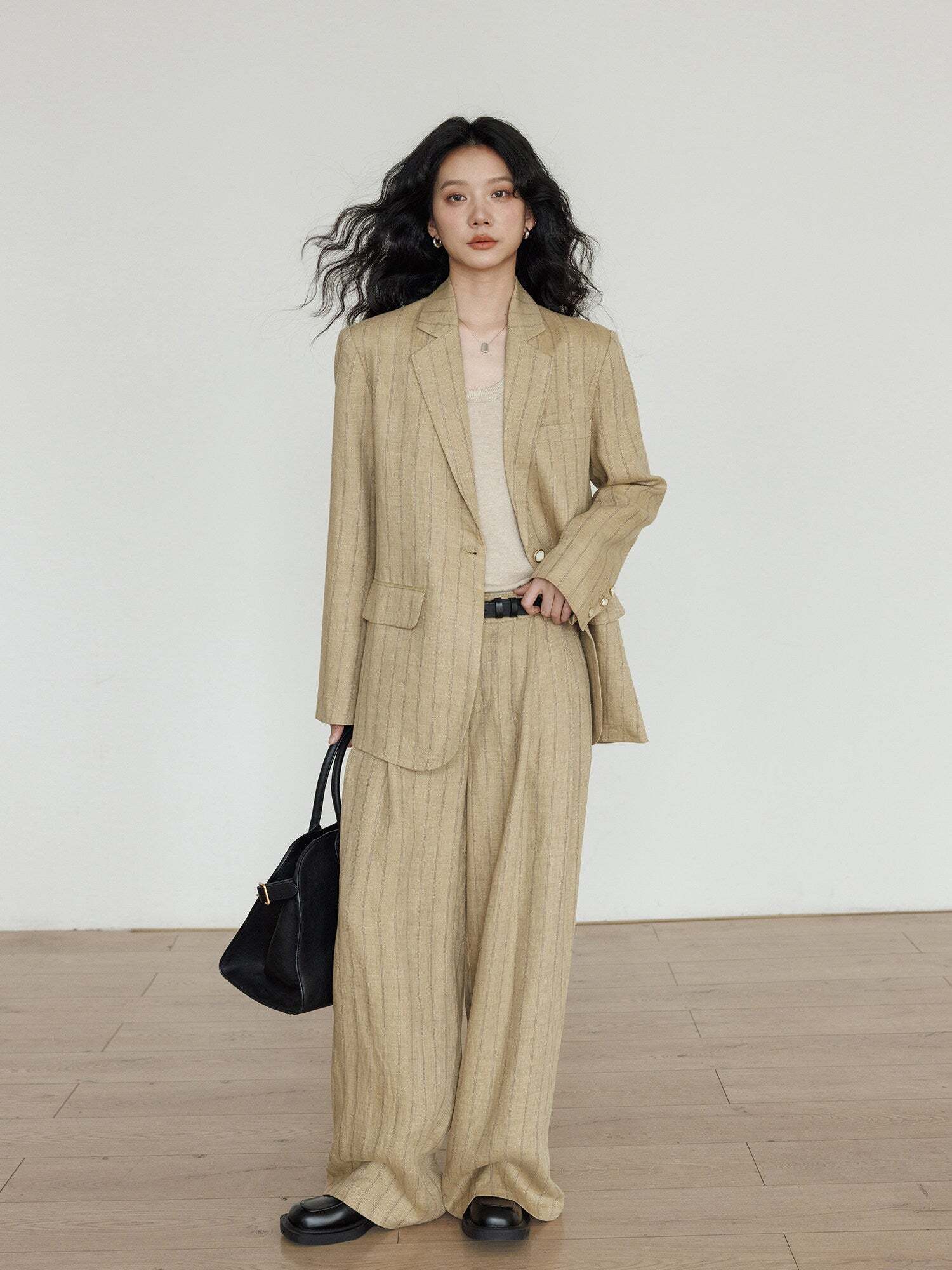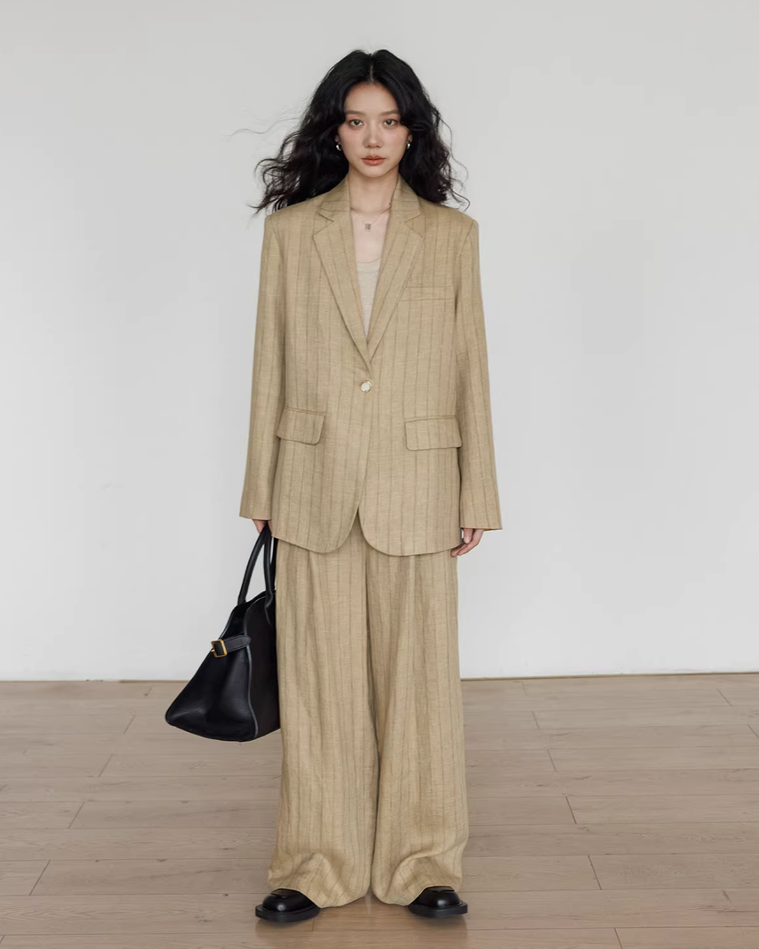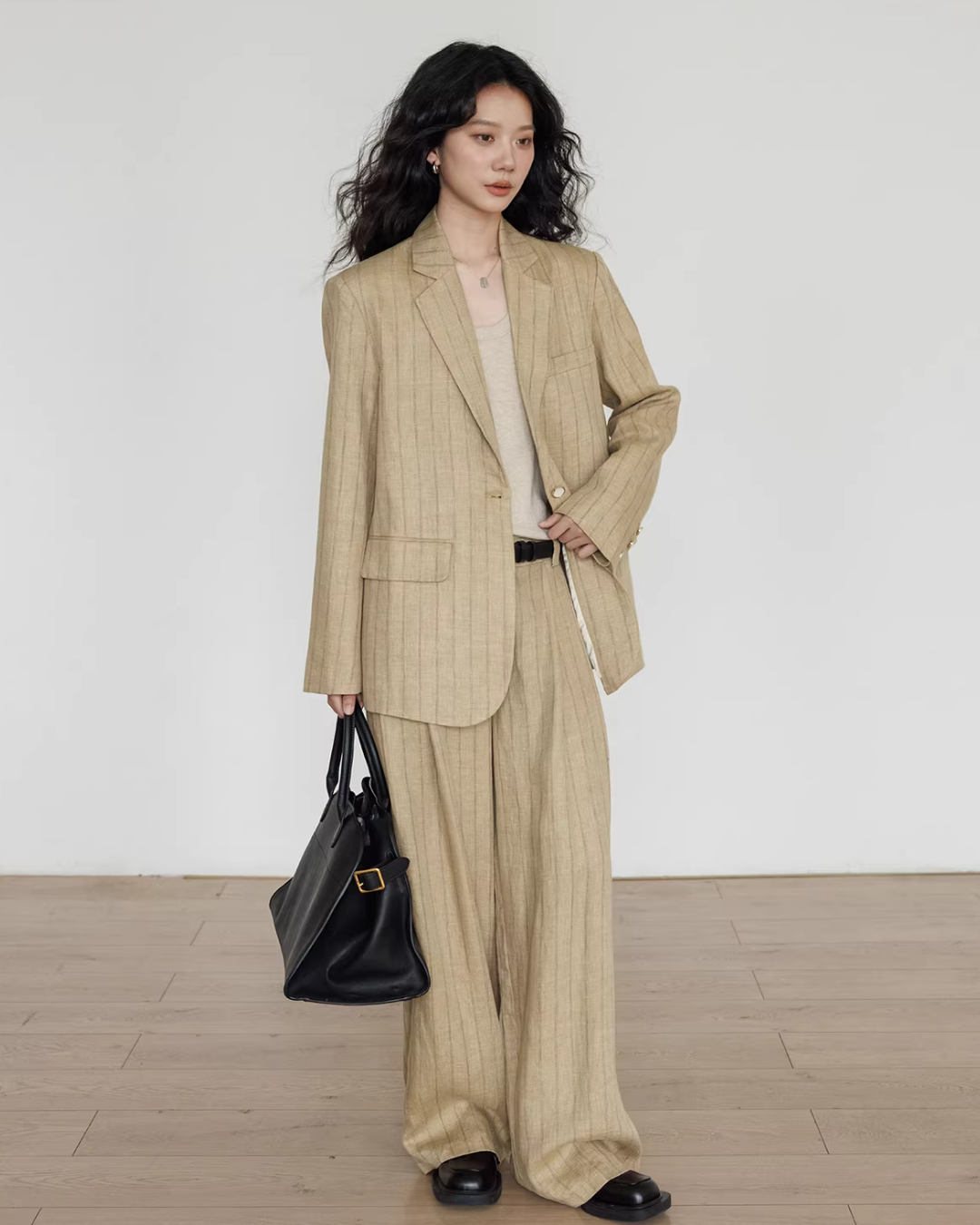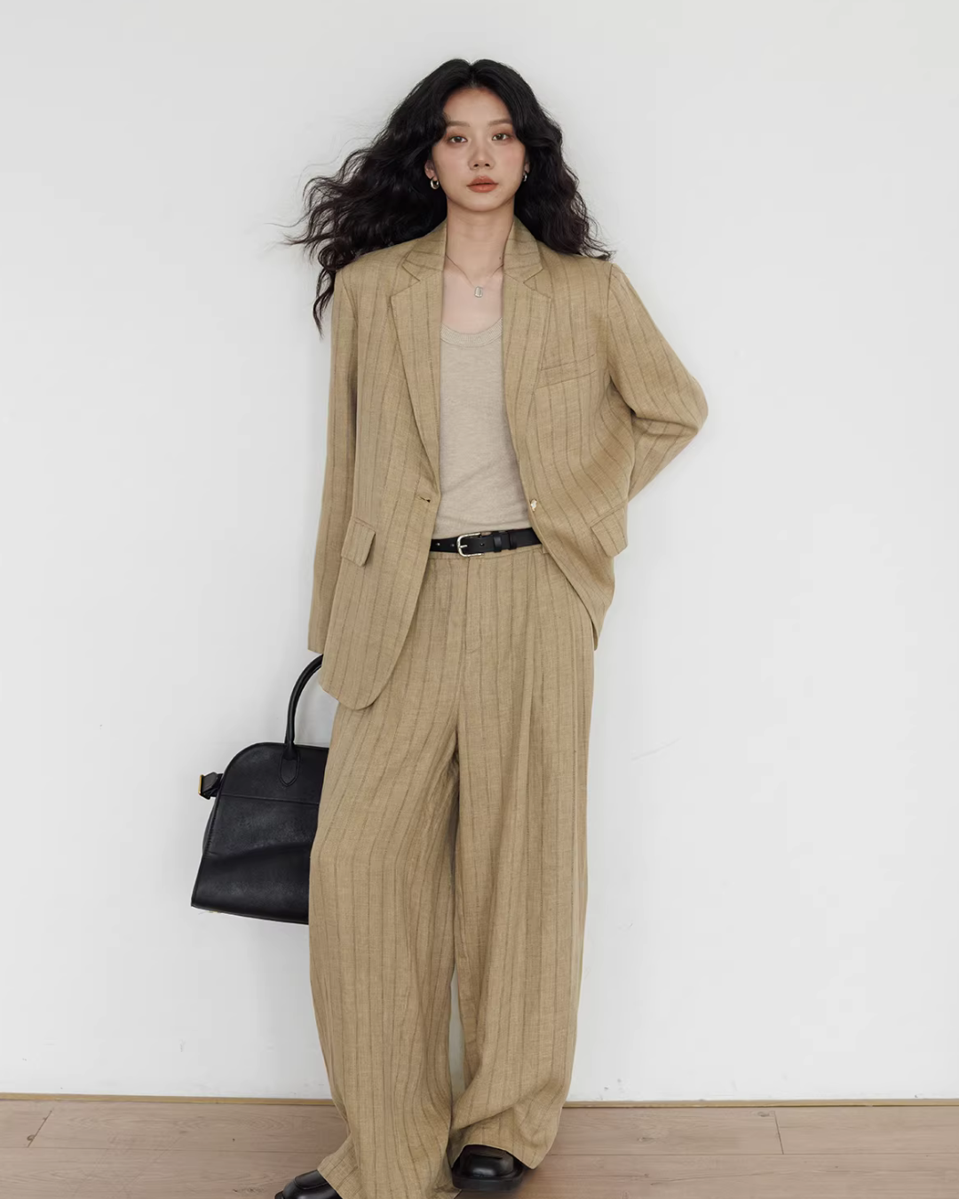 A set-up of a jacket and pants with a striped pattern that has an attractive light material feel.