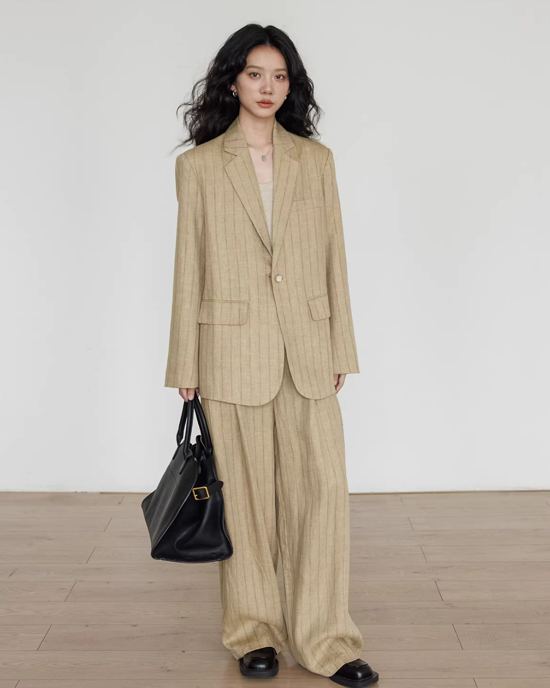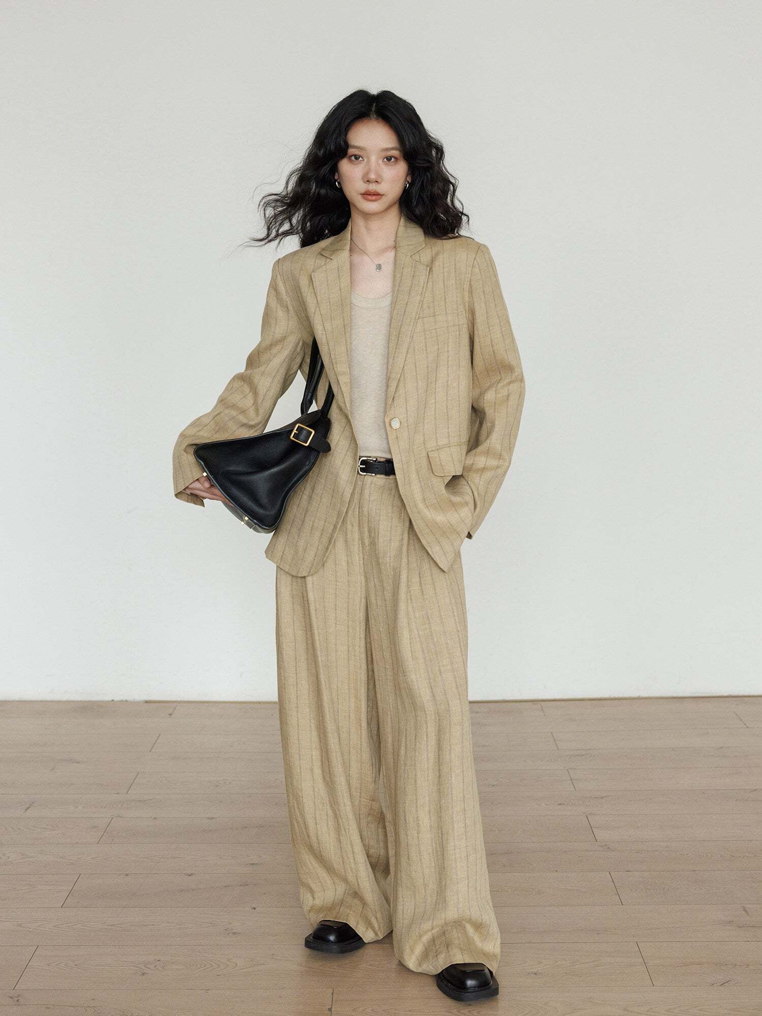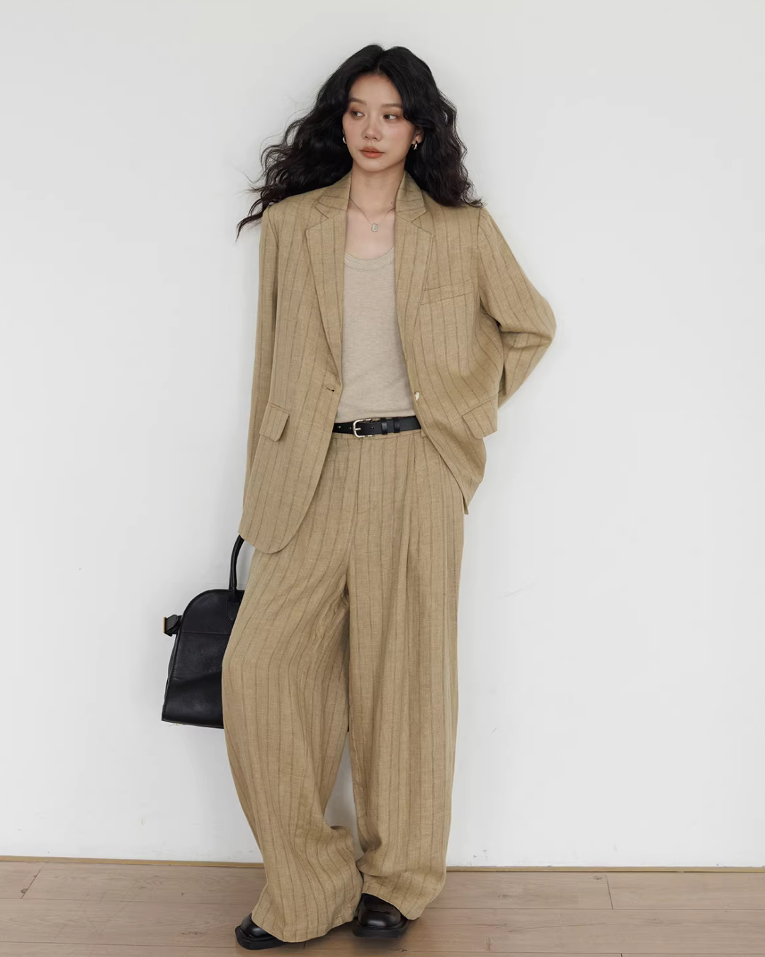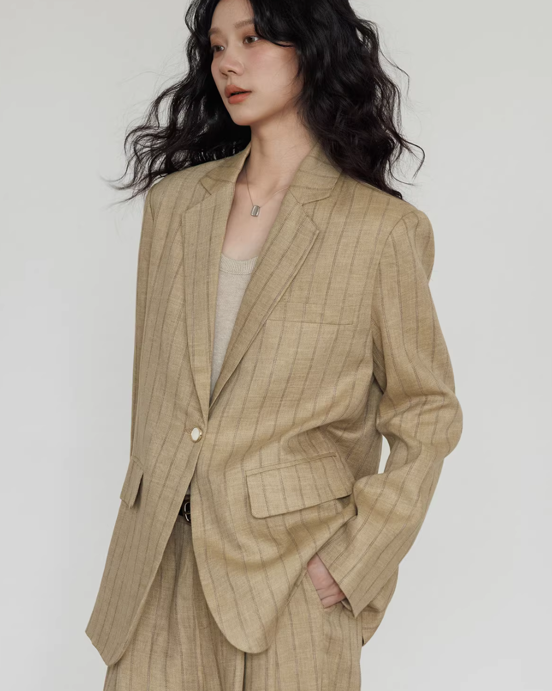 A set-up of a jacket and pants with a striped pattern that has an attractive light material feel.