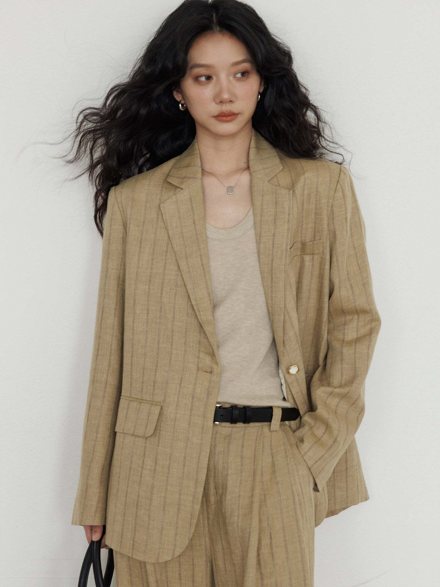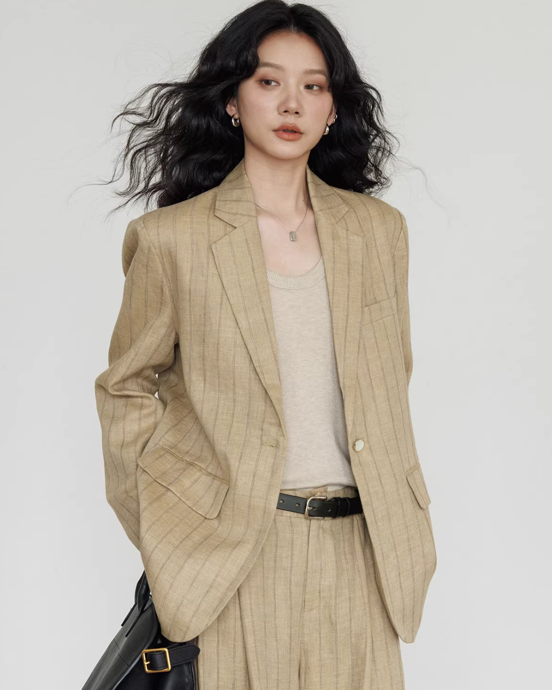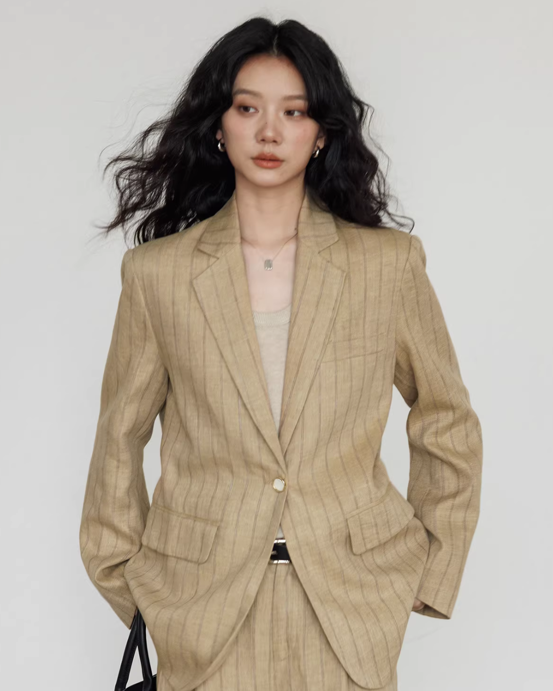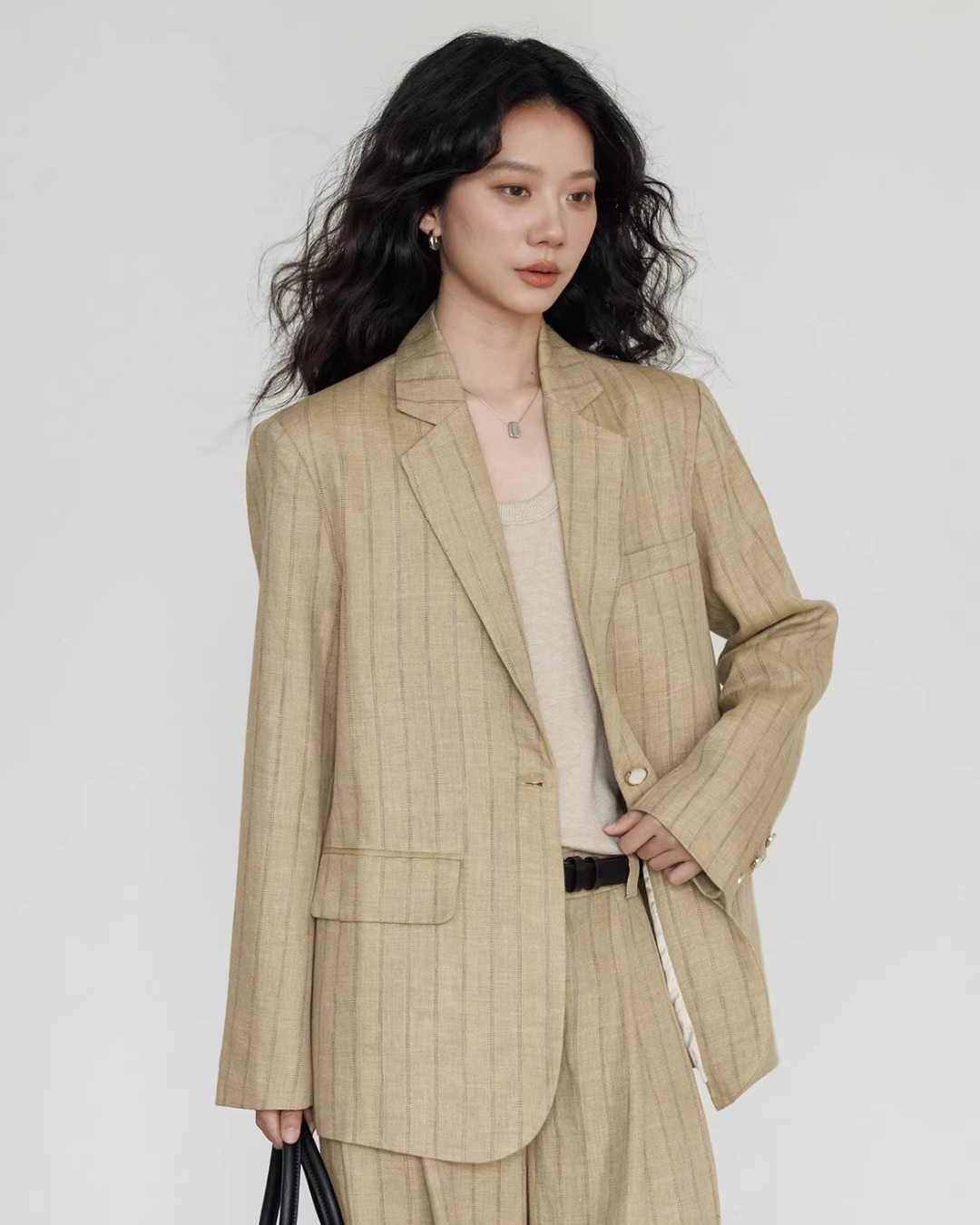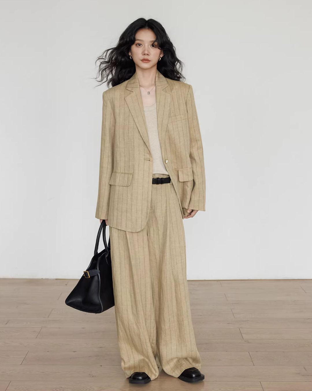 A set-up of a jacket and pants with a striped pattern that has an attractive light material feel.