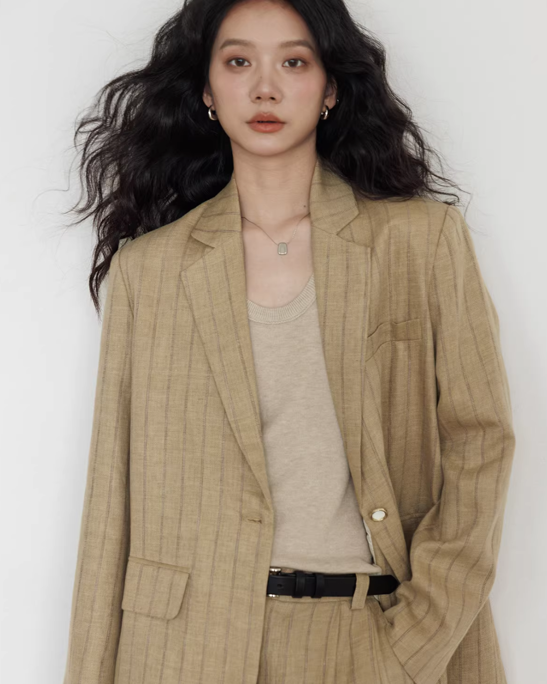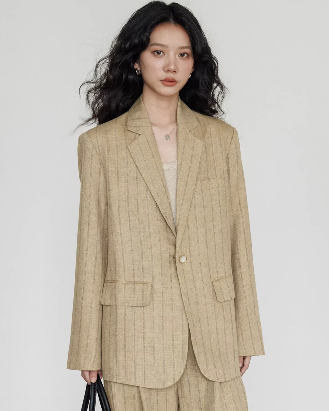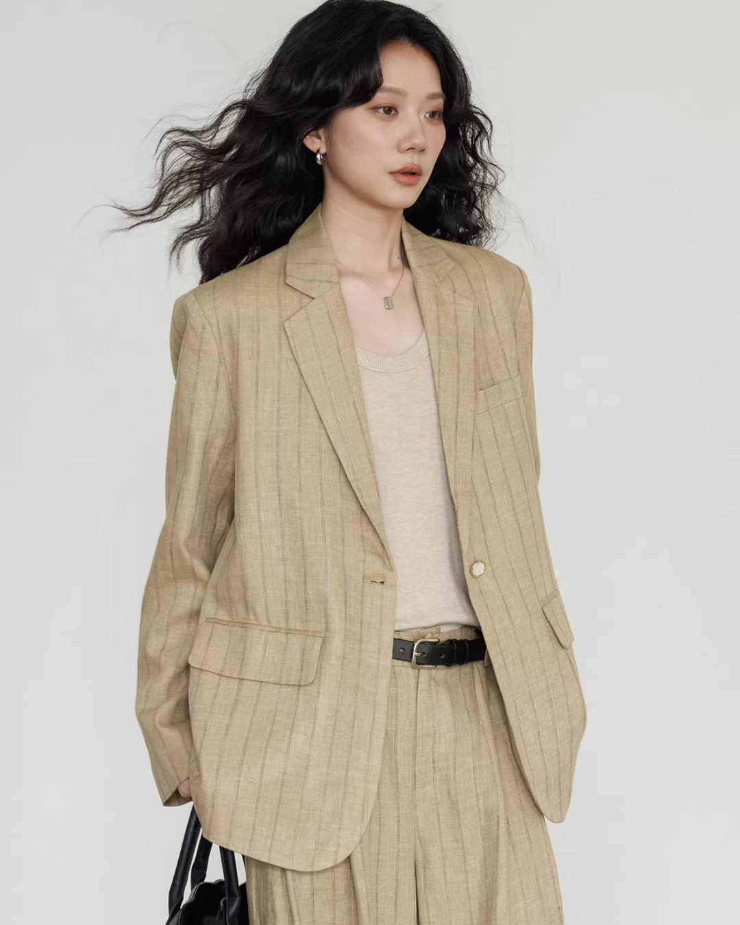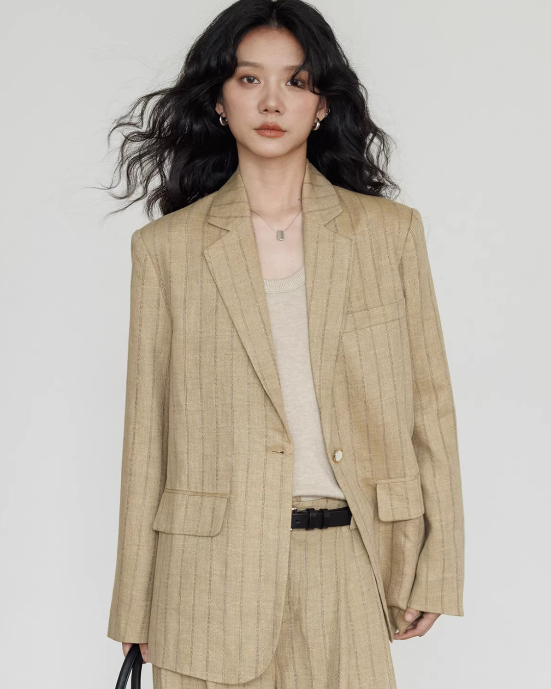 A set-up of a jacket and pants with a striped pattern that has an attractive light material feel.