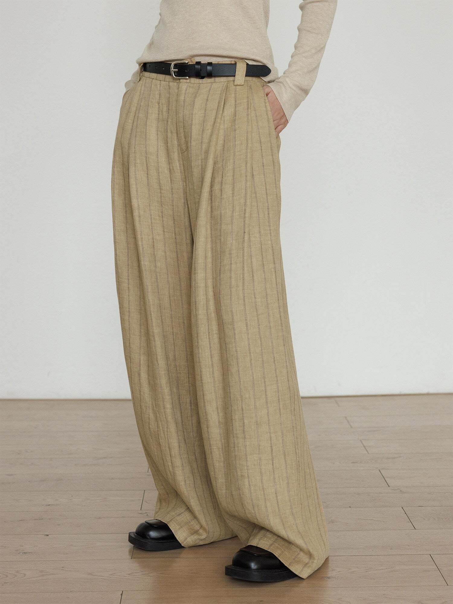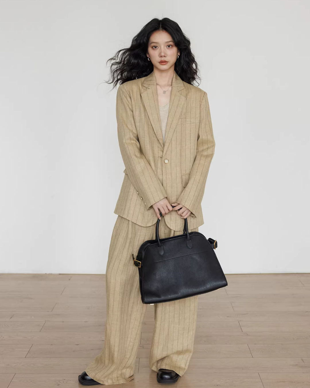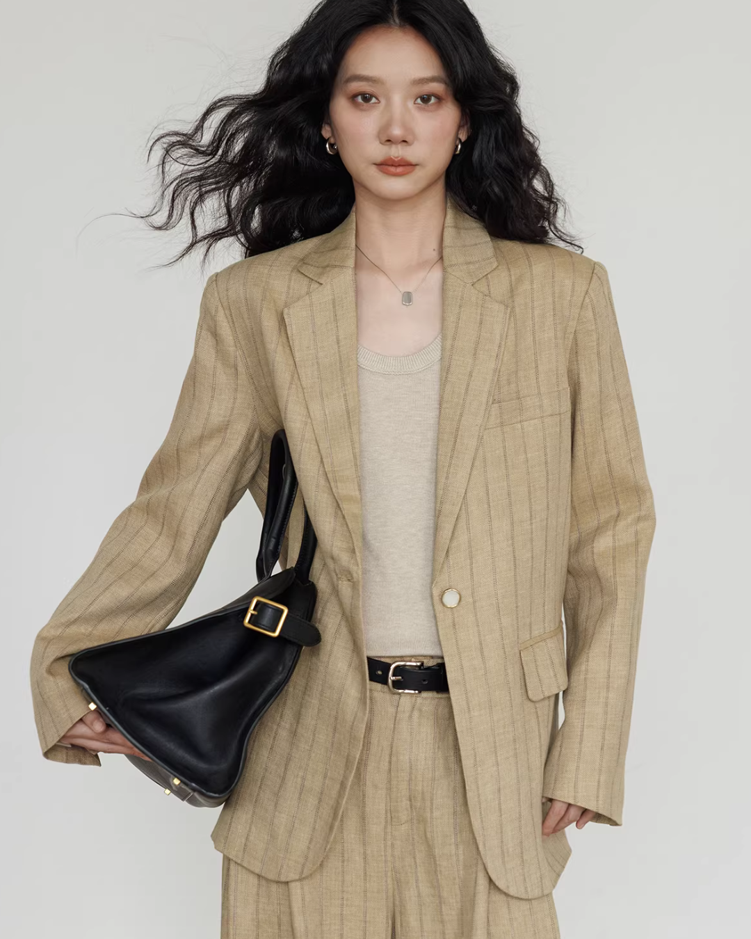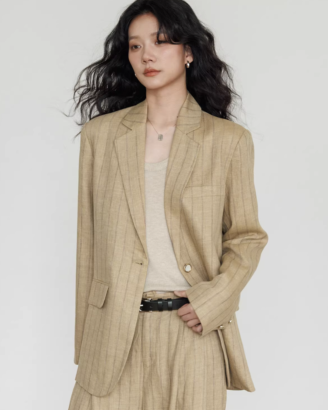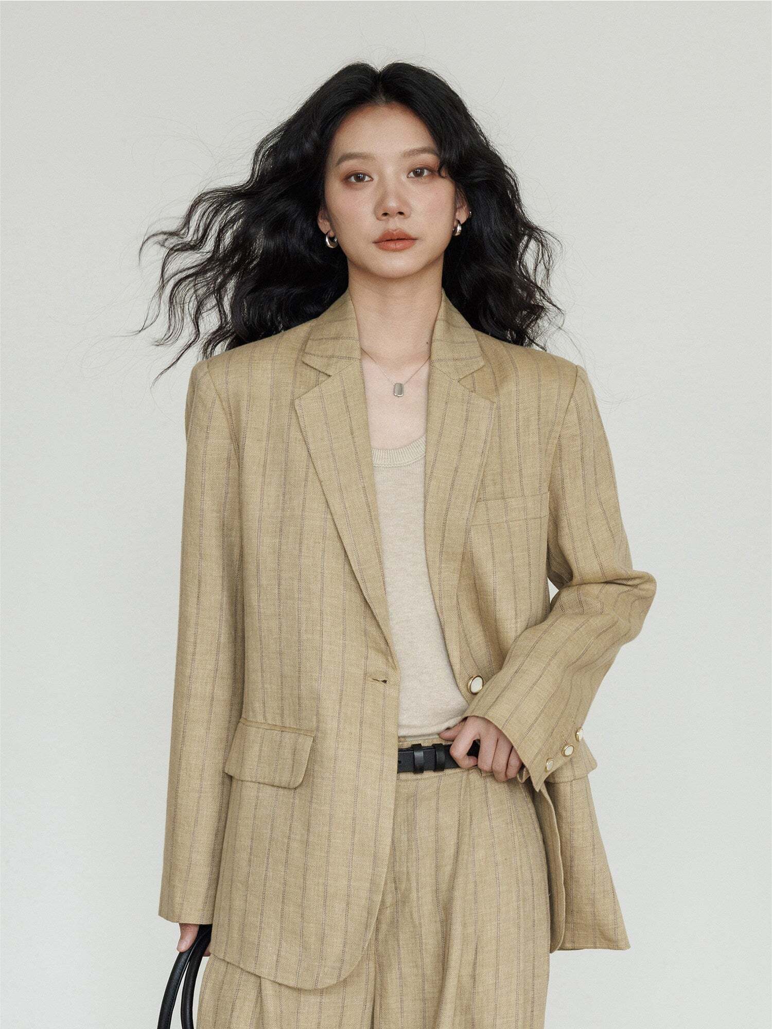 A set-up of a jacket and pants with a striped pattern that has an attractive light material feel.