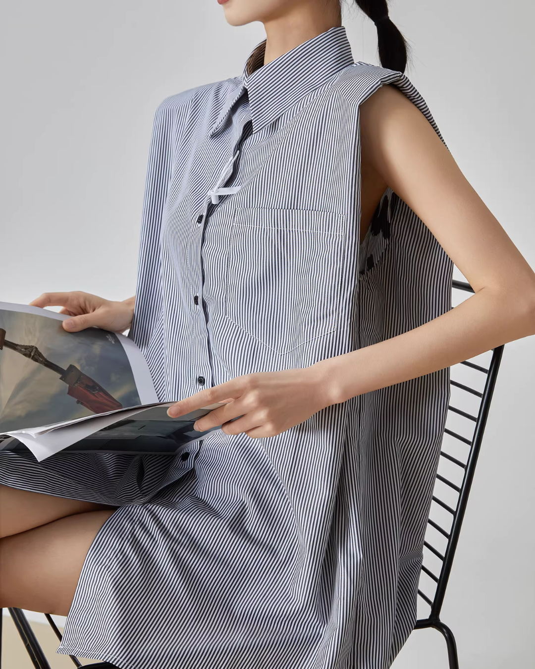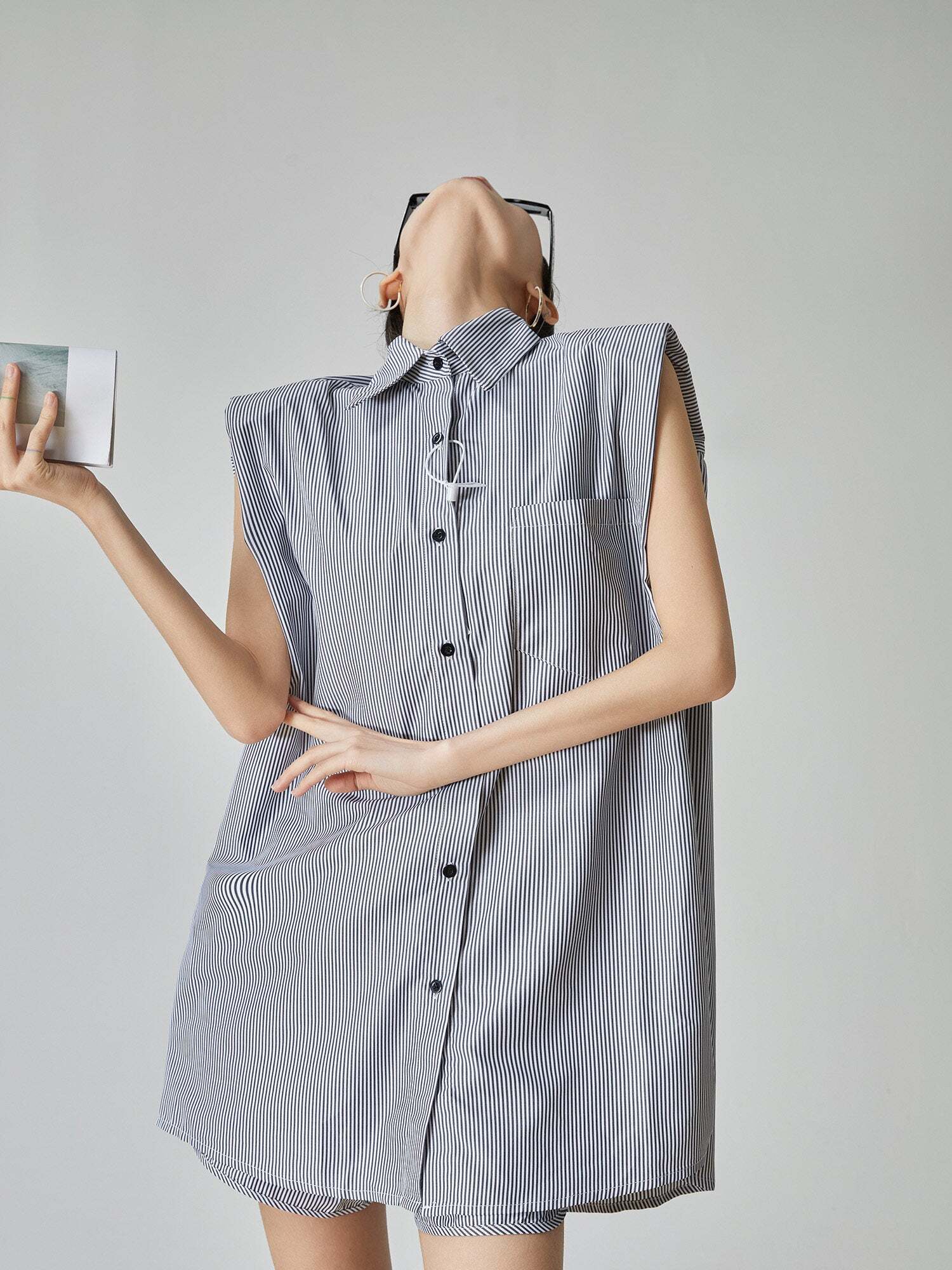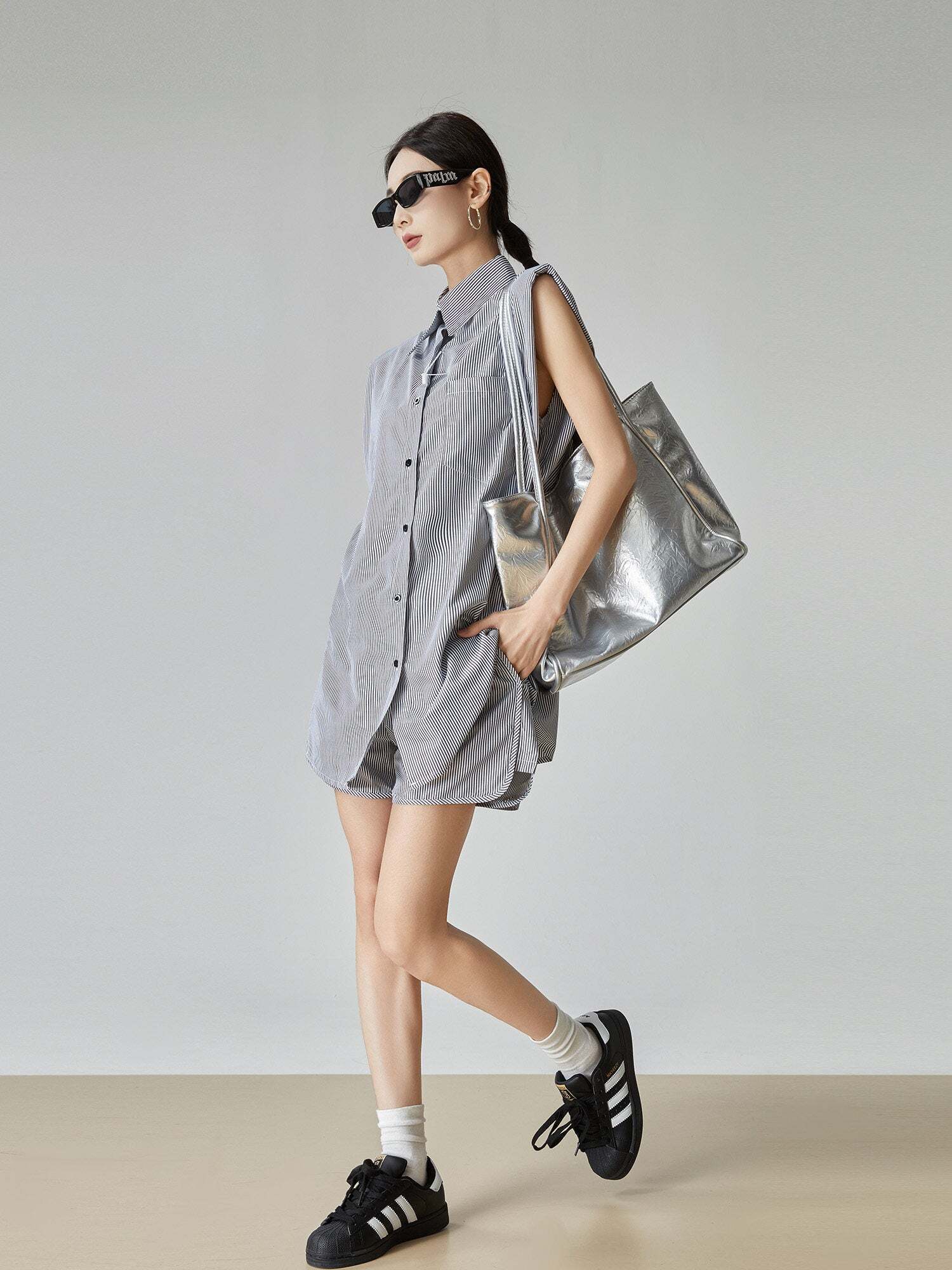 A set-up of a sleeveless shirt and pants with a stripe pattern that highlights the back logo.
