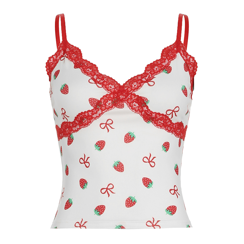 Sweet, Strawberry Print Lace Knitted Camisole Y2K Girl Top High-quality product featuring strawberry shortcake costume, dream clothes, 2000s fashion and more. Modern design that fits the latest trends. Premium materials ensure durability and comfort. Order now for special offers! Product designed with attention to every detail. Suitable for all occasions and personal styles.