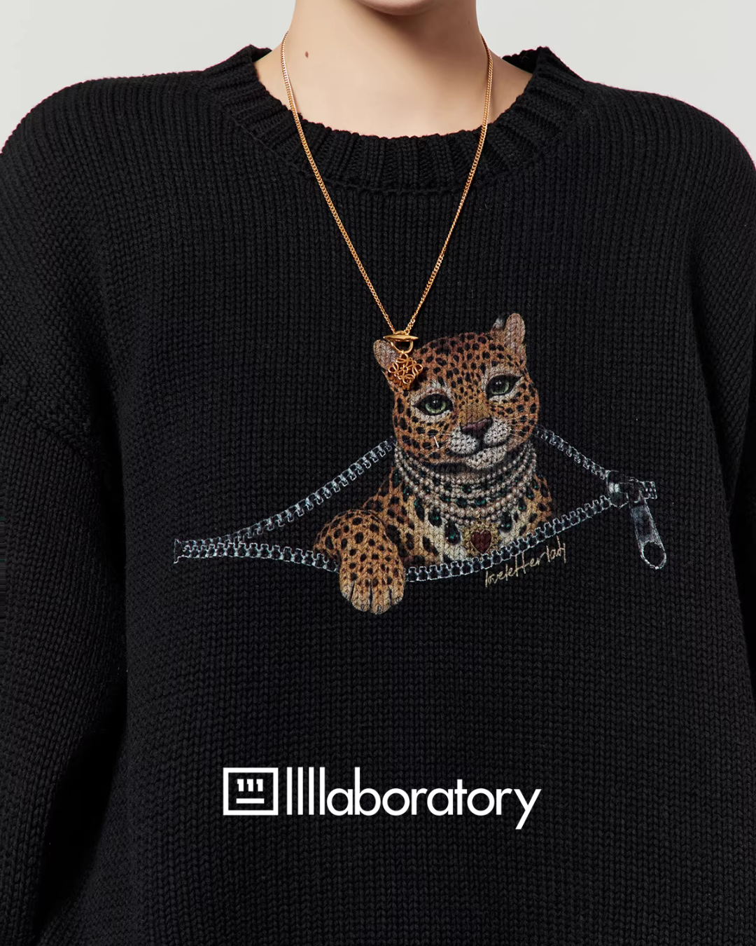 The print of a tiger peeking out from the zip is a cute knit top.