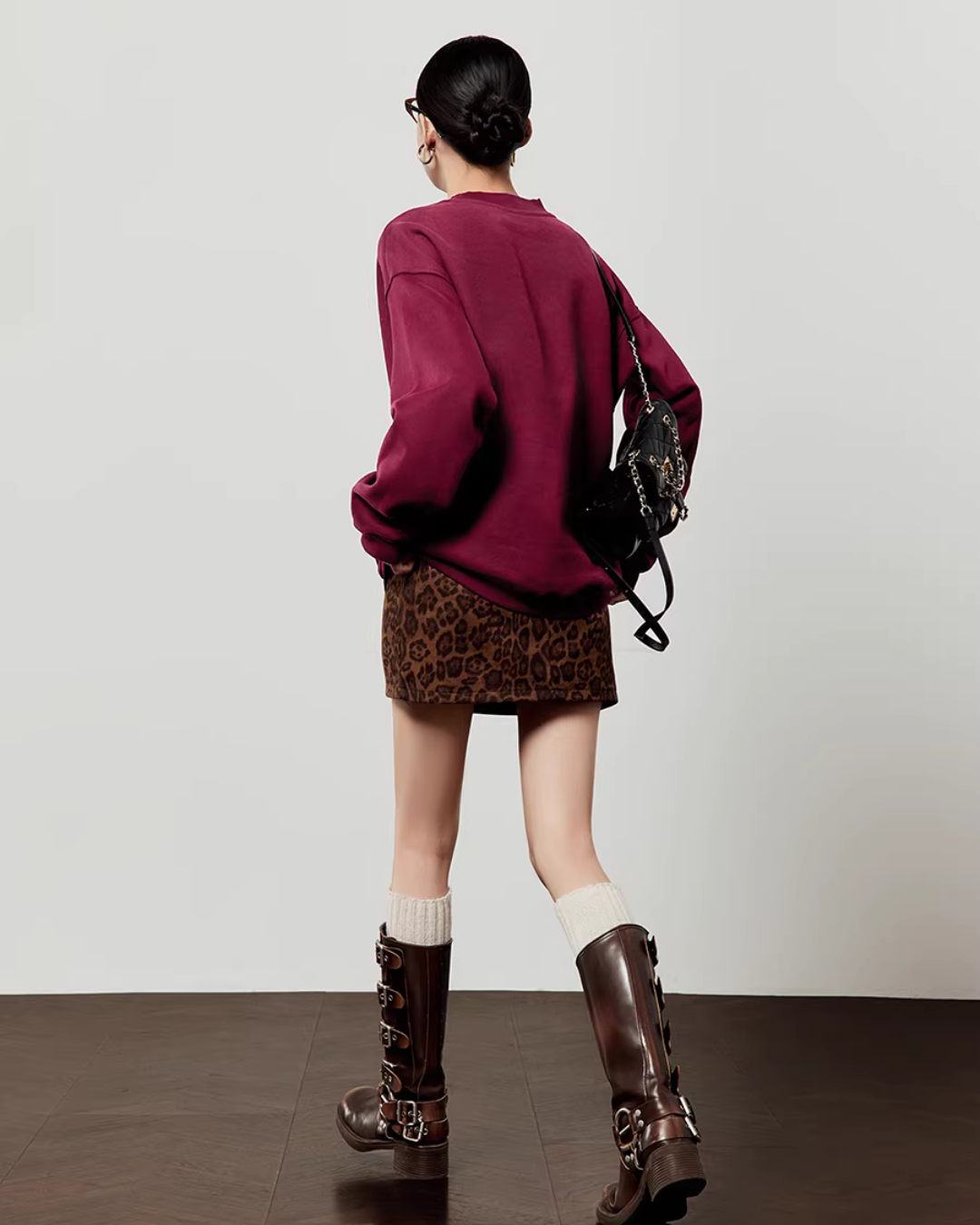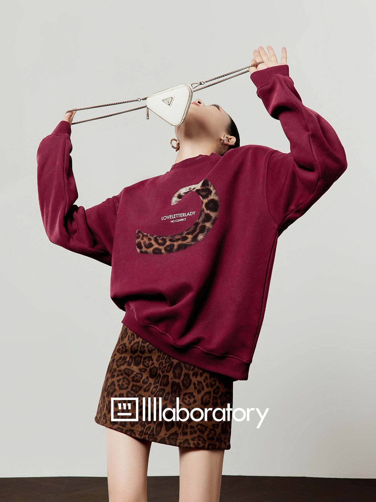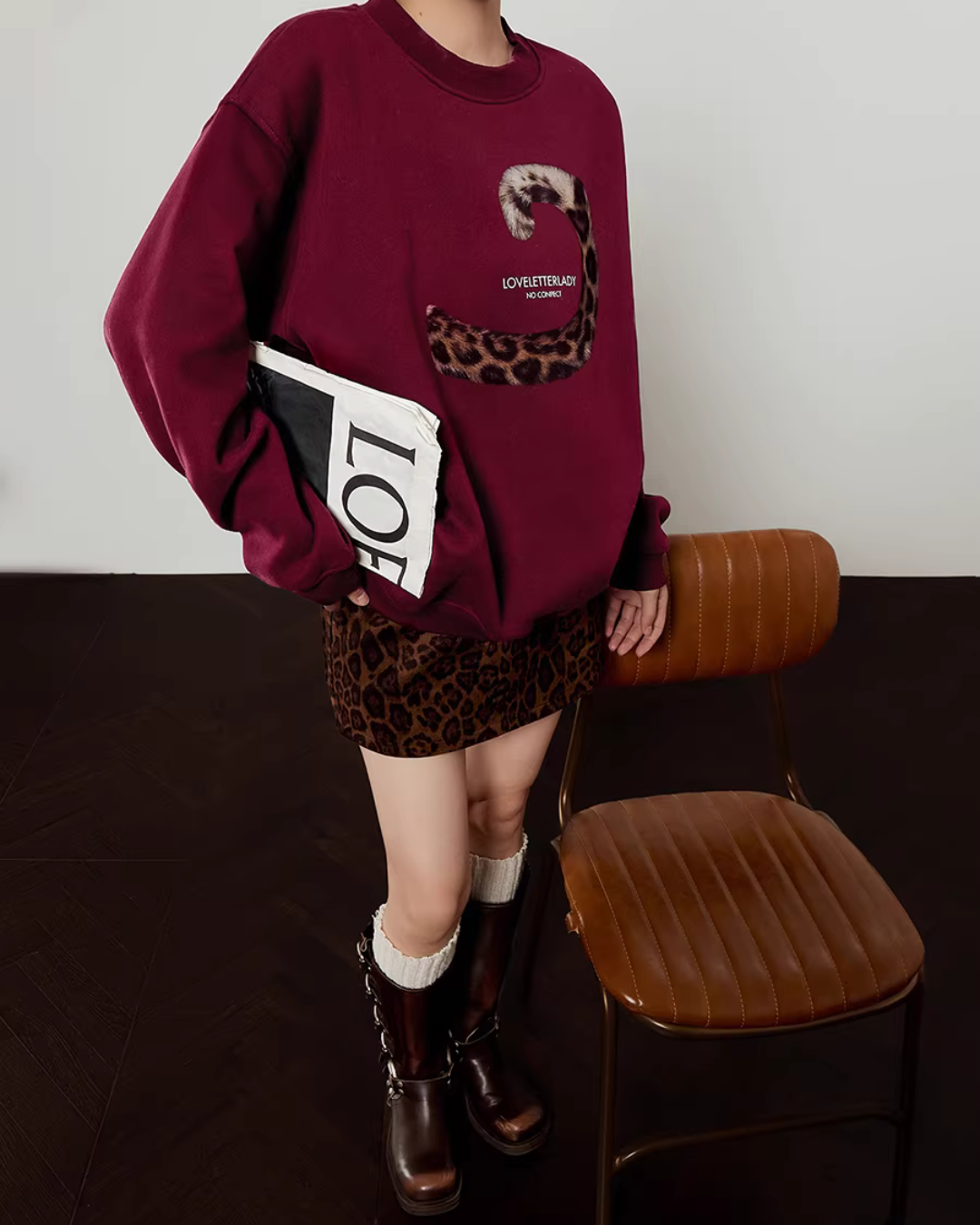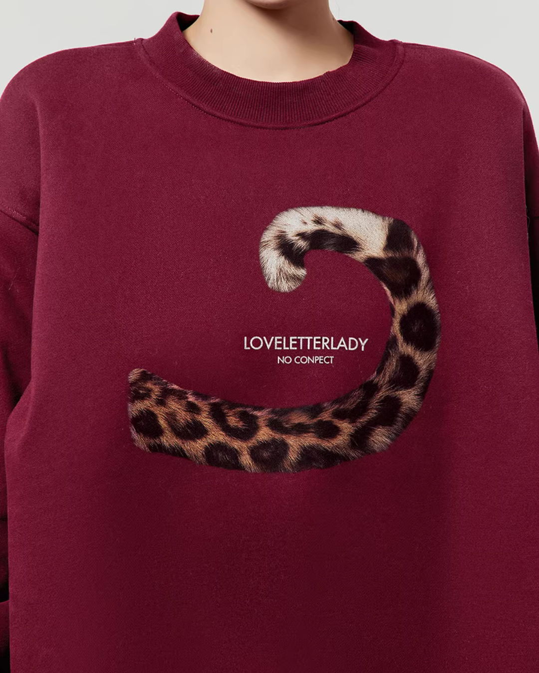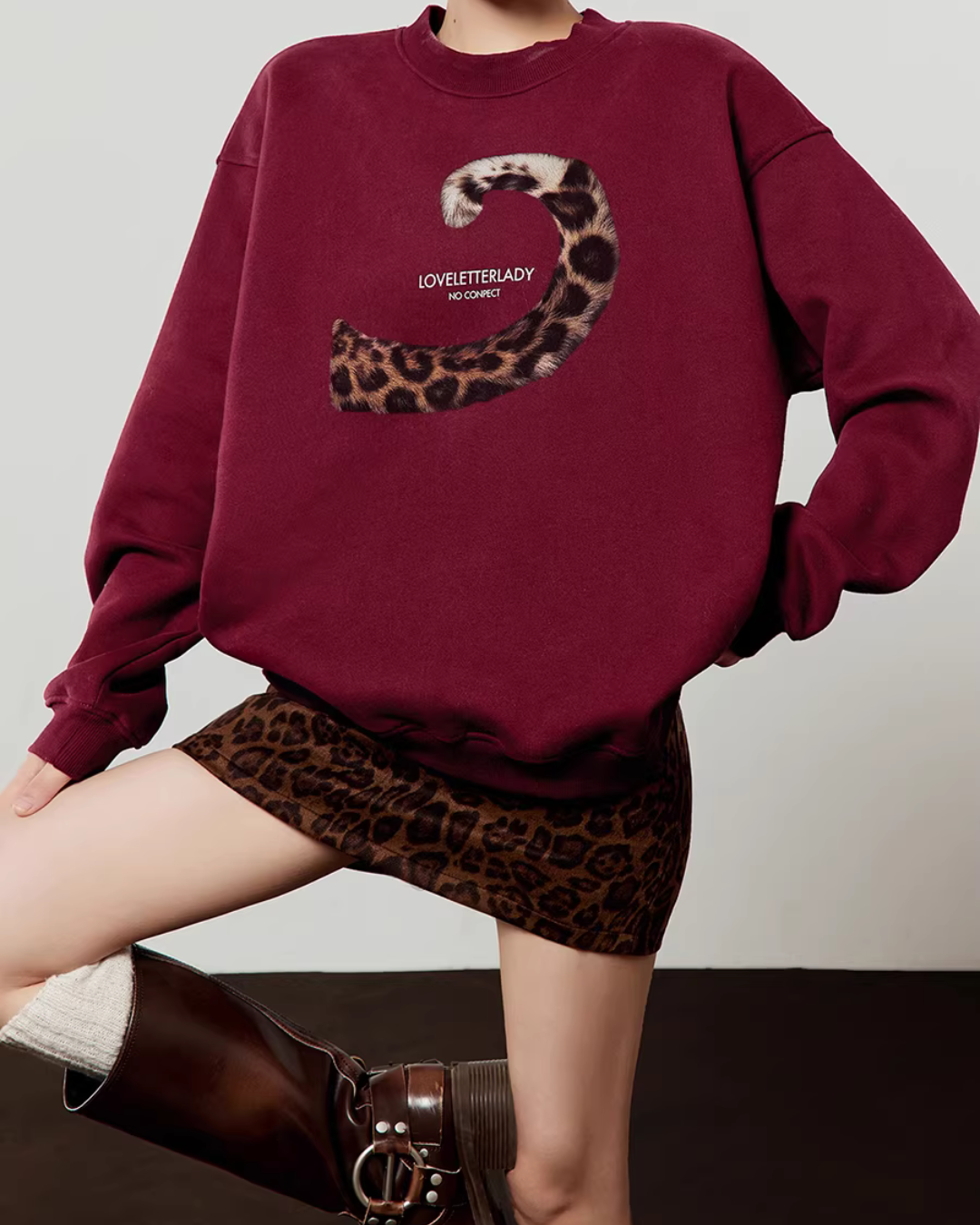 A sweatshirt top with a unique design incorporating a tiger’s tail.