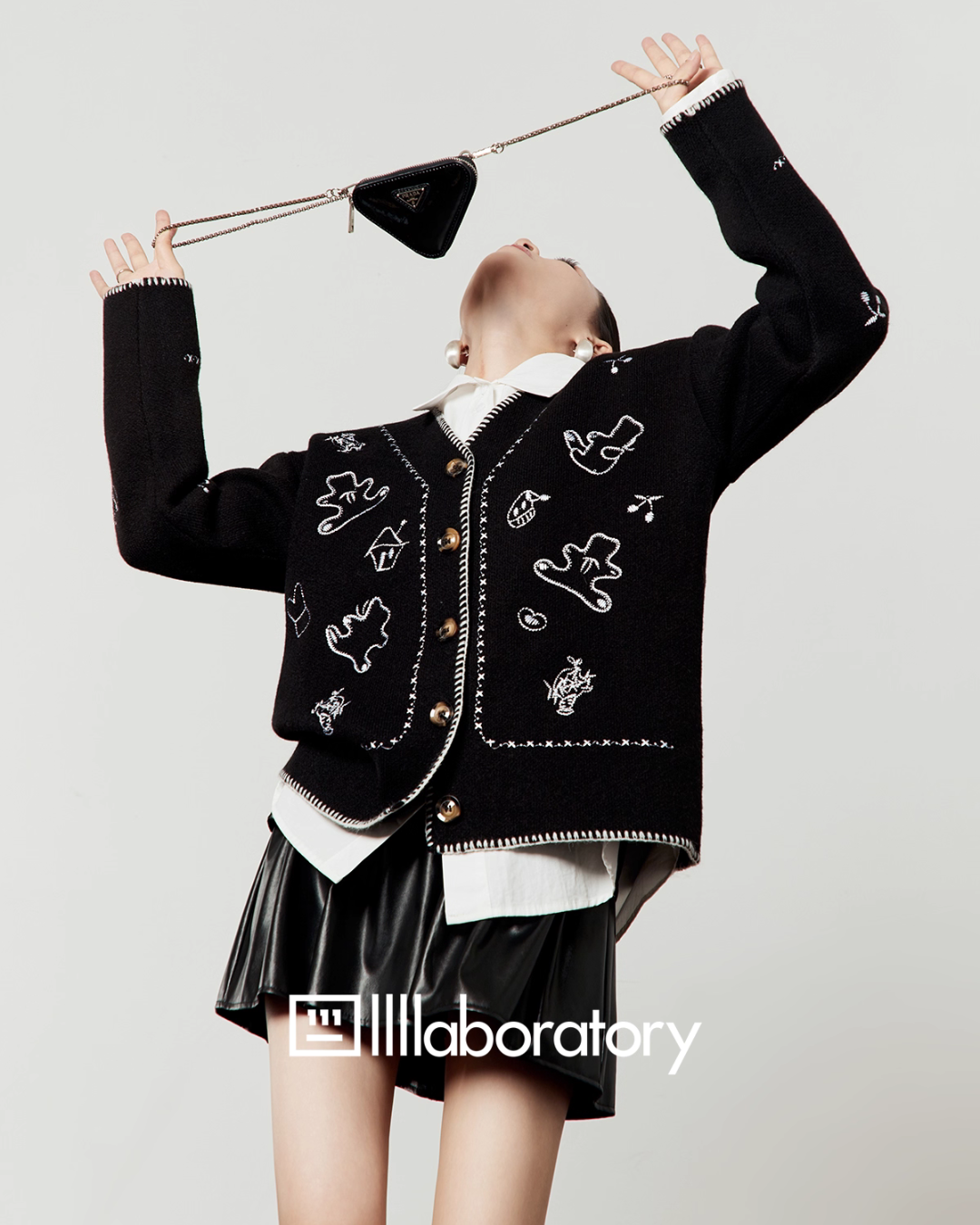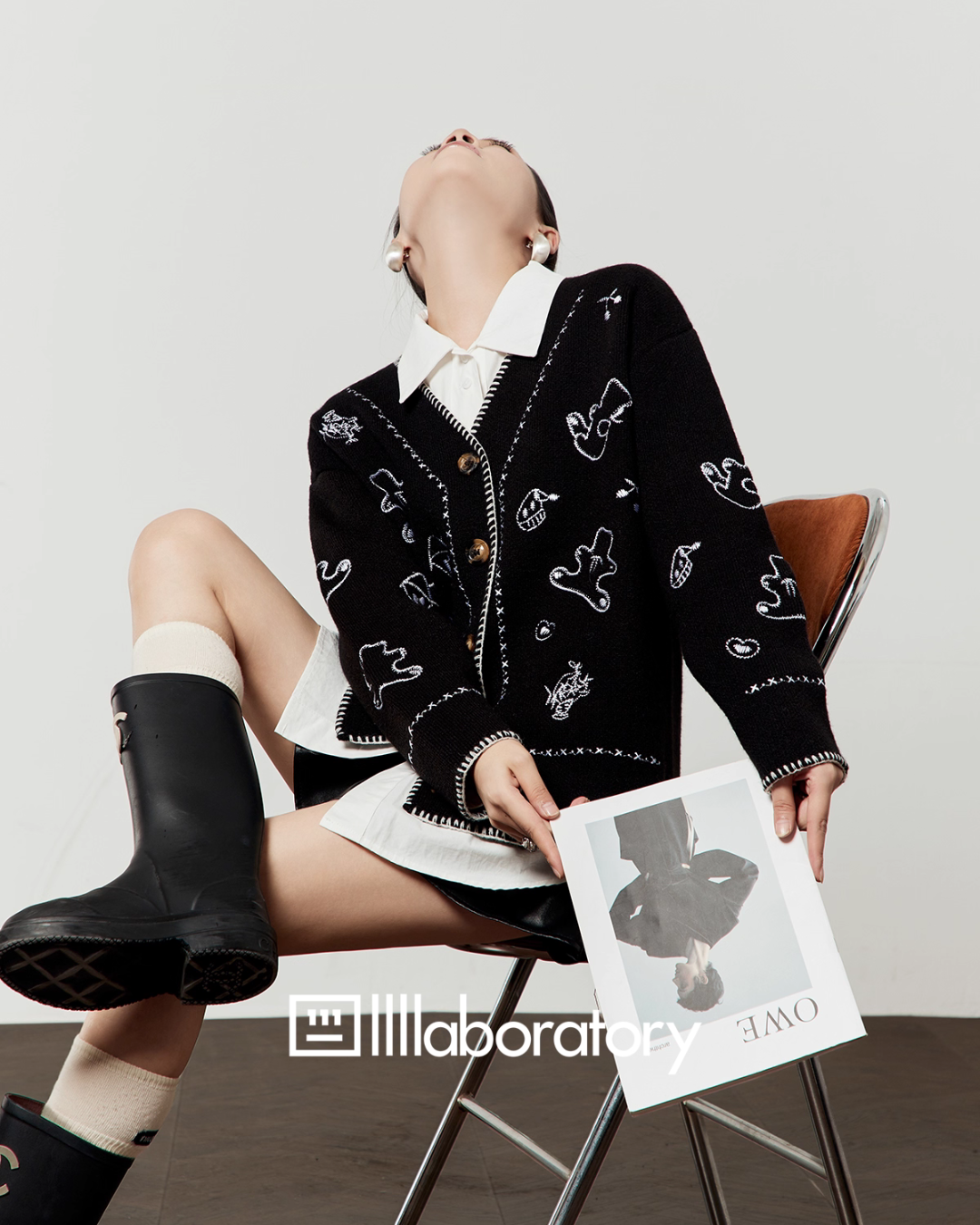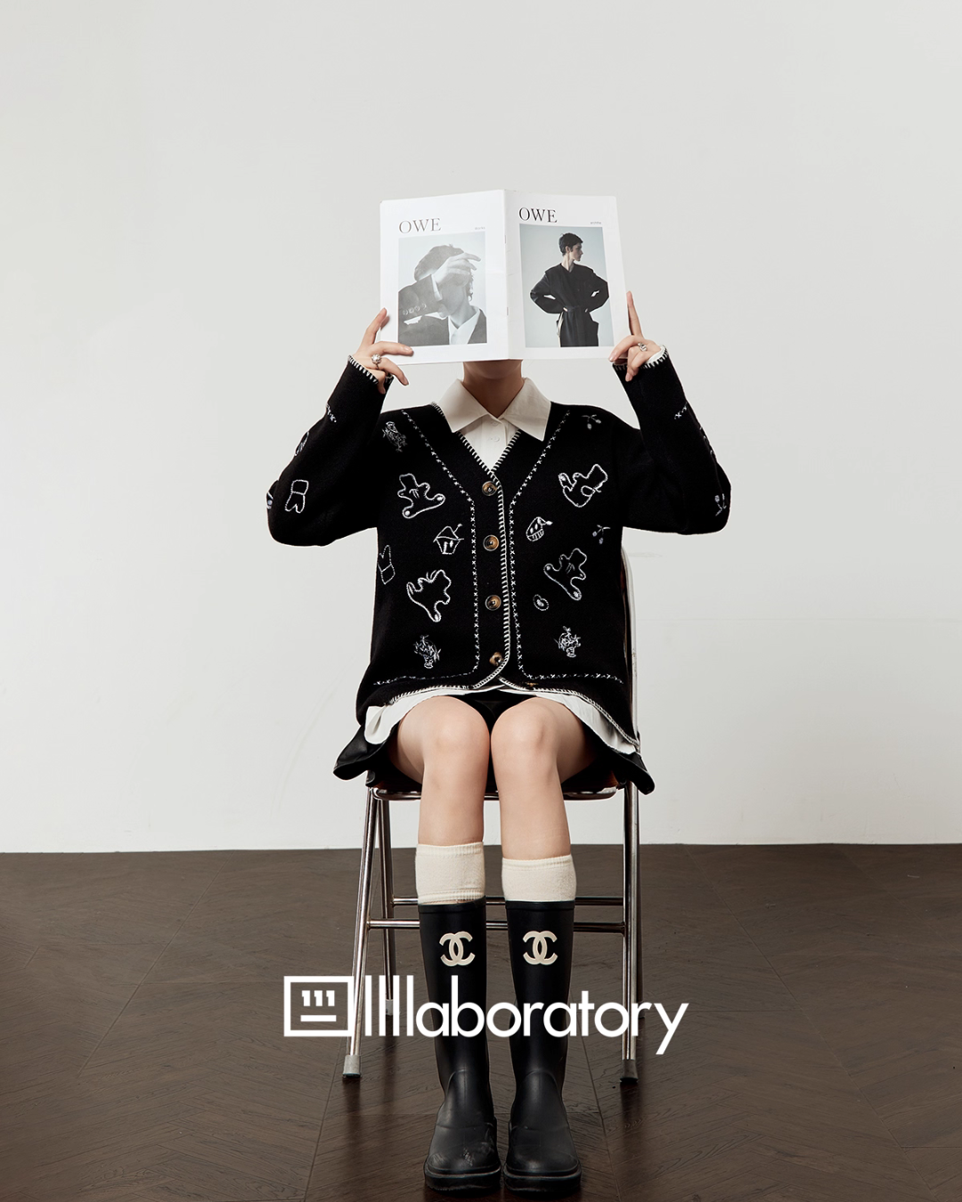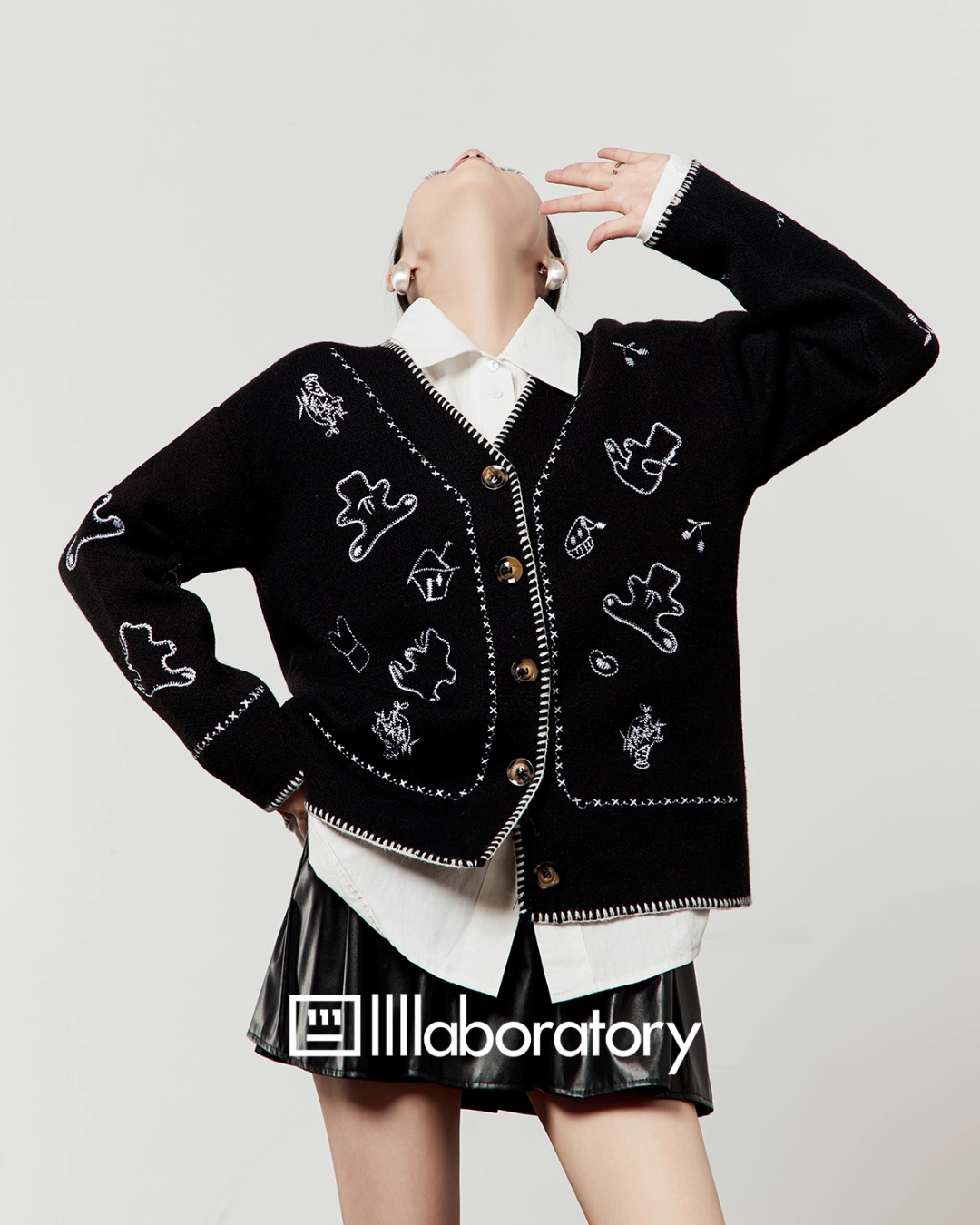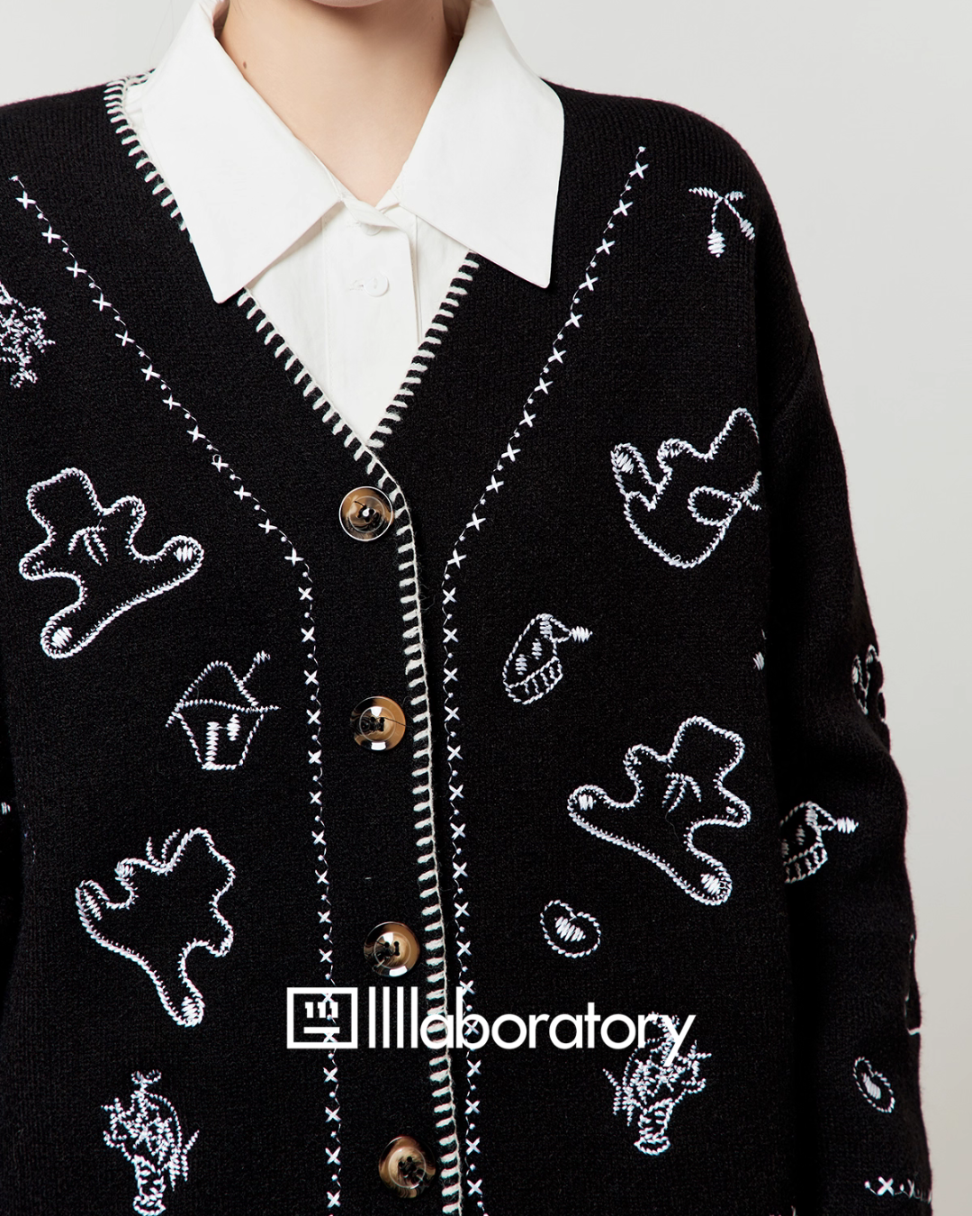 A set-up of a knit cardigan and mini skirt with an impressively cute adult design.