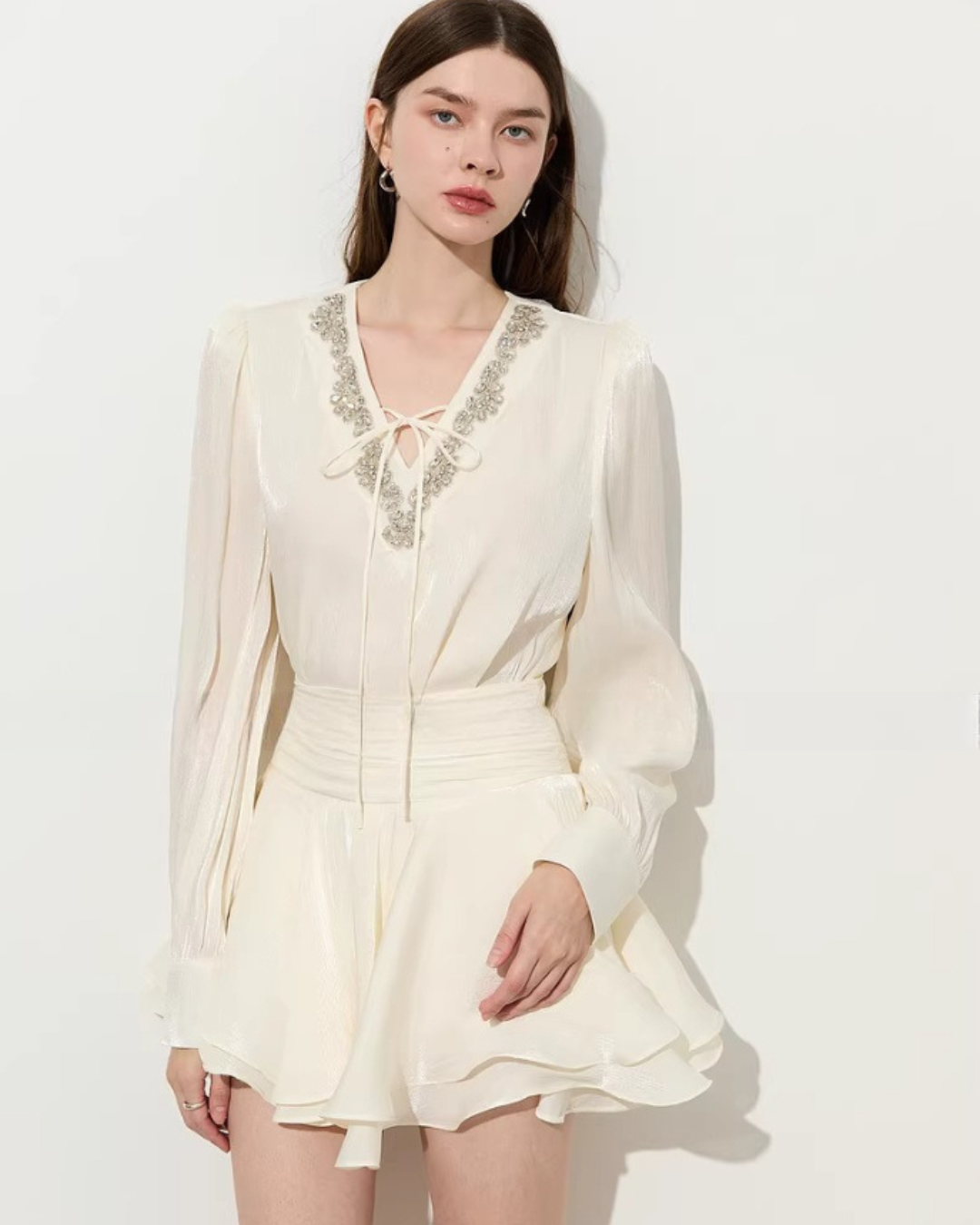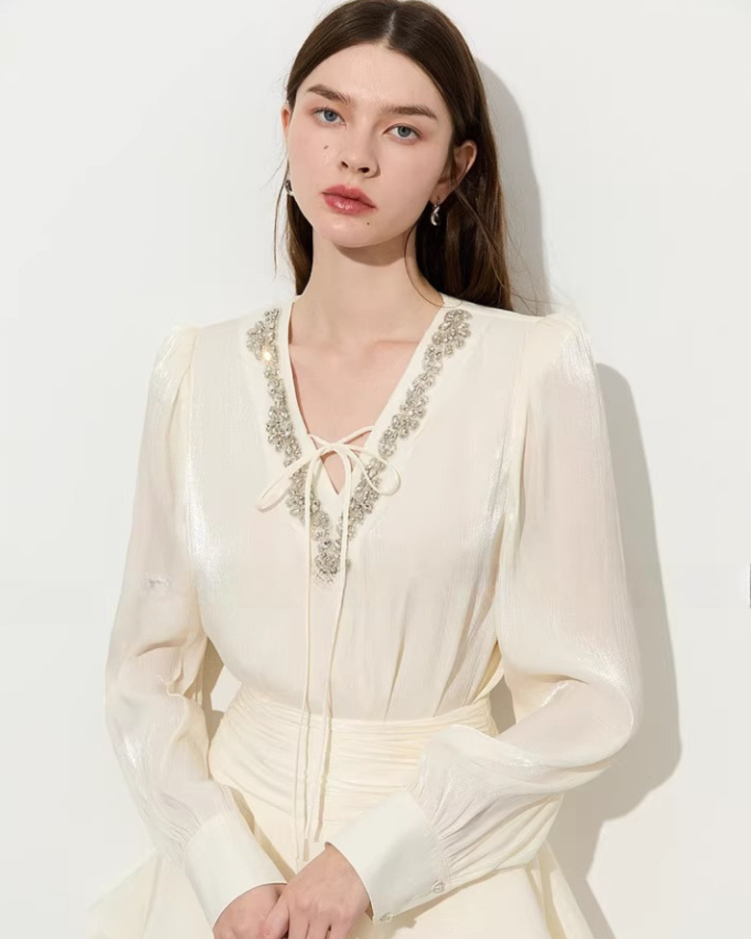 The top is adorned with beads at the chest, creating a glamorous look around the face.