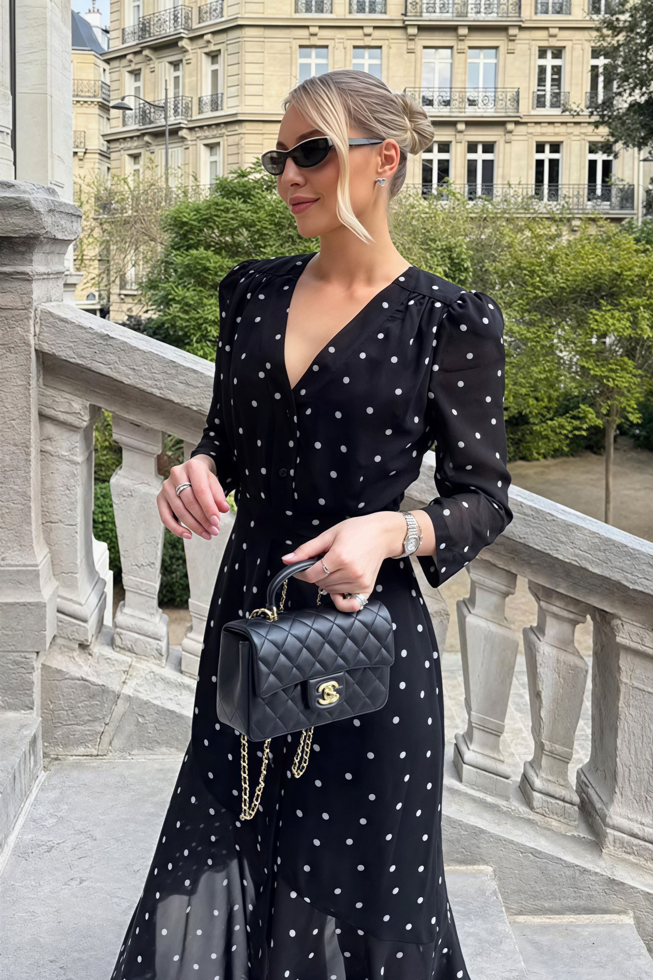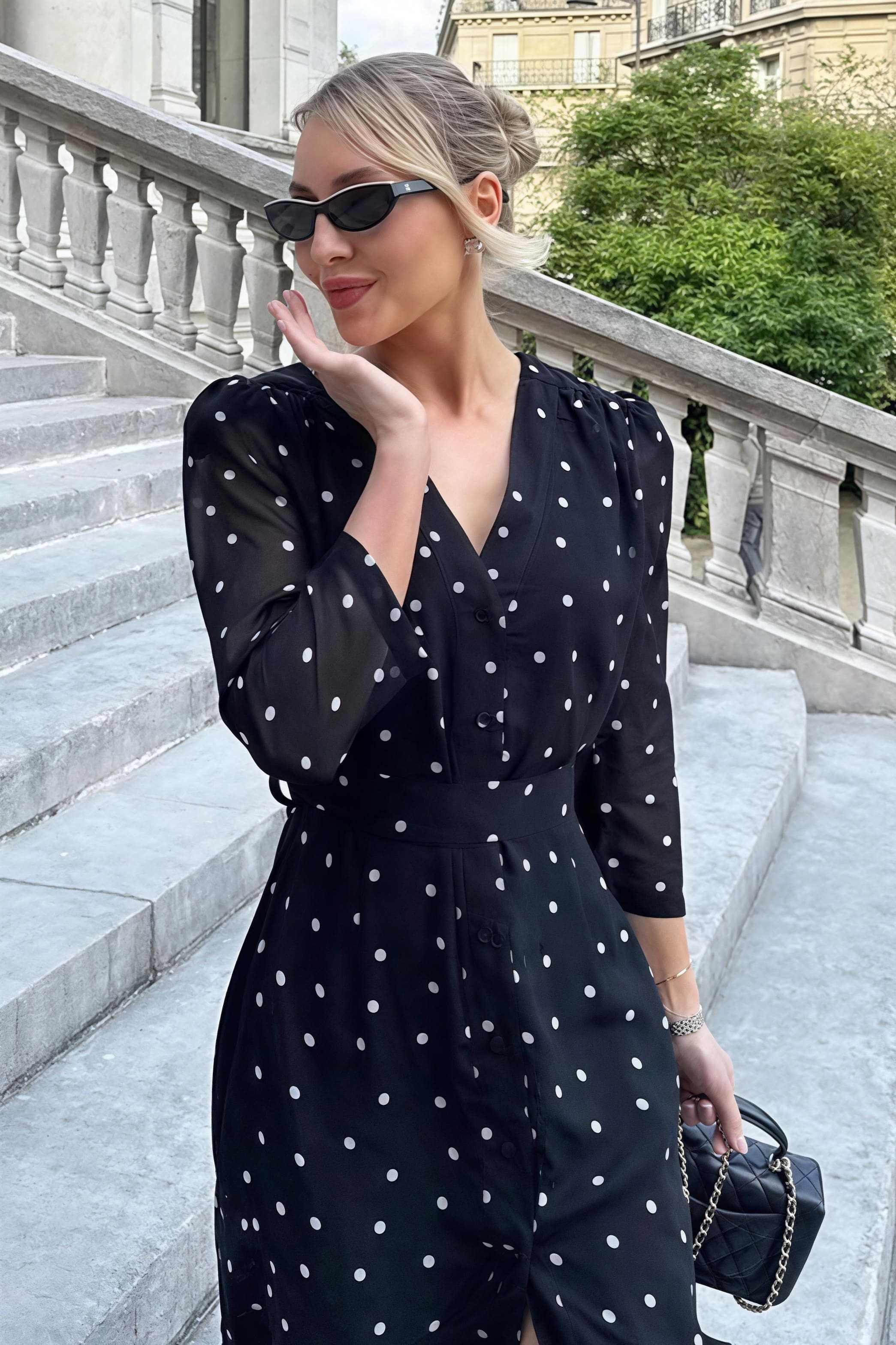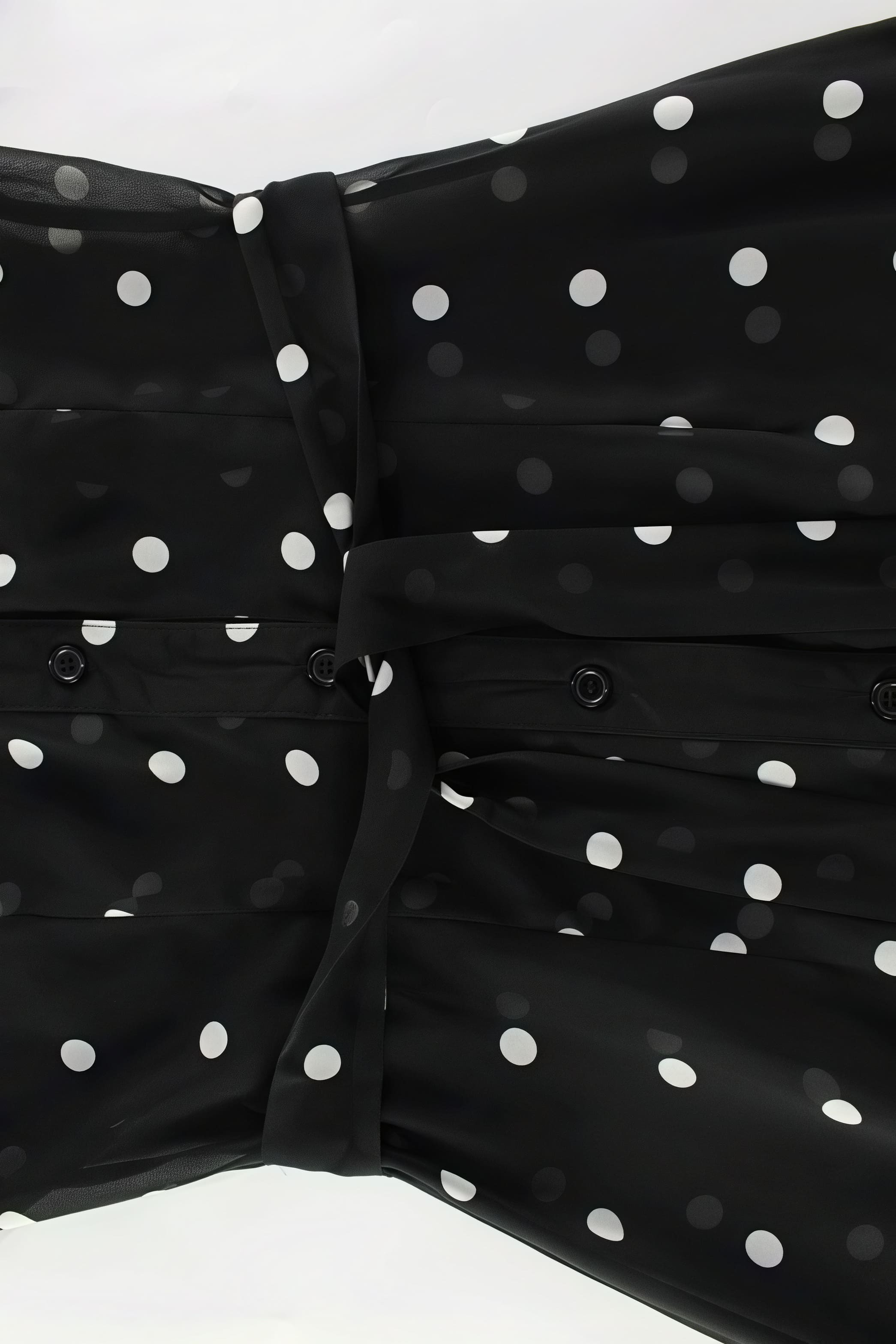 V Neck Waist Long Sleeve High Slit Polka Dot Midi Dress