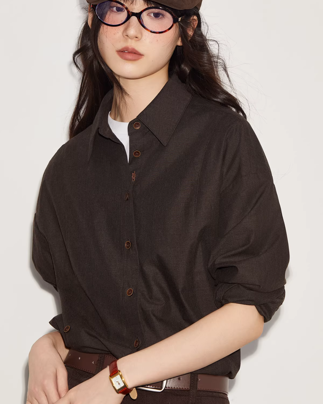 The shirt has a moderately relaxed silhouette, achieving a stylish look.