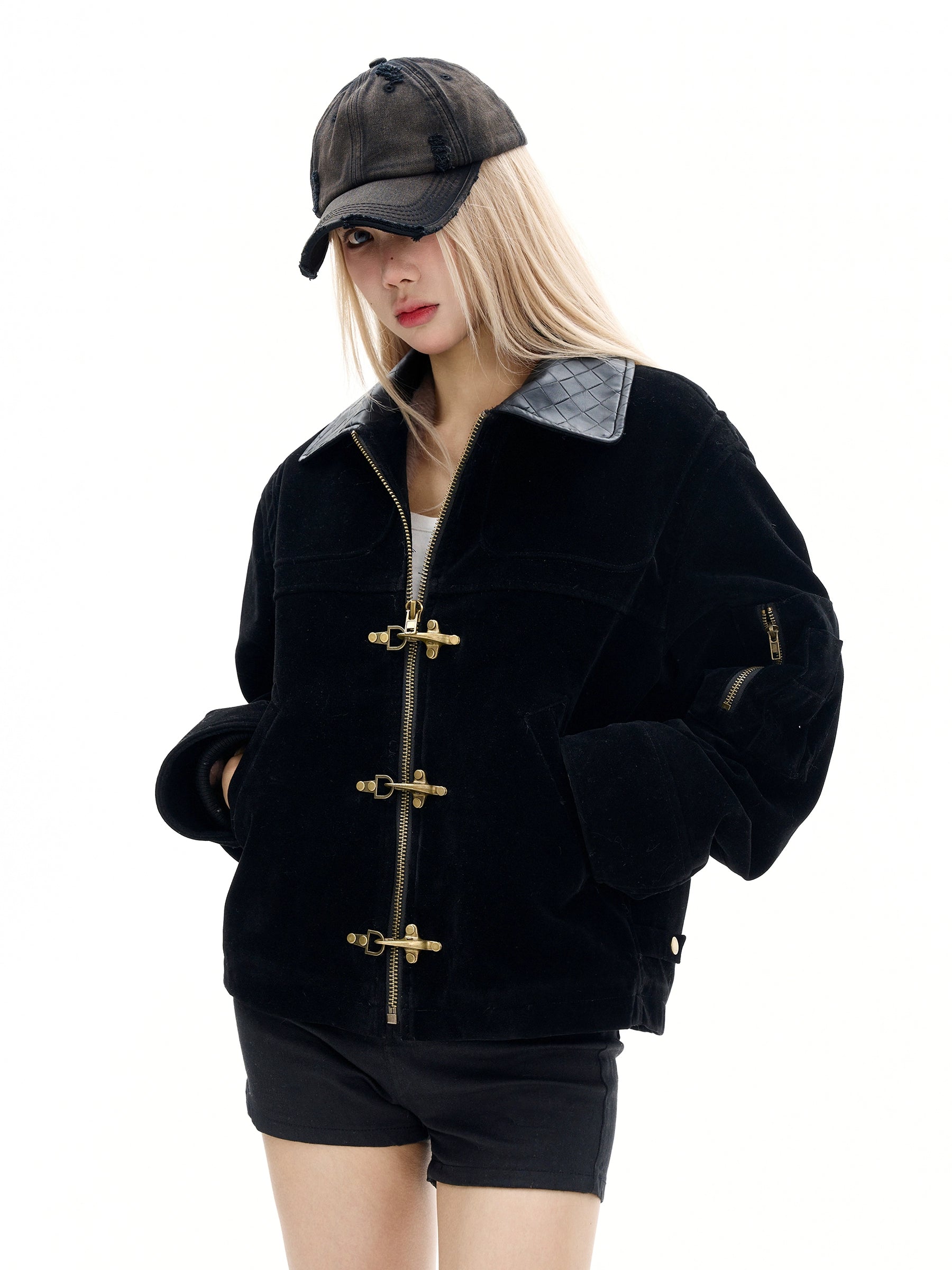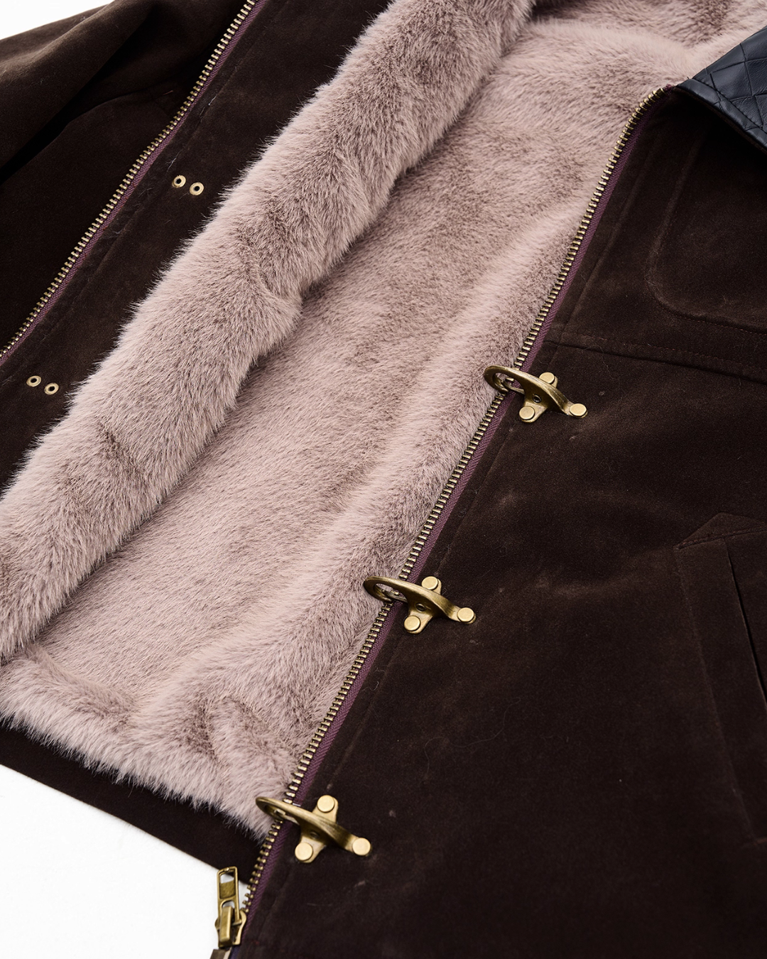 A jacket made of suede material that creates a vintage-like atmosphere.