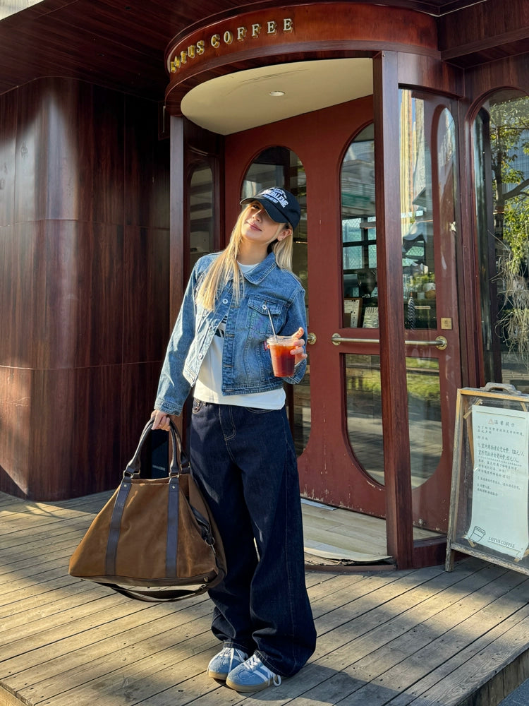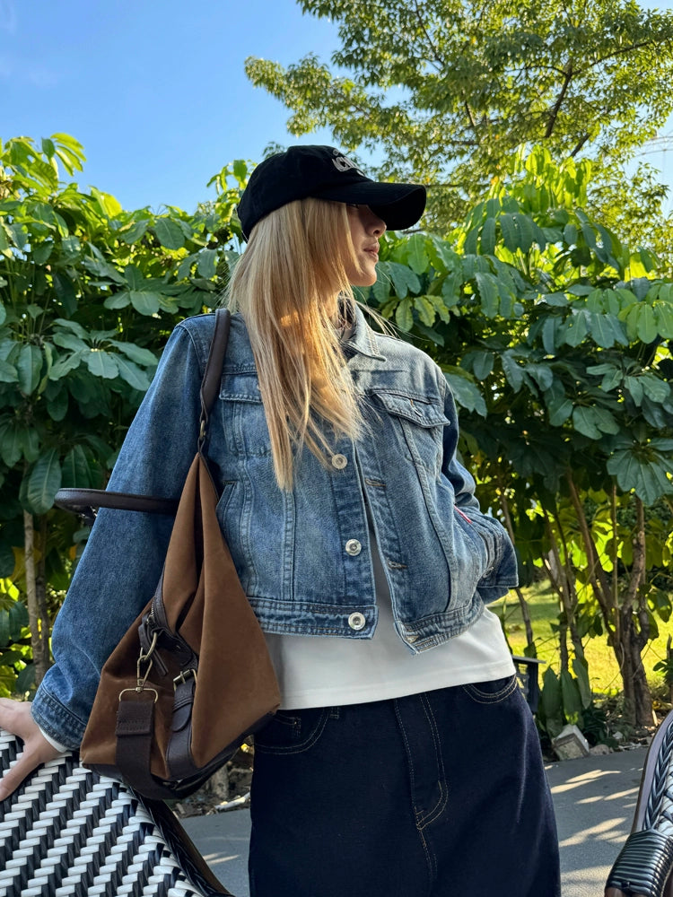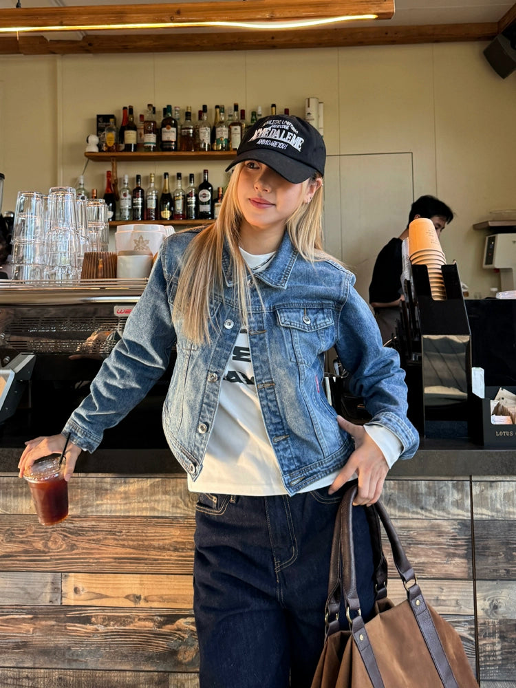 The vintage-style denim jacket with a moderate color fade is full of chicness.