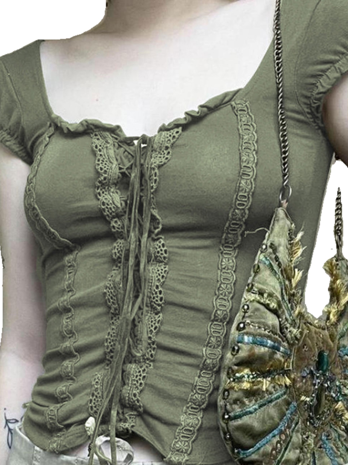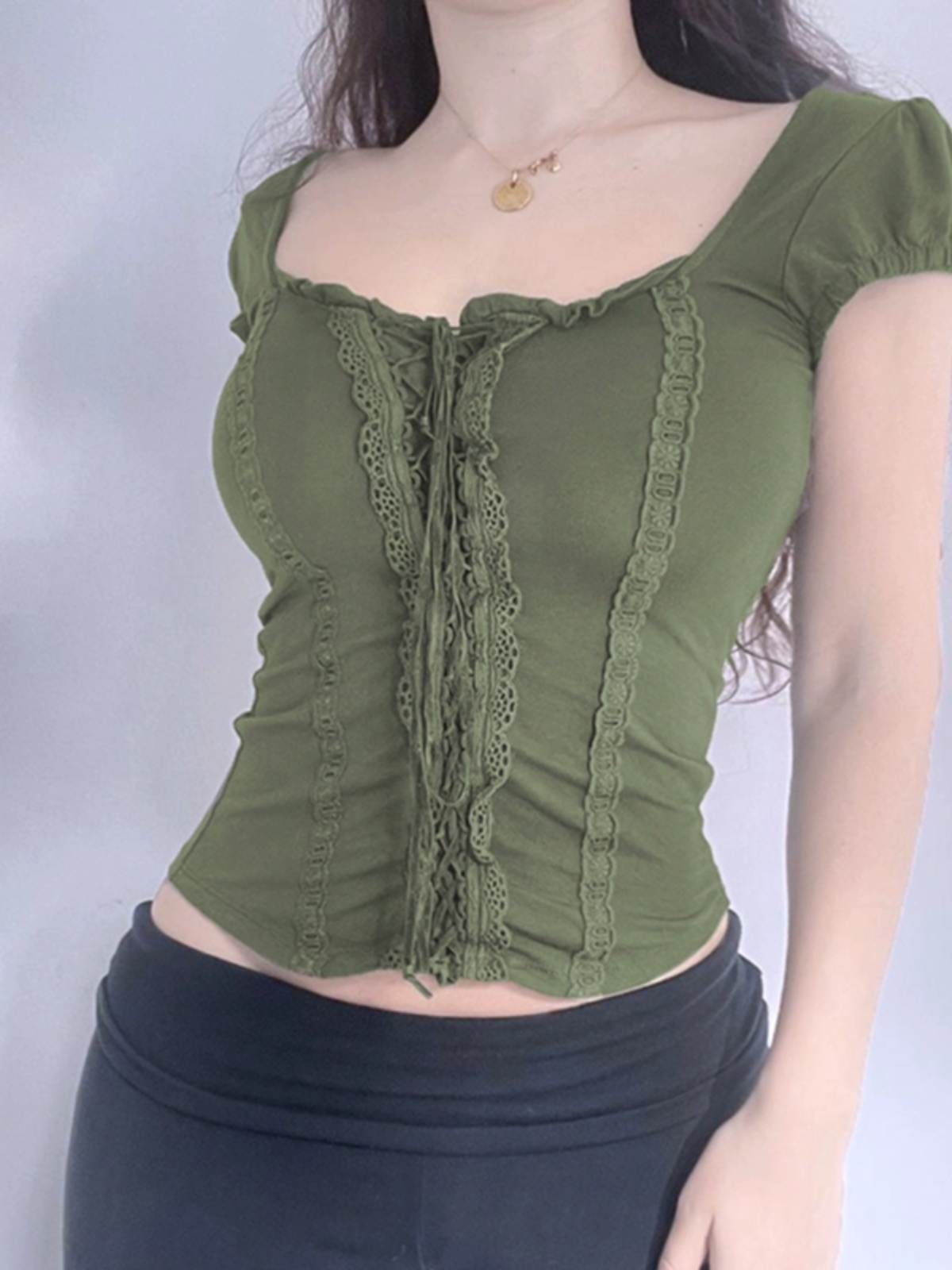 Step into the nostalgia of Y2K and 90s fashion with our Vintage Forest Style Lace Trim Flutter Sleeve Square Neck T-Shirt. This slim fit, versatile tie top features delicate lace trim and flutter sleeves that add a feminine touch, making it perfect for casual outings or dressy occasions alike. Elevate your wardrobe with this effortlessly chic piece that pairs beautifully with high-waisted jeans or a flowy skirt. Don’t miss out on this essential addition add it to your cart today!