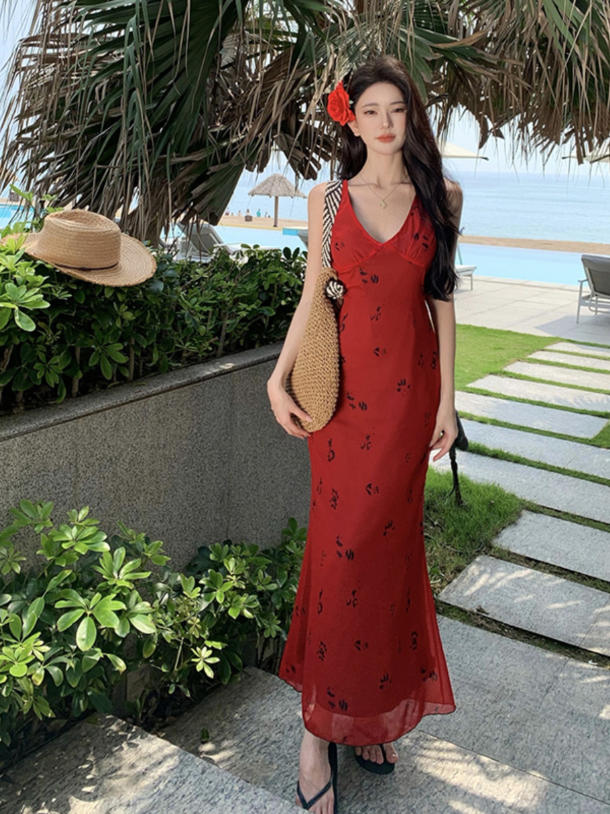 Vintage Printed Long Dress Red Deep V- Neck Fitted Summer Dress High-quality product featuring graduation dress, thanksgiving dress, fall fits and more. Modern design that fits the latest trends. Premium materials ensure durability and comfort. Order now for special offers! Product designed with attention to every detail. Suitable for all occasions and personal styles.