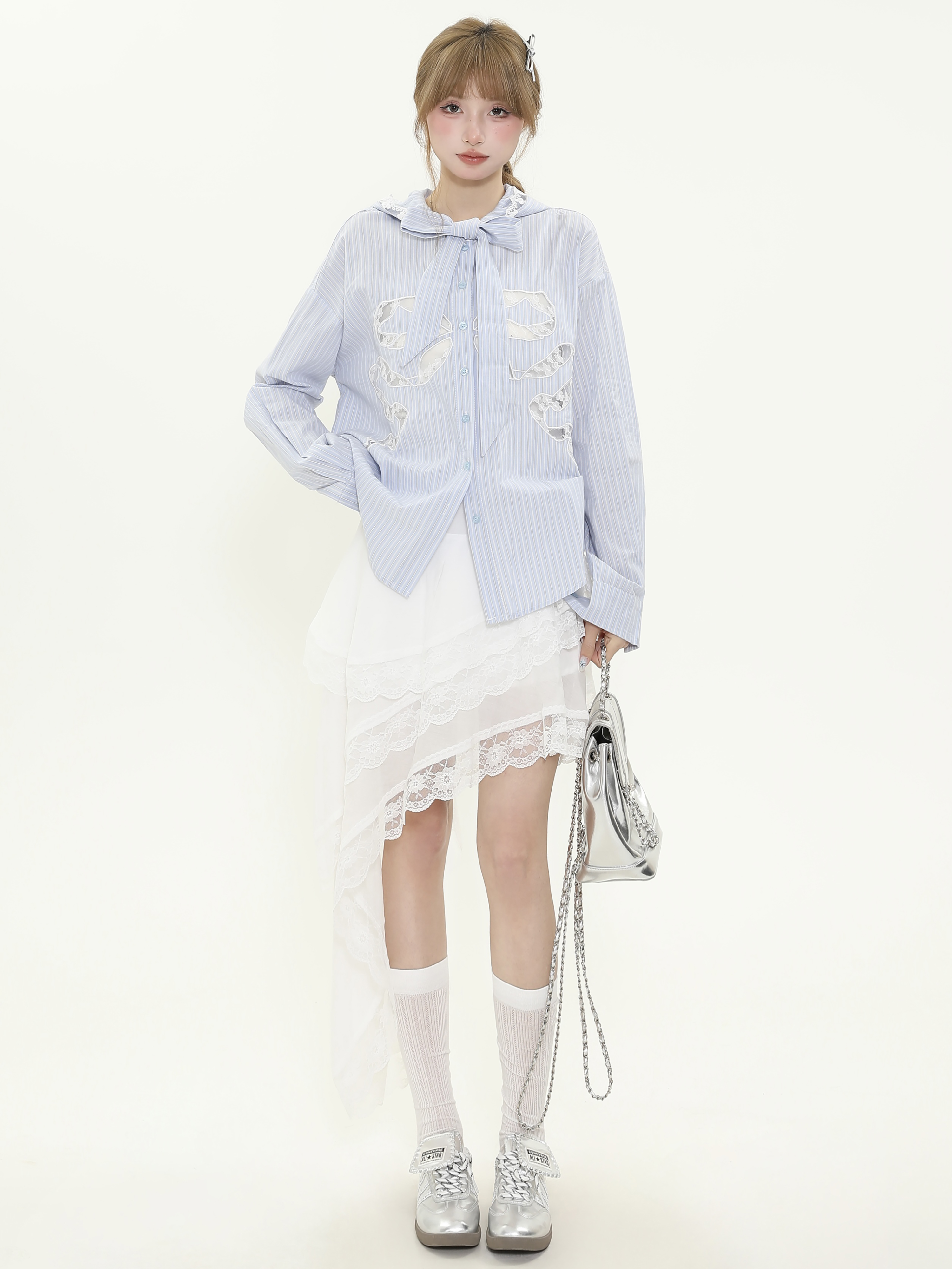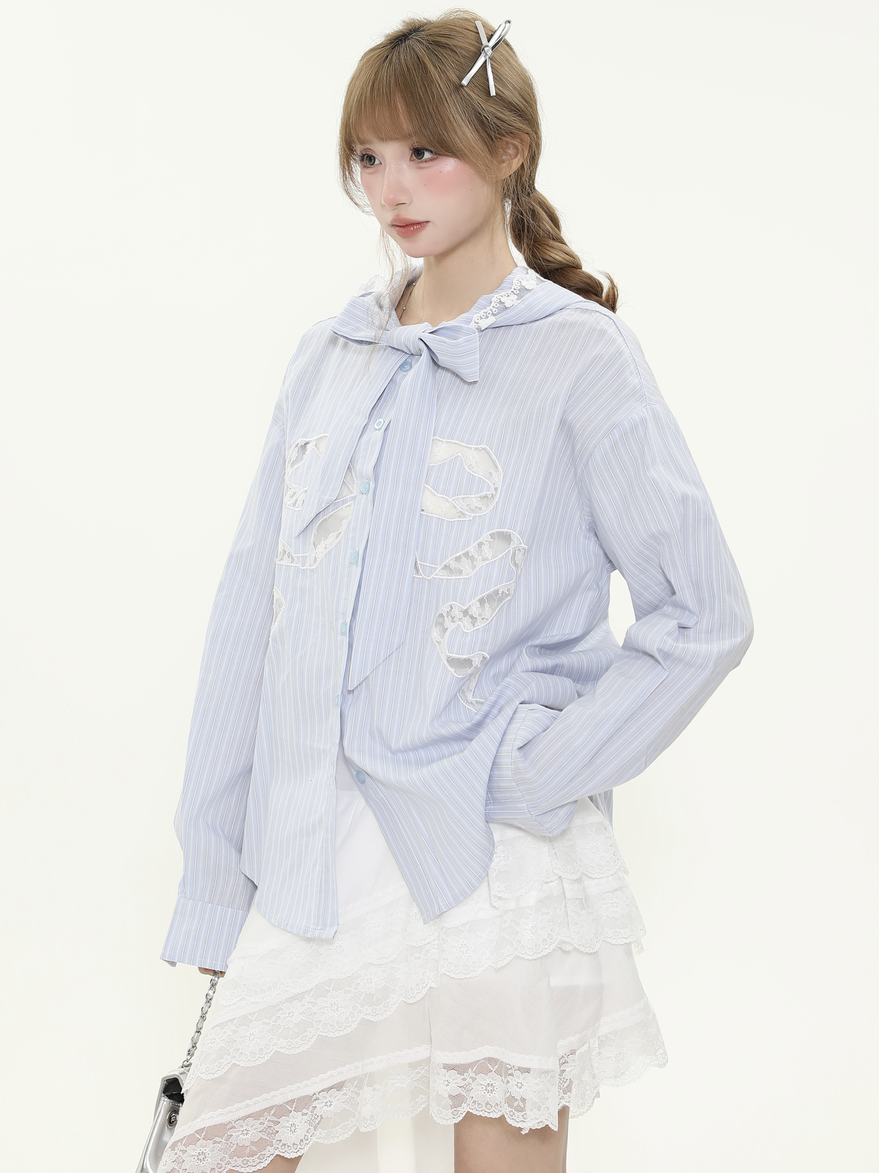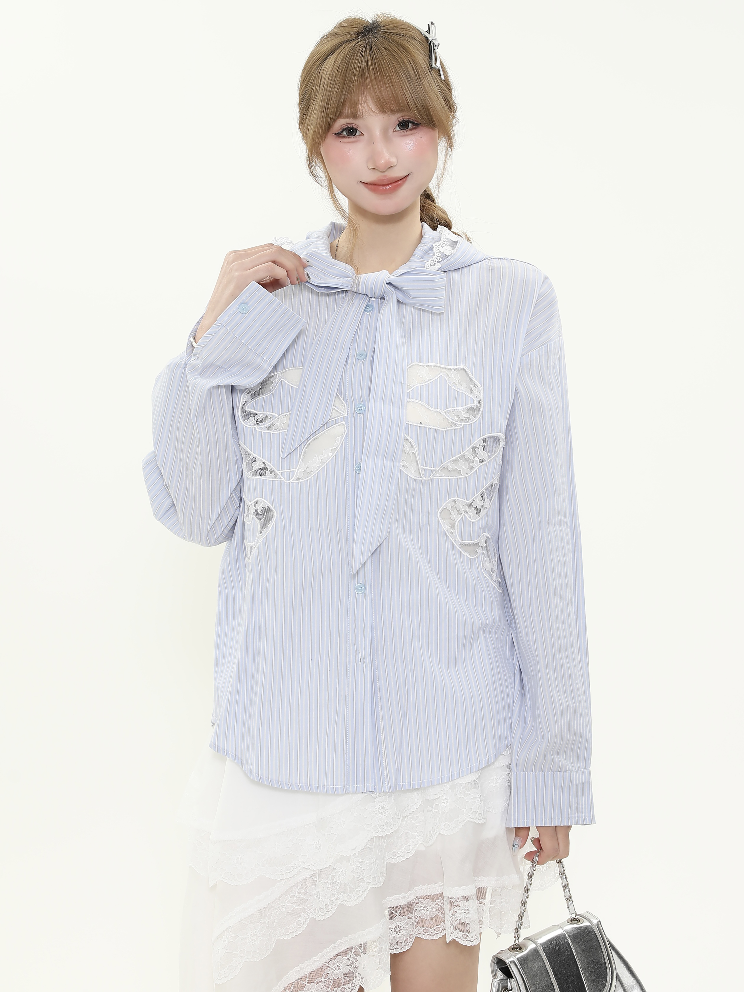 Vintage Hollow Lace Bow Blue Striped Shirt Women Spring Tie JacketRetro High-quality product featuring spring outfits, fashion outfits, graduation dress and more. Modern design that fits the latest trends. Premium materials ensure durability and comfort. Order now for special offers! Product designed with attention to every detail. Suitable for all occasions and personal styles.