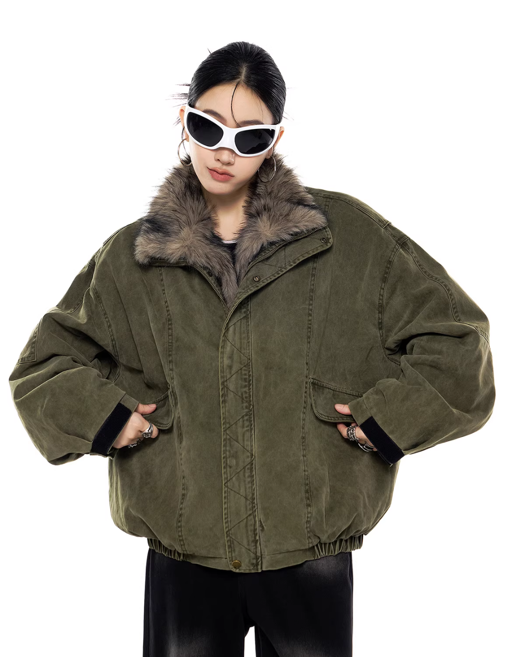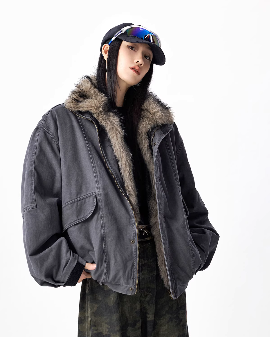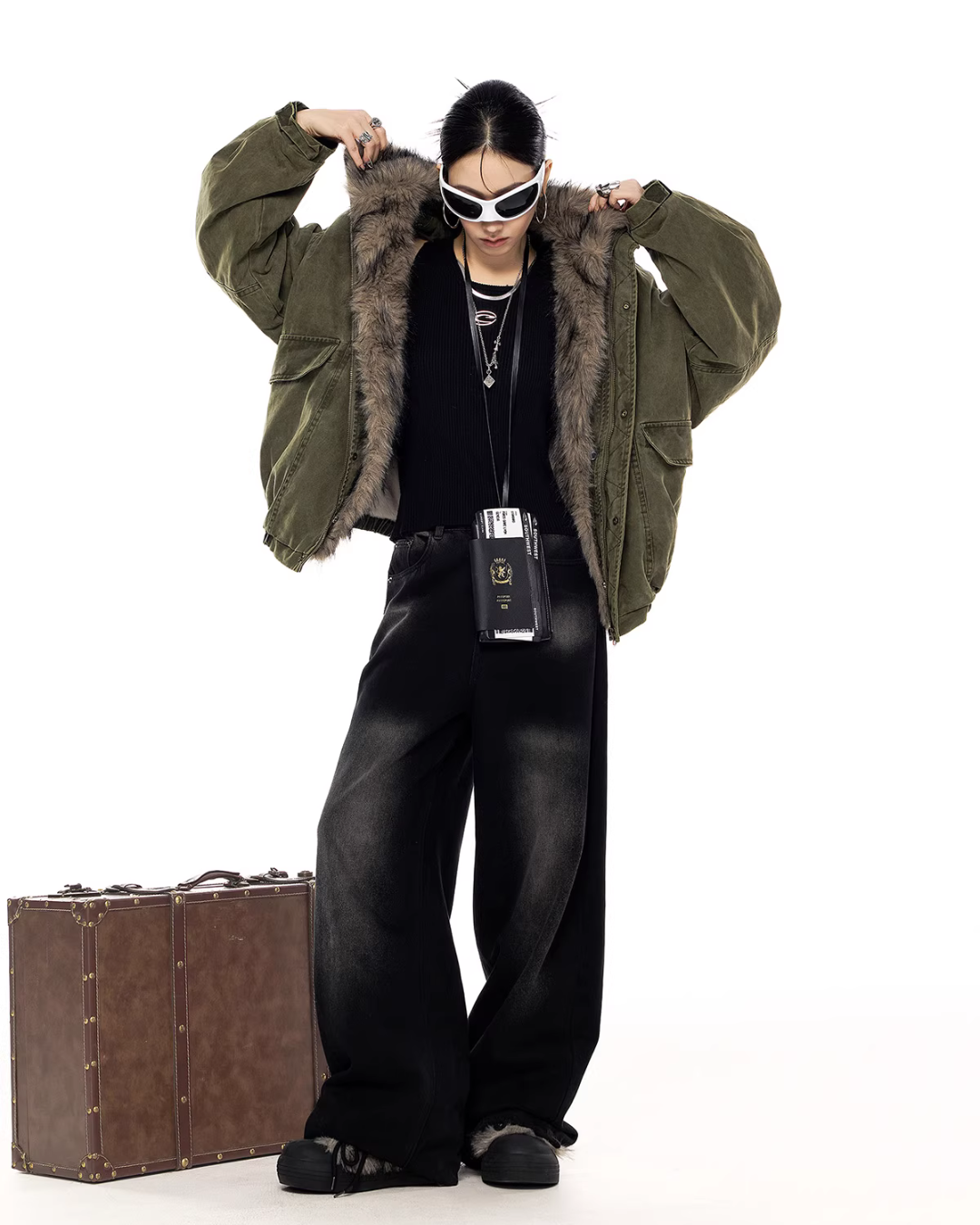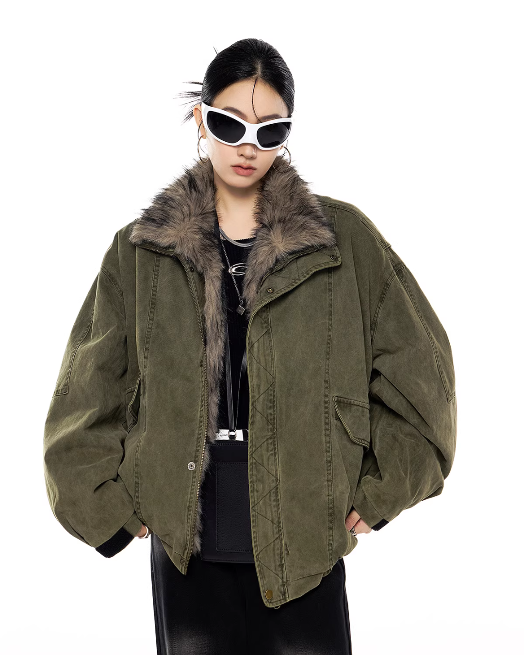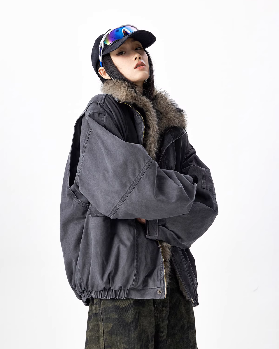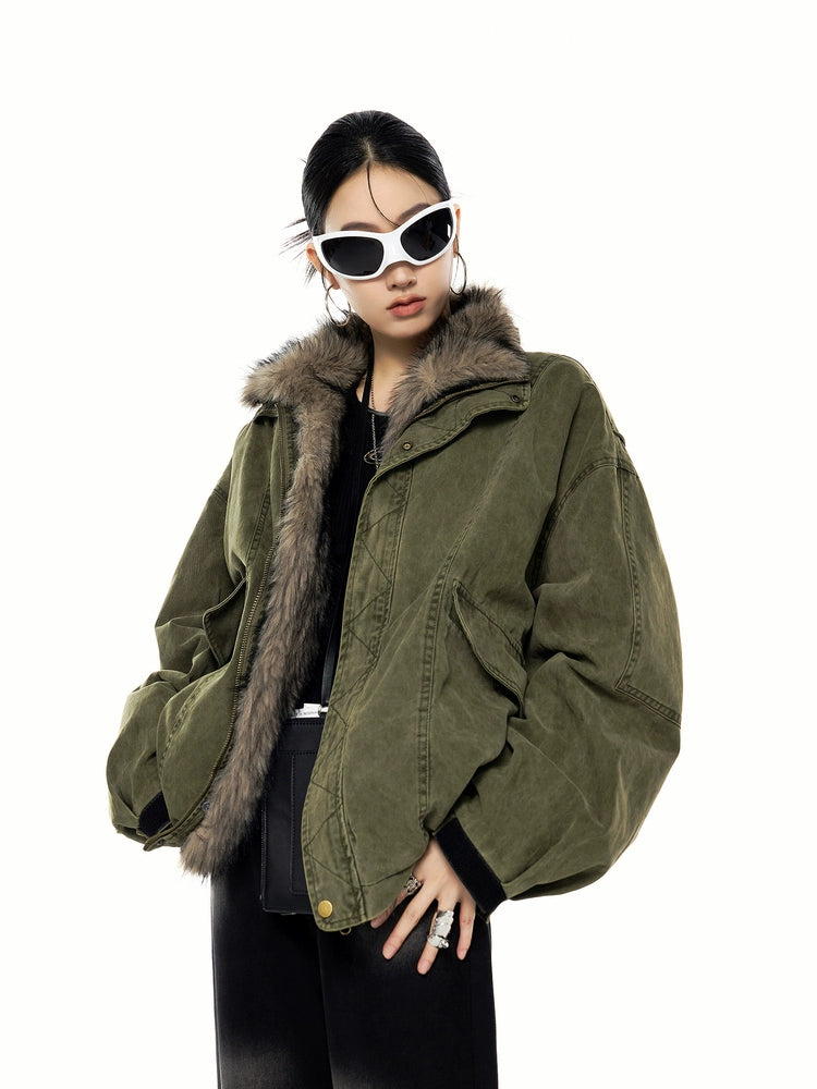 The oversized jacket with a vintage-like texture is attractive.