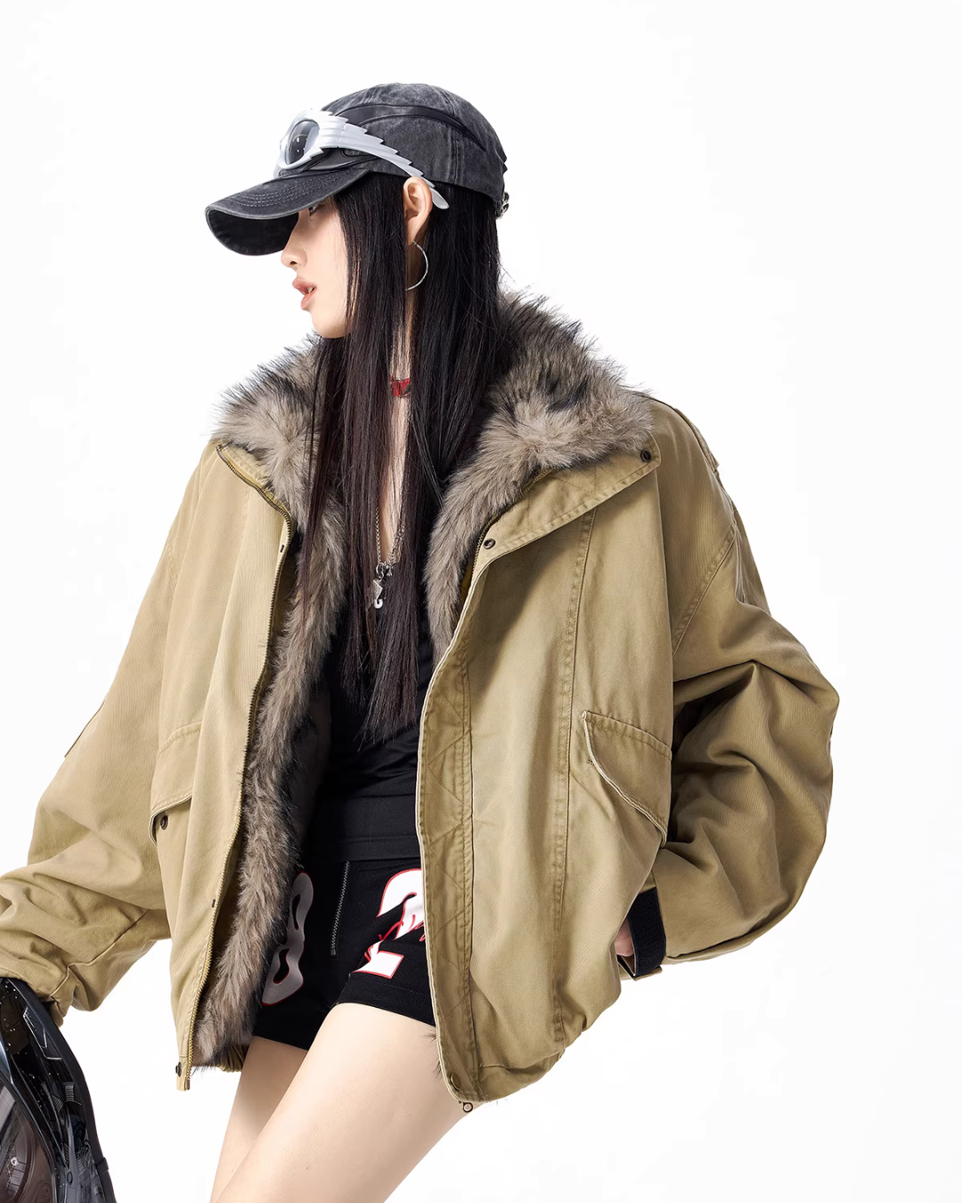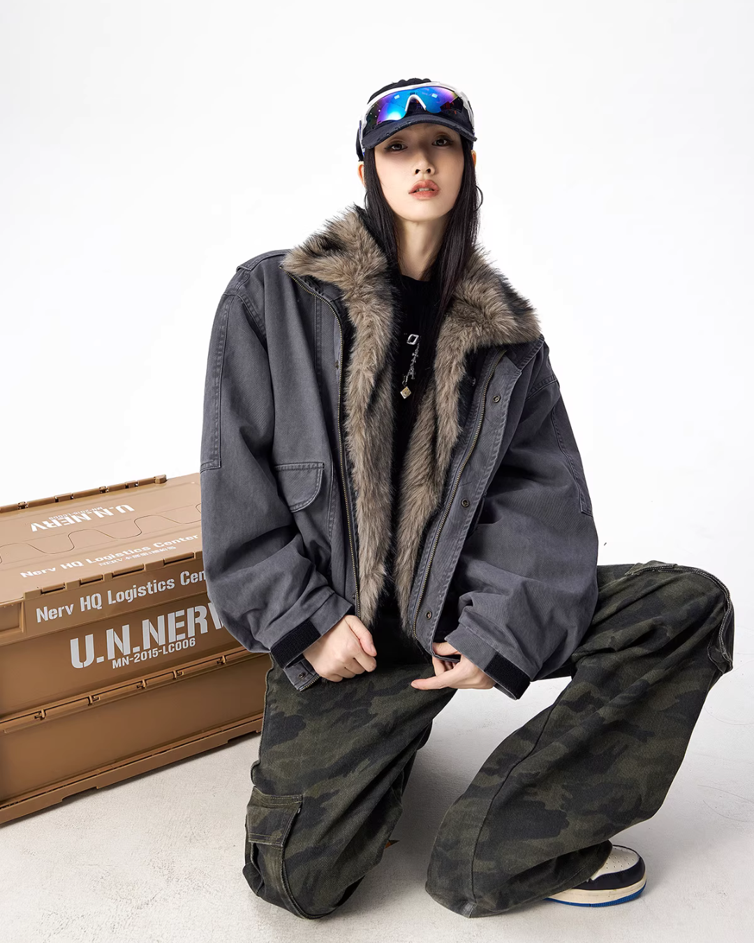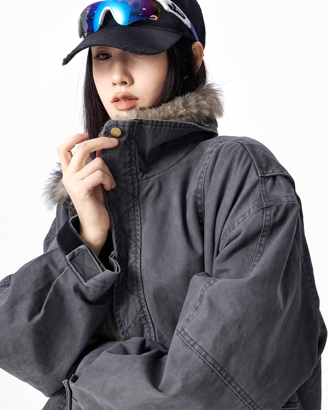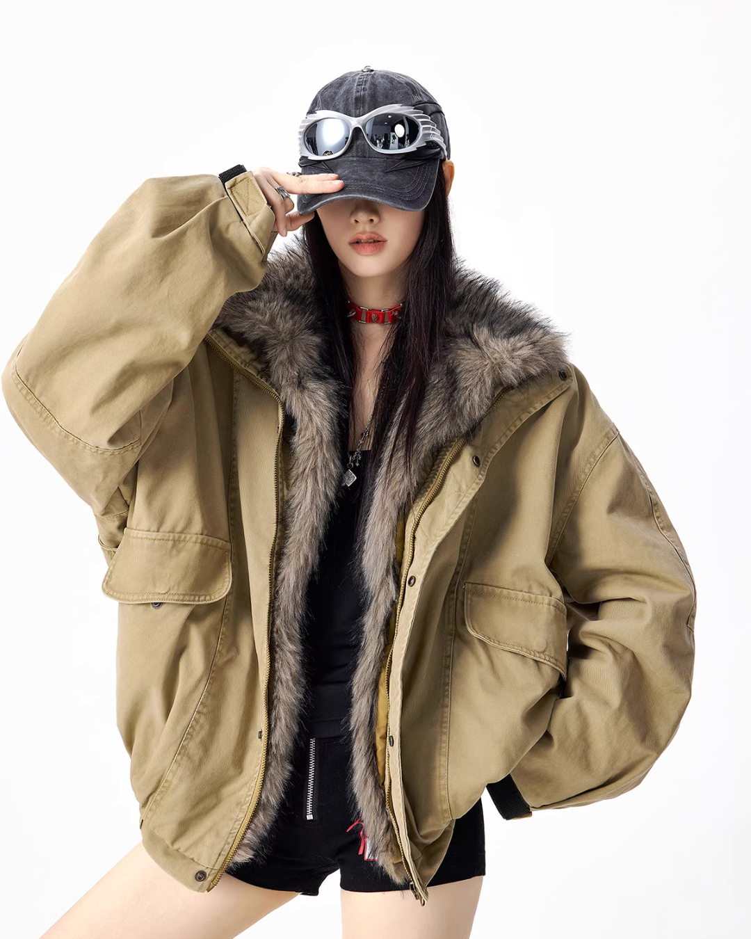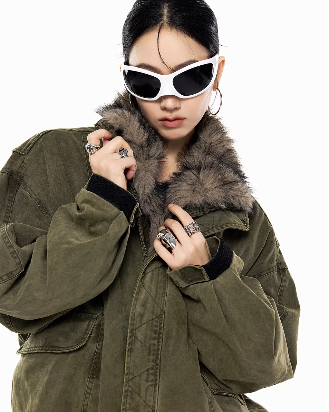 The oversized jacket with a vintage-like texture is attractive.