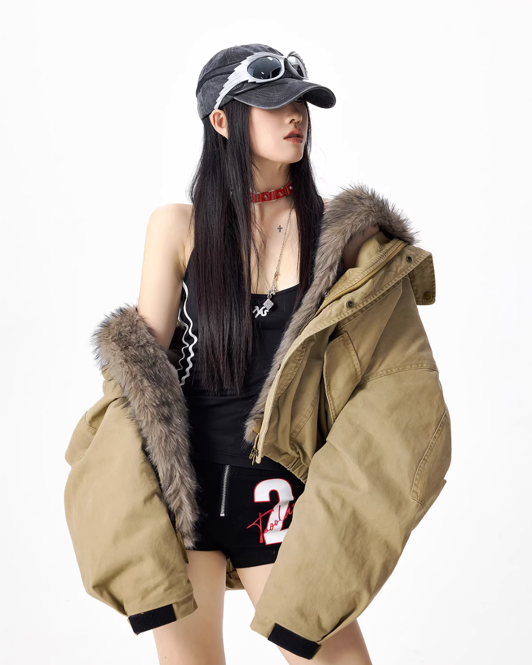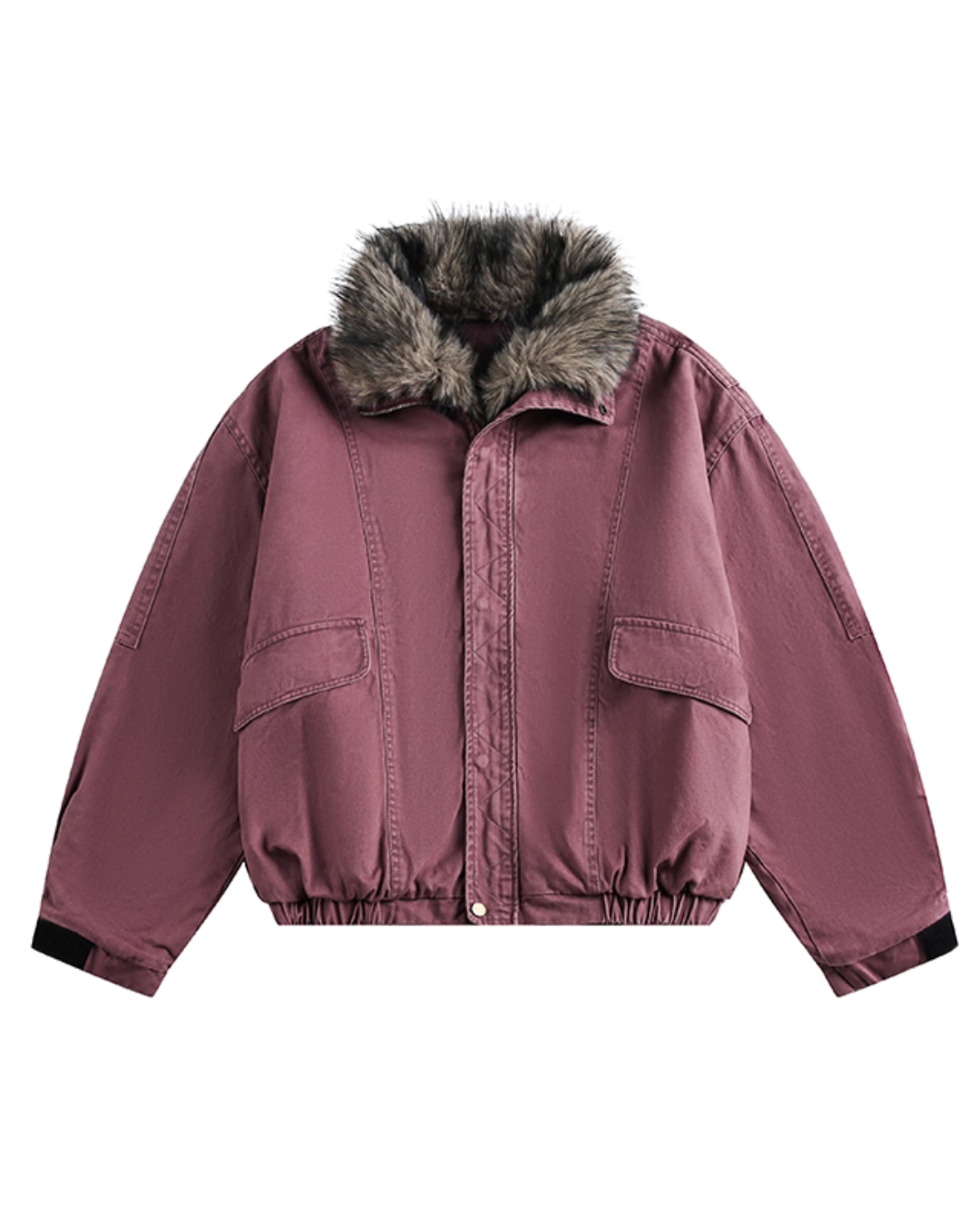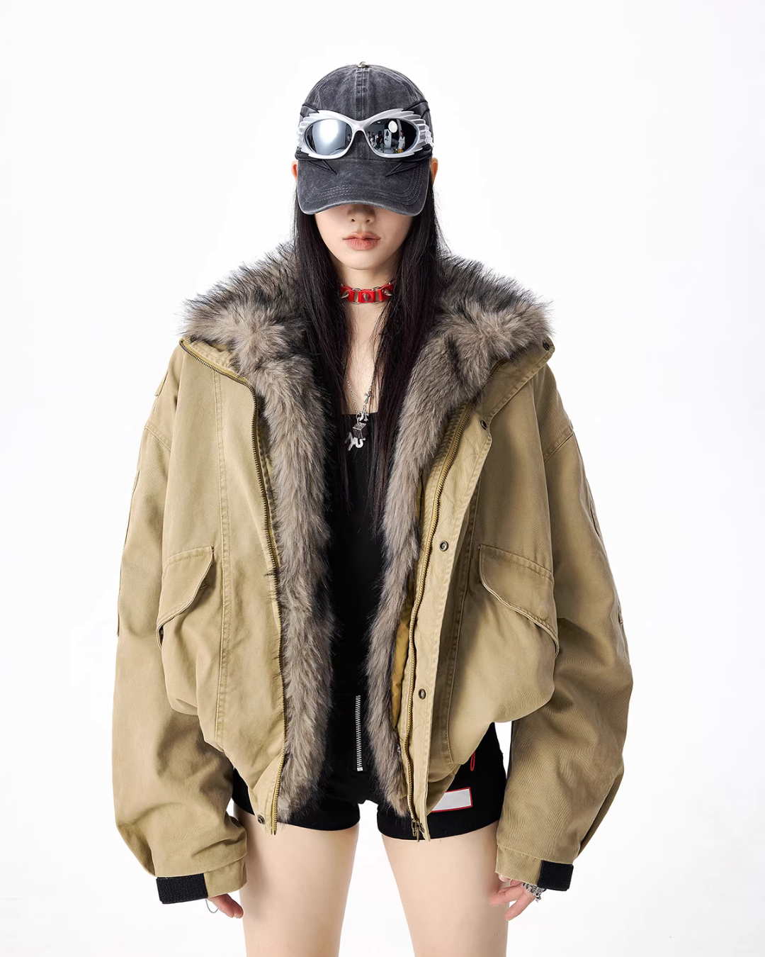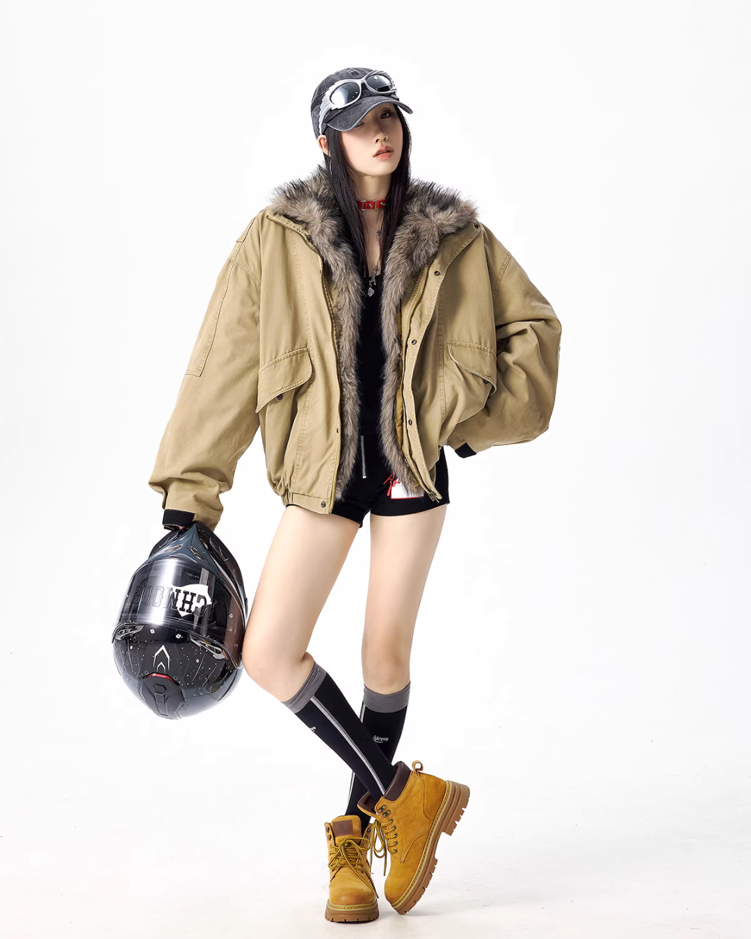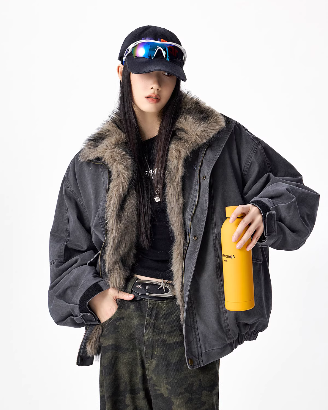 The oversized jacket with a vintage-like texture is attractive.
