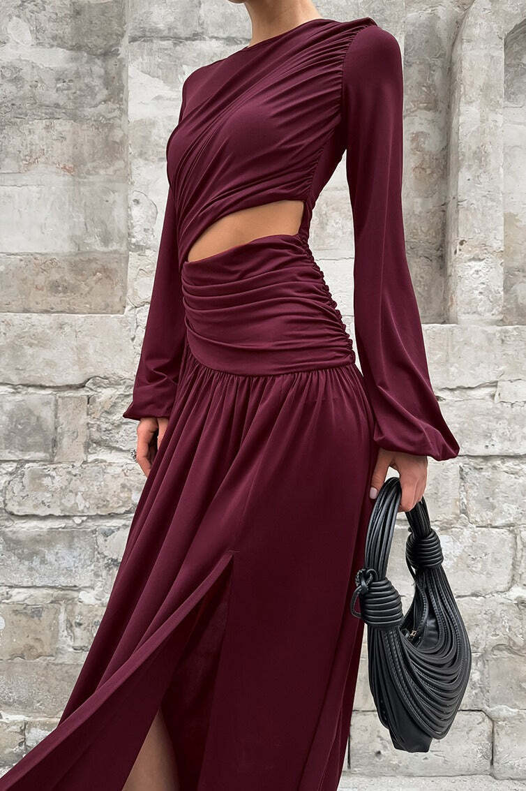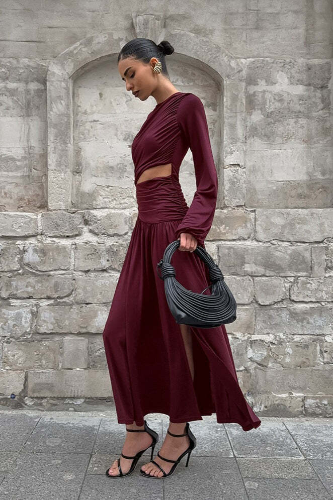 Vintage Round Neck Long Sleeve Cutout Maxi Dress