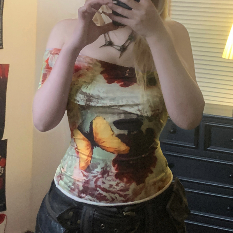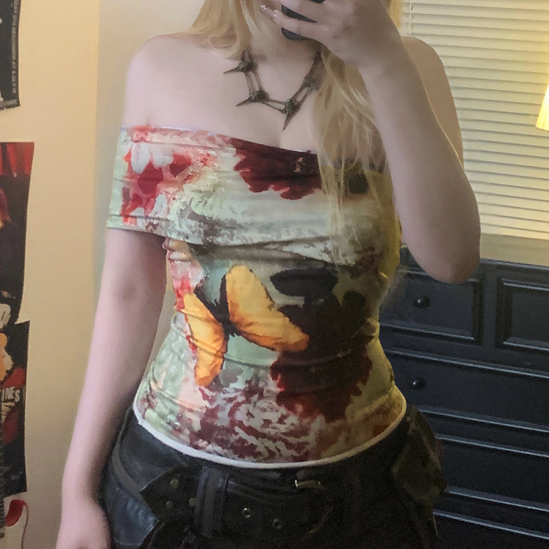 Vintage Tie Dye Floral Print Off Shoulder Slim Fit Shoulder Baring Top Y2K, Boho High-quality product featuring fall fits, spring outfit, hoco dresses and more. Modern design that fits the latest trends. Premium materials ensure durability and comfort. Order now for special offers! Product designed with attention to every detail. Suitable for all occasions and personal styles.