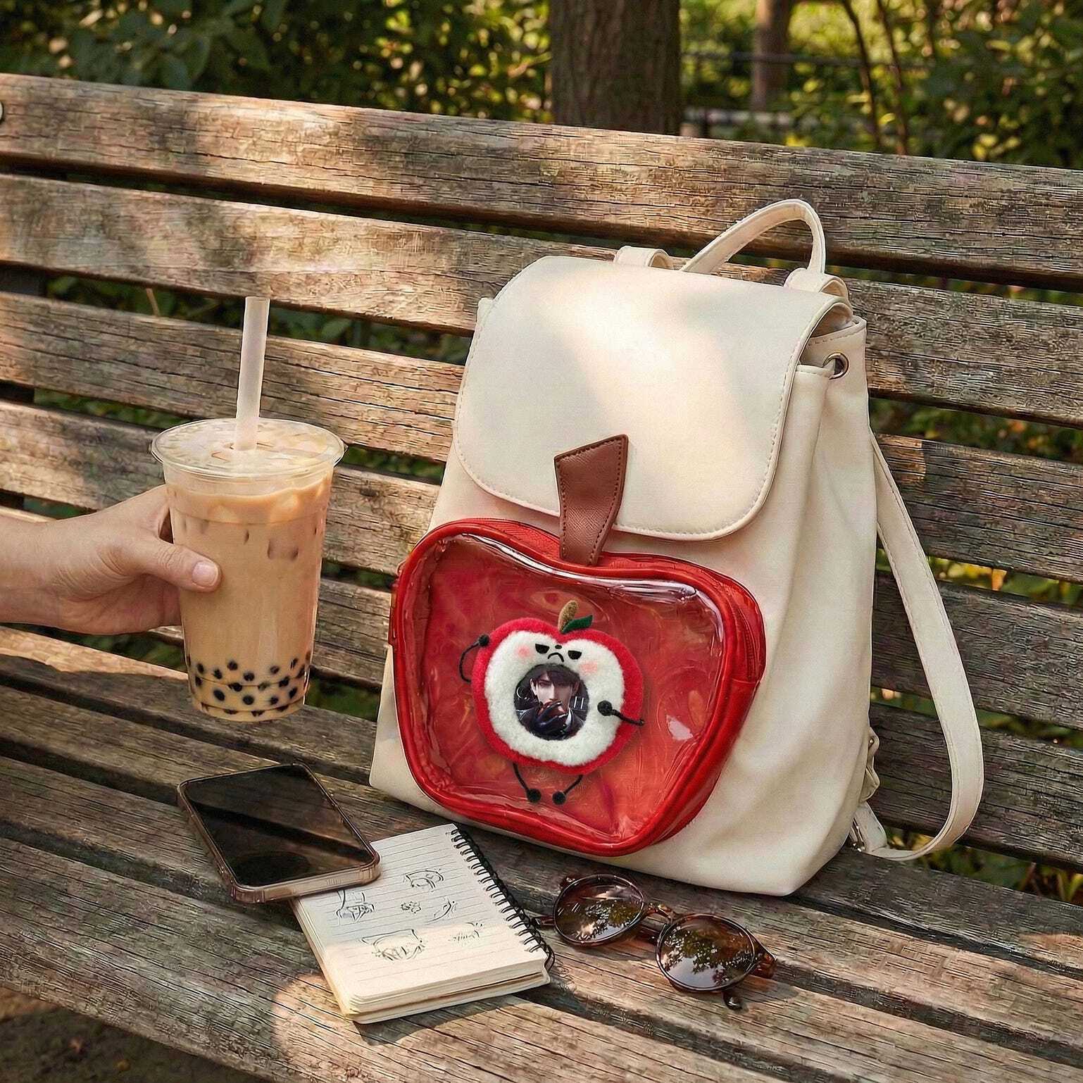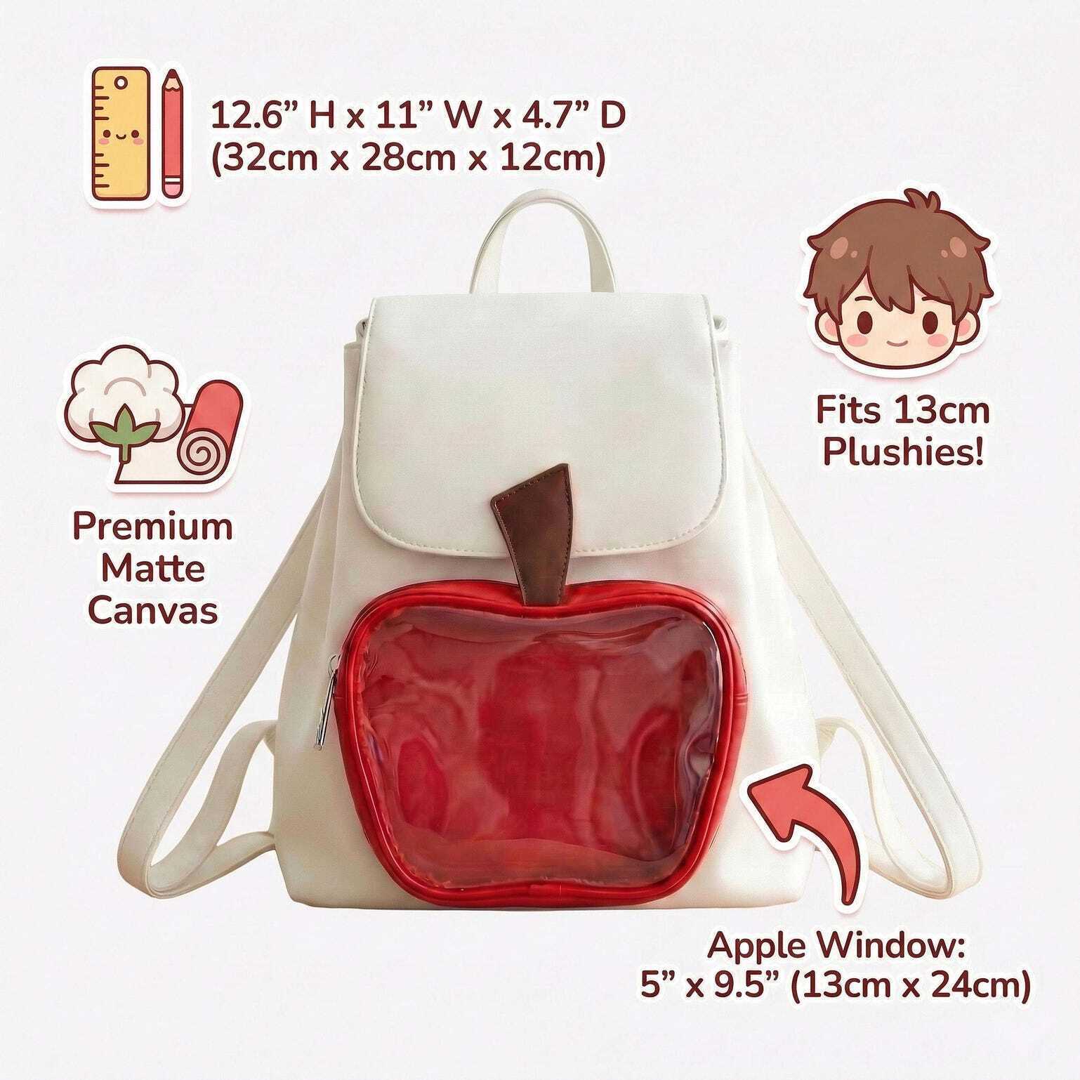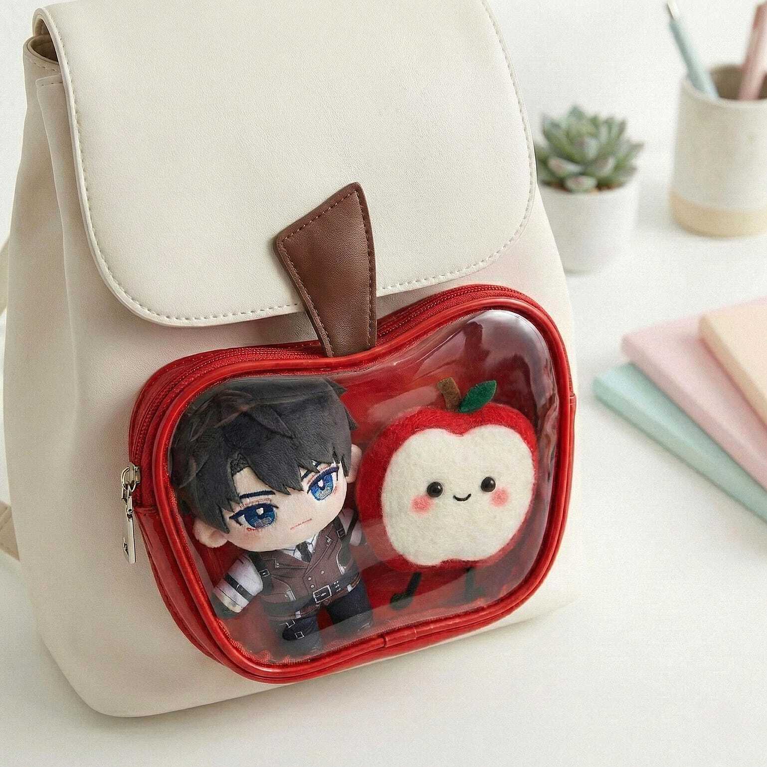 White Apple Ita Backpack with Clear Window for Plushies and Pins is designed to display plushies, dolls, pins, and badges while keeping everyday essentials organized.